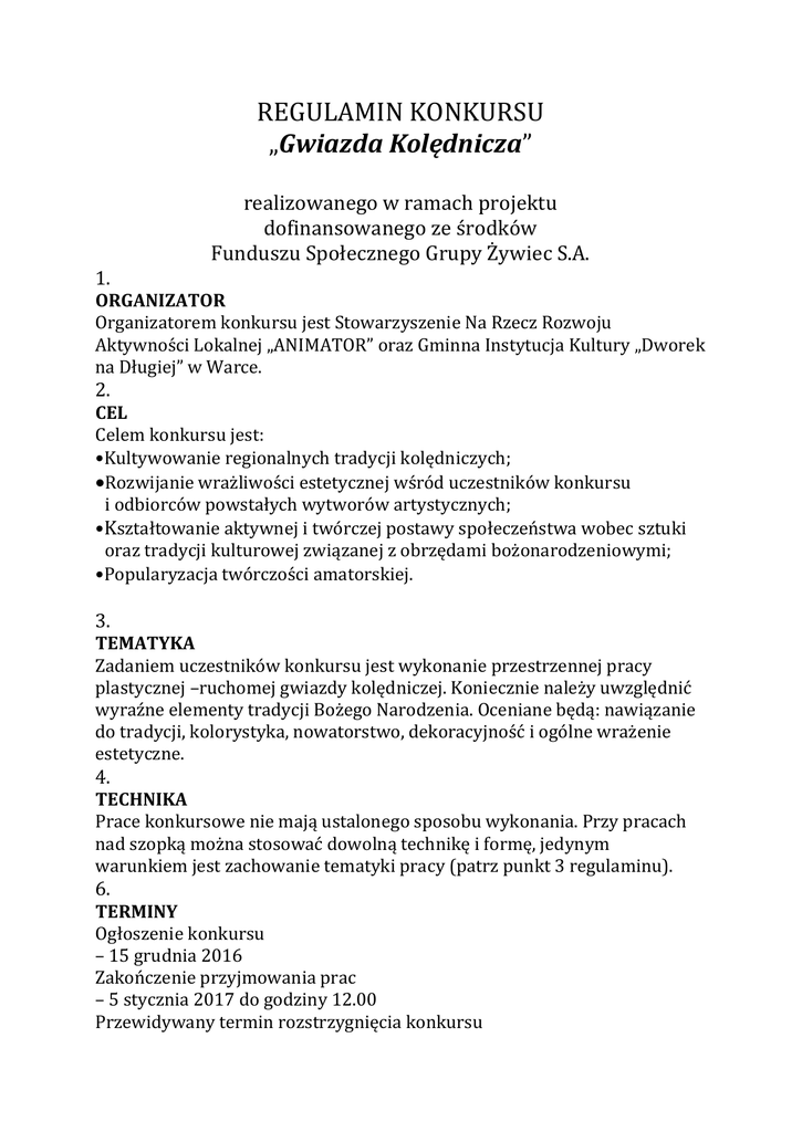 REGULAMIN KONKURSU „Gwiazda Kolędnicza” realizowanego w ramach projektu dofinansowanego ze środków Funduszu Społecznego Grupy Żywiec S.A. 1. ORGANIZATOR Organizatorem konkursu jest Stowarzyszenie Na Rzecz Rozwoju Aktywności Lokalnej „ANIMATOR” oraz Gminna Instytucja Kultury „Dworek na Długiej” w Warce. 2. CEL Celem konkursu jest: •Kultywowanie regionalnych tradycji kolędniczych; Rozwijanie wrażliwości estetycznej wśród uczestników konkursu i odbiorców powstałych wytworów artystycznych; •Kształtowanie aktywnej i twórczej postawy społeczeństwa wobec sztuki oraz tradycji kulturowej związanej z obrzędami bożonarodzeniowymi; •Popularyzacja twórczości amatorskiej. 3. TEMATYKA Zadaniem uczestników konkursu jest wykonanie przestrzennej pracy plastycznej –ruchomej gwiazdy kolędniczej. Koniecznie należy uwzględnić wyraźne elementy tradycji Bożego Narodzenia. Oceniane będą: nawiązanie do tradycji, kolorystyka, nowatorstwo, dekoracyjność i ogólne wrażenie estetyczne. 4. TECHNIKA Prace konkursowe nie mają ustalonego sposobu wykonania. Przy pracach nad szopką można stosować dowolną technikę i formę, jedynym warunkiem jest zachowanie tematyki pracy (patrz punkt 3 regulaminu). 6. TERMINY Ogłoszenie konkursu – 15 grudnia 2016 Zakończenie przyjmowania prac – 5 stycznia 2017 do godziny 12.00 Przewidywany termin rozstrzygnięcia konkursu – 6 stycznia 2016r. Termin wręczenia nagród, prezentacji gwiazd – 6 stycznia 2017r. przed rozpoczęciem Wareckiego Orszaku Trzech Króli, 7. WARUNKI UCZESTNICTWA W konkursie mogą brać udział zarówno grupy nieformalne jak i reprezentujące organizacje lub instytucje działające na terenie gminy Warka. Istnieje możliwość tworzenia prac indywidualnie, jednak ocena takich prac będzie odbywać się na takich samych zasadach jak prac zespołowych. Uczestnicy konkursu muszą: 1. być mieszkańcami gminy Warka; 2. autorami zgłoszonych prac; 3. opatrzeć pracę metryczką zawierającą: imiona i nazwiska autorów, i kontakt telefoniczny do lidera zespołu 4. złożyć prace w terminie przewidzianym w regulaminie; Uczestnicy konkursu składając prace wyrażają zgodę na prezentację pracy podczas Wareckiego Orszaku Trzech Króli. 8. DOSTARCZENIE PRAC Prace konkursowe należy dostarczyć do siedziby Gminnej Instytucji Kultury „Dworek na Długiej” w Warce w przewidzianym w regulaminie terminie. Decyduje termin fizycznego dostarczenia prac. 9. WYBÓR ZWYCIĘZCÓW Zgłoszone do konkursu prace oceniane będą przez komisję konkursową, której członków wybierze Organizator i która składać się będzie z 3 - 5 członków - ludzi związanych z plastyką i innymi dziedzinami sztuki. Oceniać będą oni wartości artystyczne prac, profesjonalizm wykonania, nawiązanie do tradycji, ciekawy pomysł. 10. NAGRODY W konkursie dla zwycięzców przewidziane są nagrody rzeczowe oraz dyplomy. Dodatkową nagrodą w konkursie będzie prezentacja zwycięskich gwiazd podczas Wareckiego Orszaku Trzech Króli. 11. POSTANOWIENIA OGÓLNE 1. Uczestnik konkursu zezwala na wykorzystanie i przetwarzanie w bazie danych Konkursu informacji osobowych zawartych na metryczce każdej z prac. 2. Uczestnik wyraża zgodę na wykorzystanie przez organizatora materiałów dostarczonych do konkursu do działań informacyjno-promocyjnych. 3. Sprawy nie ujęte w regulaminie rozstrzyga organizator. 4. Organizatorzy zastrzegają sobie prawo zmian w regulaminie, jeżeli nastąpi taka konieczność i prawo ostatecznej interpretacji powyższego regulaminu.