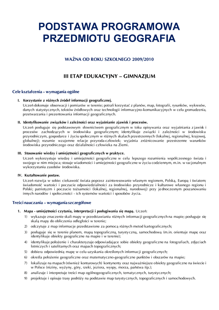 PODSTAWA PROGRAMOWA PRZEDMIOTU GEOGRAFIA WAŻNA OD ROKU SZKOLNEGO 2009/2010 III ETAP EDUKACYJNY – GIMNAZJUM Cele kształcenia – wymagania ogólne I. Korzystanie z różnych źródeł informacji geograficznej. Uczeń dokonuje obserwacji i pomiarów w terenie; potrafi korzystać z planów, map, fotografii, rysunków, wykresów, danych statystycznych, tekstów źródłowych oraz technologii informacyjno-komunikacyjnych w celu gromadzenia, przetwarzania i prezentowania informacji geograficznych. II. Identyfikowanie związków i zależności oraz wyjaśnianie zjawisk i procesów. Uczeń posługuje się podstawowym słownictwem geograficznym w toku opisywania oraz wyjaśniania z jawisk i procesów zachodzących w środowisku geograficznym; identyfikuje związki i zależności w środowisk u przyrodniczym, gospodarce i życiu społecznym w różnych skalach przestrzennych (lokalnej, regionalnej, krajowej, globalnej); rozumie wzajemne relacje przyroda-człowiek; wyjaśnia zróżnicowanie przestrzenne warunków środowiska przyrodniczego oraz działalności człowieka na Ziemi. III. Stosowanie wiedzy i umiejętności geograficznych w praktyce. Uczeń wykorzystuje wiedzę i umiejętności geograficzne w celu lepszego rozumienia współczesnego świata i swojego w nim miejsca; stosuje wiadomości i umiejętności geograficzne w życiu codziennym, m.in. w racjonalnym wykorzystaniu zasobów środowiska. IV. Kształtowanie postaw. Uczeń rozwija w sobie: ciekawość świata poprzez zainteresowanie własnym regionem, Polską, Europą i światem; świadomość wartości i poczucie odpowiedzialności za środowisko przyrodnicze i kulturowe własnego regionu i Polski; patriotyzm i poczucie tożsamości (lokalnej, regionalnej, narodowej) przy je dnoczesnym poszanowaniu innych narodów i społeczności - ich systemów wartości i sposobów życia. Treści nauczania – wymagania szczegółowe 1. Mapa - umiejętności czytania, interpretacji i posługiwania się mapą. Uczeń: 1) 2) wykazuje znaczenie skali mapy w przedstawianiu różnych informacji geograficznych na mapie; posługuje się skalą mapy do obliczenia odległości w terenie; odczytuje z map informacje przedstawione za pomocą różnych metod kartograficznych; 3) posługuje się w terenie planem, mapą topograficzną, turysty czną, samochodową (m.in. orientuje mapę oraz identyfikuje obiekty geograficzne na mapie i w terenie); 4) identyfikuje położenie i charakteryzuje odpowiadające sobie obiekty geograficzne na fotografiach, zdjęciach lotniczych i satelitarnych oraz mapach topograficznych; 5) dobiera odpowiednią mapę w celu uzyskania określonych informacji geograficznych; 6) określa położenie geograficzne oraz matematyczno-geograficzne punktów i obszarów na mapie; 7) lokalizuje na mapach (również konturowych) kontynenty oraz najważniejsze obiekty geograficzne na świecie i w Polsce (niziny, wyżyny, góry, rzeki, jeziora, wyspy, morza, państwa itp.); 8) analizuje i interpretuje treści map ogólnogeograficznych, tematycznych, turystycznych; 9) projektuje i opisuje trasy podróży na podstawie map turysty cznych, topograficznych i samochodowych. PODSTAWA PROGRAMOWA PRZEDMIOTU GEOGRAFIA – GIMNAZJUM 2. Kształt, ruchy Ziemi i ich następstwa. Uczeń: 1) podaje główne cechy kształtu i wymiarów Ziemi; odczytuje współrzędne geograficzne na globusie; 2) posługuje się ze zrozumieniem pojęciami: ruch obrotowy Ziemi, cz as słoneczny, czas strefowy; podaje cechy ruchu obrotowego; wyjaśnia, dlaczego zostały wprowadzone strefy czasowe i granica zmiany daty; posługuje się mapą stref czasowych do określania różnicy czasu strefowego i słonecznego na Ziemi; 3) podaje cechy ruchu obiegowego Ziemi; przedstawia (wykorzystując również własne obserwacje) zmiany w oświetleniu Ziemi oraz w długości trwania dnia i nocy w różnych szerokościach geograficznych i porach roku; 4) podaje najważniejsze geograficzne następstwa ruchów Ziemi. 3. Wybrane zagadnienia geografii fizycznej. Uczeń: 1) charakteryzuje wpływ głównych czynników klimatotwórczych na klimat; 2) charakteryzuje na podstawie wykresów lub danych liczbowych przebieg temperatury powietrza i opadów atmosferycznych w ciągu roku w wybranych sta cjach meteorologicznych położonych w różnych strefach klimatycznych; oblicza amplitudę i średnią temperaturę powietrza; wykazuje na przykładach związek między wysokością Słońca a temperaturą powietrza; 3) wykazuje zróżnicowanie klimatyczne Ziemi na podstawie analizy map temperatury powietrza i opadów atmosferycznych oraz map stref klimatycznych na Ziemi; 4) podaje na podstawie map tematycznych zależności między strefami oświetlenia Ziemi a strefami klimatycznymi oraz wykazuje wpływ klimatu na zróżnicowanie roślinności i gleb na Ziemi; 5) podaje główne cechy płytowej budowy litosfery; wykazuje związki pomiędzy płytową budową litosfery a występowaniem zjawisk wulkanicznych i trzęsień ziemi; 6) posługuje się ze zrozumieniem pojęciem wietrzenia i erozji; przedstawia rzeźbotwórczą rolę wód płynących, fal morskich, wiatru, lądolodów i lodowców górskich; 7) rozpoznaje i opisuje w terenie formy rzeźby powstałe w wyniku działania czynników rzeźbotwórczych. 4. Położenie i środowisko przyrodnicze Polski. Uczeń: 1) charakteryzuje, na podstawie map różnej treści, położenie własnego regionu w Polsce oraz położenie Polski na świecie i w Europie; opisuje podział administracyjny Polski; podaje nazwy i wskazuje na mapie województwa oraz ich stolice; 2) opisuje najważniejsze wydarzenia (obrazy) z przeszłości geologicznej Polski: powstanie węgla kamiennego, powstawanie gór, zalewy mórz, zlodowacenia; wykazuje zależności pomiędzy współczesną rzeźbą Polski a wybranymi wydarzeniami geologicznymi; 3) rozpoznaje główne rodzaje skał występujących we własnym regionie i w Polsce; wskazuje na mapie najważniejsze obszary ich występowania; podaje p