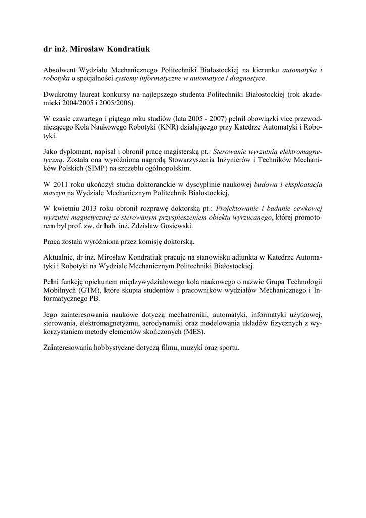 dr inż. Mirosław Kondratiuk Absolwent Wydziału Mechanicznego Politechniki Białostockiej na kierunku automatyka i robotyka o specjalności systemy informatyczne w automatyce i diagnostyce. Dwukrotny laureat konkursy na najlepszego studenta Politechniki Białostockiej (rok akademicki 2004/2005 i 2005/2006). W czasie czwartego i piątego roku studiów (lata 2005 - 2007) pełnił obowiązki vice przewodniczącego Koła Naukowego Robotyki (KNR) działającego przy Katedrze Automatyki i Robotyki. Jako dyplomant, napisał i obronił pracę magisterską pt.: Sterowanie wyrzutnią elektromagnetyczną. Została ona wyróżniona nagrodą Stowarzyszenia Inżynierów i Techników Mechaników Polskich (SIMP) na szczeblu ogólnopolskim. W 2011 roku ukończył studia doktoranckie w dyscyplinie naukowej budowa i eksploatacja maszyn na Wydziale Mechanicznym Politechnik Białostockiej. W kwietniu 2013 roku obronił rozprawę doktorską pt.: Projektowanie i badanie cewkowej wyrzutni magnetycznej ze sterowanym przyspieszeniem obiektu wyrzucanego, której promotorem był prof. zw. dr hab. inż. Zdzisław Gosiewski. Praca została wyróżniona przez komisję doktorską. Aktualnie, dr inż. Mirosław Kondratiuk pracuje na stanowisku adiunkta w Katedrze Automatyki i Robotyki na Wydziale Mechanicznym Politechniki Białostockiej. Pełni funkcję opiekunem międzywydziałowego koła naukowego o nazwie Grupa Technologii Mobilnych (GTM), które skupia studentów i pracowników wydziałów Mechanicznego i Informatycznego PB. Jego zainteresowania naukowe dotyczą mechatroniki, automatyki, informatyki użytkowej, sterowania, elektromagnetyzmu, aerodynamiki oraz modelowania układów fizycznych z wykorzystaniem metody elementów skończonych (MES). Zainteresowania hobbystyczne dotyczą filmu, muzyki oraz sportu.