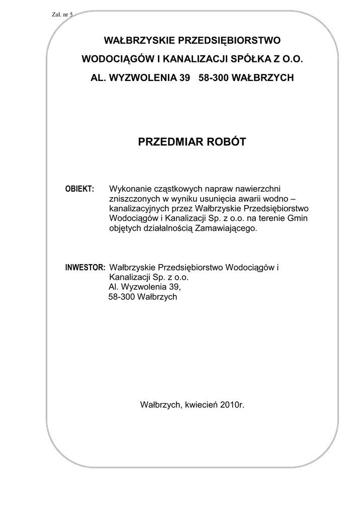 Przedmiar robót - Wałbrzyskie Przedsiębiorstwo Wodociągów i