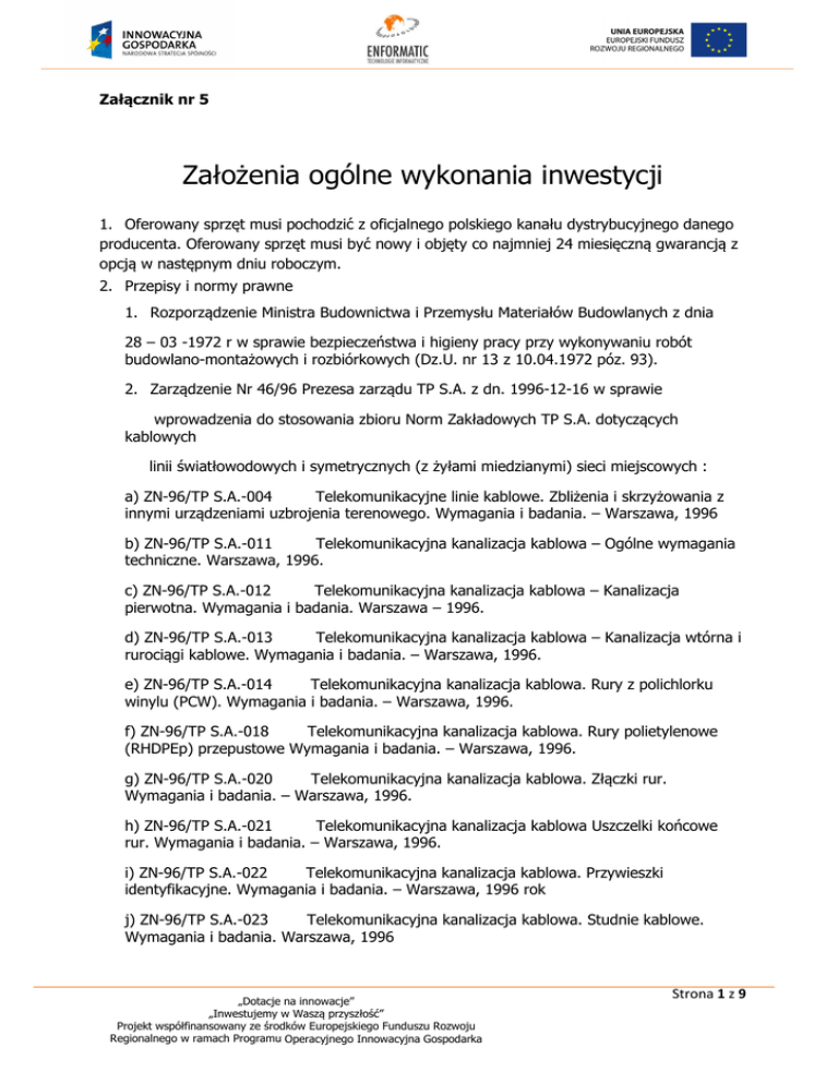 Załącznik nr 5 Założenia ogólne wykonania inwestycji 1. Oferowany sprzęt musi pochodzić z oficjalnego polskiego kanału dystrybucyjnego danego producenta. Oferowany sprzęt musi być nowy i objęty co najmniej 24 miesięczną gwarancją z opcją w następnym dniu roboczym. 2. Przepisy i normy prawne 1. Rozporządzenie Ministra Budownictwa i Przemysłu Materiałów Budowlanych z dnia 28 – 03 -1972 r w sprawie bezpieczeństwa i higieny pracy przy wykonywaniu robót budowlano-montażowych i rozbiórkowych (Dz.U. nr 13 z 10.04.1972 póz. 93). 2. Zarządzenie Nr 46/96 Prezesa zarządu TP S.A. z dn. 1996-12-16 w sprawie wprowadzenia do stosowania zbioru Norm Zakładowych TP S.A. dotyczących kablowych linii światłowodowych i symetrycznych (z żyłami miedzianymi) sieci miejscowych : a) ZN-96/TP S.A.-004 Telekomunikacyjne linie kablowe. Zbliżenia i skrzyżowania z innymi urządzeniami uzbrojenia terenowego. Wymagania i badania. – Warszawa, 1996 b) ZN-96/TP S.A.-011 Telekomunikacyjna kanalizacja kablowa – Ogólne wymagania techniczne. Warszawa, 1996. c) ZN-96/TP S.A.-012 Telekomunikacyjna kanalizacja kablowa – Kanalizacja pierwotna. Wymagania i badania. Warszawa – 1996. d) ZN-96/TP S.A.-013 Telekomunikacyjna kanalizacja kablowa – Kanalizacja wtórna i rurociągi kablowe. Wymagania i badania. – Warszawa, 1996. e) ZN-96/TP S.A.-014 Telekomunikacyjna kanalizacja kablowa. Rury z polichlorku winylu (PCW). Wymagania i badania. – Warszawa, 1996. f) ZN-96/TP S.A.-018 Telekomunikacyjna kanalizacja kablowa. Rury polietylenowe (RHDPEp) przepustowe Wymagania i badania. – Warszawa, 1996. g) ZN-96/TP S.A.-020 Telekomunikacyjna kanalizacja kablowa. Złączki rur. Wymagania i badania. – Warszawa, 1996. h) ZN-96/TP S.A.-021 Telekomunikacyjna kanalizacja kablowa Uszczelki końcowe rur. Wymagania i badania. – Warszawa, 1996. i) ZN-96/TP S.A.-022 Telekomunikacyjna kanalizacja kablowa. Przywieszki identyfikacyjne. Wymagania i badania. – Warszawa, 1996 rok j) ZN-96/TP S.A.-023 Telekomunikacyjna kanalizacja kablowa. Studnie kablowe. Wymagania i badania. Warszawa, 1996 „Dotacje na innowacje” „Inwestujemy w Waszą przyszłość” Projekt współfinansowany ze środków Europejskiego Funduszu Rozwoju Regionalnego w ramach Programu Operacyjnego Innowacyjna Gospodarka Strona 1 z 9 k) ZN-96/TP SA 024 Telekomunikacyjna kanalizacja kablowa. Zasobniki złączowe. Wymagania i badania. Warszawa, 1996 rok l) ZN-96/TP S.A.-025 Telekomunikacyjne linie kablowe. Taśmy ostrzegawczolokalizacyjne. Wymagania i badania. Warszawa, 2000 m) ZN-96/TP S.A.-026 Telekomunikacyjne linie kablowe. Słupki oznaczeniowe i oznaczeniowo-pomiarowe. Wymagania i badania. Warszawa, 2006 n) ZN-96/TP S.A.-027 Telekomunikacyjne sieci miejscowe. Linie kablowe o żyłach metalowych . Ogólne wymagania techniczne. Warszawa 1996 o) ZN-96/TP S.A.-029 Telekomunikacyjne sieci miejscowe. Telekomunikacyjne kable miejscowe o izolacji i powłoce polietylenowej , wypełnione. Wymagania i badania. Warszawa, 1996. p) ZN-96/TP S.A. -030 Telekomunikacyjne sieci miejscowe. Łączniki żył. Wymagania i badania. Warszawa, 2005 r) ZN-96/TP S.A. -031 Telekomunikacyjne sieci miejscowe. Osłony złączowe. Wymagania i badania. Warszawa, 1996 s) ZN-96/TP S.A. -032 Telekomunikacyjne sieci miejscowe. Łączówki i zespoły łączówkowe, kablowe i przełącznikowe.. Wymagania i badania. (Norma zastępuje Normy Zakładowe ZN-96/TP SA -032 i ZN-96/ TP SA -034) t) ZN-96/TP S.A. -033 Telekomunikacyjne sieci miejscowe. Obudowy zakończeń kablowych . Wymagania i badania. Warszawa, 2005. u) ZN-96/TP S.A. -036 Telekomunikacyjne sieci miejscowe. Urządzenia ochrony ludzi i urządzeń przed przepięciami i przetężeniami (ochronniki ) . Wymagania i badania. Warszawa, 2010. w) ZN-96/TP S.A. -037 Telekomunikacyjne sieci miejscowe. Systemy uziemiające obiektów telekomunikacyjnych . Wymagania i badania. Warszawa, 2010 v) ZN-96/TP S.A. -041 Telekomunikacyjna kanalizacja kablowa. Pokrywy wewnętrzne zabezpieczające dostęp do studni kablowych. Wymagania i badania. Warszawa, 2005 „Dotacje na innowacje” „Inwestujemy w Waszą przyszłość” Projekt współfinansowany ze środków Europejskiego Funduszu Rozwoju Regionalnego w ramach Programu Operacyjnego Innowacyjna Gospodarka Strona 2 z 9 Specyfikacja do pozycji wyceny I. Prace przygotowawcze i projektowe 1. Prace przygotowawcze • inwentaryzacja podbudowy słupowej nn i tt na terenie inwestycji • koncepcja budowy sieci • wystąpienia do zakładu energetycznego i telekomunikacji o warunki ogólne na wykorzystanie infrastruktury • wystąpienia do organów administracyjnych 2. Wymagania dotyczące projektowania: • Mapa zasadnicza do celów projektowych zaewidencjonowana w ośrodku geodezyjnym w skali 1 : 500 lub 1 : 1000 • Mapa ewidencyjna w skali 1 : 1000 • Skrócone wypisy z ewidencji gruntów działek przez które przebiega światłowód • Zgody właścicieli działek przez które będzie przebiegał światłowód • Zgody gestorów sieci na strukturach których budowana będzie sieć FTTH • W trakcie projektowania należy zwrócić uwagę na istniejące przestrzenie, obiekty i miejsca o charakterze zabytkowym: krajobrazy kulturowe, aleje, układy urbanistyczne, dzieła architektury i budownictwa parki, ogrody i inne formy zaprojektowanej zieleni. W przypadku braku możliwości uniknięcia kolizji z tymi przestrzeniami, obiektami i miejscami należy zwrócić się do właściwego miejscowo wojewódzkiego lub miejskiego (bądź wydziału urzędu gminy) konserwatora zabytków , celem uzyskania zgody na przebieg sieci. • Projektowana siec nie jest uciążliwa dla środowiska, nie wytwarza hałasu. Ocena oddziaływania projektowanej sieci na stan środowiska nie jest wymagana. • Nie planuje się wykonać punktów styku z operatorami zewnętrznymi. II. Zakup materiałów do wykonania sieci dystrybucyjnej doziemnej i napowietrznej a) Rura HDPE Fi·40·mm b) Uszczelki końców rur H