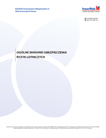 InterRisk Kontakt 22 212 20 12 OGÓLNE WARUNKI UBEZPIECZENIA RYZYK LOTNICZYCH InterRisk Towarzystwo Ubezpieczeń Spółka Akcyjna Vienna Insurance Group, KRS: 0000054136, Sąd Rejonowy dla M. St. Warszawy, XII Wydział Gospodarczy, NIP: 526-00-38-806, Kapitał zakładowy i kapitał wpłacony: 137.640.100 PLN, Centrala, ul. Noakowskiego 22, 00-668 Warszawa, InterRisk Kontakt: 22 212 20 12, interrisk.pl Informacje, o których mowa w art. 17 ust. 1 ustawy o działalności ubezpieczeniowej i reasekuracyjnej RODZAJ INFORMACJI 2 NUMER ZAPISU Z WZORCA UMOWNEGO 1. Przesłanki wypłaty odszkodowania i innych świadczeń lub wartości wykupu ubezpieczenia §2 - §6, §13, §14, §18 - §21 2. Ograniczenia oraz wyłączenia odpowiedzialności zakładu ubezpieczeń uprawniające do odmowy wypłaty odszkodowania i innych świadczeń lub ich obniżenia §5 ust. 3 i 4, §7 - §11, §14 ust. 4, §17 ust. 3, §18 ust. 1 pkt 1 i 3, §20 ust. 6 3. Koszty oraz inne obciążenia potrącane ze składek ubezpieczeniowych, z aktywów ubezpieczeniowych funduszy kapitałowych lub poprzez umorzenie jednostek uczestnictwa ubezpieczeniowych funduszy kapitałowych Nie dotyczy 4. Wartość wykupu ubezpieczenia w poszczególnych okresach trwania ochrony ubezpieczeniowej oraz okres, w którym roszczenie o wypłatę wartości wykupu nie przysługuje Nie dotyczy OGÓLNE WARUNKI UBEZPIECZENIA RYZYK LOTNICZYCH OGÓLNE WARUNKI UBEZPIECZENIA RYZYK LOTNICZYCH Spis treści POSTANOWIENIA OGÓLNE .................................................................................................................... DEFINICJE .......................................................................................................................................................... PRZEDMIOT I ZAKRES UBEZPIECZENIA ........................................................................................... OC UŻYTKOWNIKA STATKU POWIETRZNEGO (odpowiedzialność cywilna wobec osób trzecich bądź pasażerów ............................................................................................ OC PRZEWOŹNIKA (odpowiedzialność cywilna przewoźnika wobec pasażerów i ich bagażu) ........................................................................................................................... OC FRACHT (odpowiedzialności cywilna przewoźnika z tytułu przewozu ładunków) ................................................................................................................................. OGÓLNE WYŁĄCZENIA ODPOWIEDZIALNOŚCI DLA WSZYSTKICH RYZYK WYMIENIONYCH W §3 UST. 1 OWU .................................................................................................. SZCZEGÓLNE WYŁĄCZENIA ODPOWIEDZIALNOŚCI DLA POSZCZEGÓLNYCH RYZYK WYMIENIONYCH W §3 UST. 1 OWU ................................................................................... OC UŻYTKOWNIKA STATKU POWIETRZNEGO (odpowiedzialność cywilna wobec osób trzecich) ................................................................................................................................ OC PRZEWOŹNIKA(odpowiedzialność cywilna przewoźnika wobec pasażerów i ich bagażu ............................................................................................................................ OC FRACHT (odpowiedzialność cywilna przewoźnika z tytułu przewozu ładunków ................................................................................................................................... SUMA GWARANCYJNA I WARUNKI JEJ ZMIANY ........................................................................ ZAWARCIE UMOWY UBEZPIECZENIA ............................................................................................... POCZĄTEK I KONIEC ODPOWIEDZIALNOŚCI ............................................................................... ROZWIĄZANIE UMOWY UBEZPIECZENIA ...................................................................................... SKŁADKA UBEZPIECZENIOWA .............................................................................................................. PRAWA I OBOWIĄZKI STRON ................................................................................................................ ZGŁOSZENIE SZKODY, USTALENIE ROZMIARU SZKODY I WYSOKOŚCI ODSZKODOWANIA ...................................................................................................................................... WYPŁATA ODSZKODOWANIA ............................................................................................................... ROSZCZENIA REGRESOWE ...................................................................................................................... SKARGI I REKLAMACJE ............................................................................................................................... POSTANOWIENIA KOŃCOWE ................................................................................................................ 1. 2. 3. 4. 5. 6. 3 3 4 4 4 4 4 5 5 5 5 5 5 6 6 6 7 7 8 8 9 9 POSTANOWIENIA OGÓLNE §1 Niniejsze ogólne warunki ogólne warunki ubezpieczenia ryzyk lotniczych, zwane dalej „OWU”, mają zastosowanie do umów ubezpieczenia zawieranych pomiędzy osobami fizycznymi, prawnymi oraz jednostkami organizacyjnymi nie posiadającymi osobowości prawnej, prowadzącymi działalność gospodarczą, zwanymi dalej Ubezpieczającymi, a InterRisk Towarzystwem Ubezpieczeń Spółką Akcyjną Vienna Insurance Group, zwanym dalej Ubezpieczycielem. Umowę ubezpieczenia można zawrzeć także na cudzy rachunek, z tym że Ubezpieczony imiennie wskazany jest w umowie (polisie). Zarzuty mające wpływ na odpowiedzialność Ubezpieczyciela może on podnieść także przeciwko Ubezpieczonemu. Do umowy ubezpieczenia mogą być wprowadzone, za zgodą stron, postanowienia dodatkowe lub odmienne, z tym że różnice między OWU, a treścią umowy Ubezpieczyciel przedstawi 