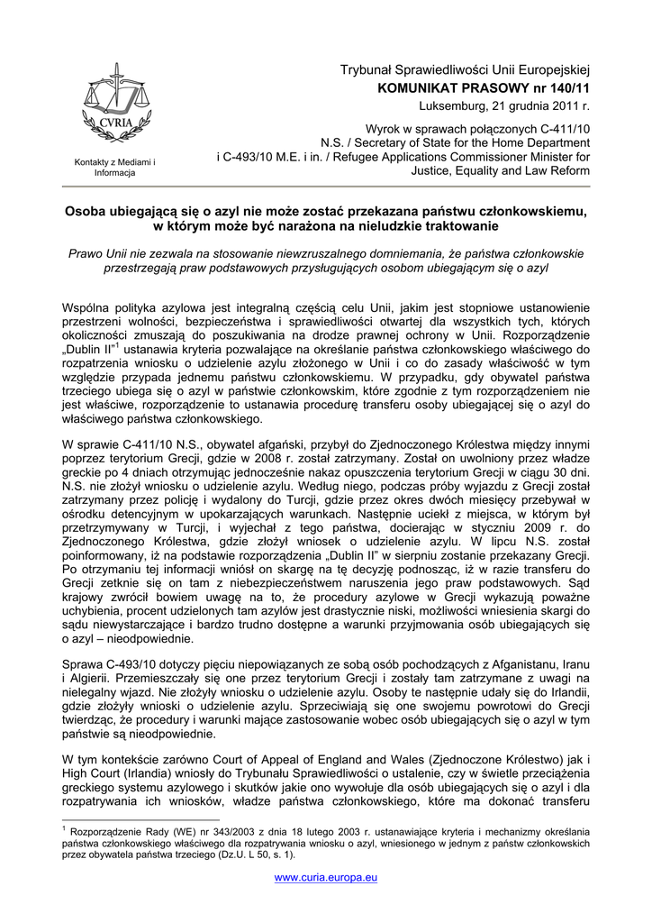 Trybunał Sprawiedliwości Unii Europejskiej KOMUNIKAT PRASOWY nr 140/11 Luksemburg, 21 grudnia 2011 r. Kontakty z Mediami i Informacja Wyrok w sprawach połączonych C-411/10 N.S. / Secretary of State for the Home Department i C-493/10 M.E. i in. / Refugee Applications Commissioner Minister for Justice, Equality and Law Reform Osoba ubiegającą się o azyl nie może zostać przekazana państwu członkowskiemu, w którym może być narażona na nieludzkie traktowanie Prawo Unii nie zezwala na stosowanie niewzruszalnego domniemania, że państwa członkowskie przestrzegają praw podstawowych przysługujących osobom ubiegającym się o azyl Wspólna polityka azylowa jest integralną częścią celu Unii, jakim jest stopniowe ustanowienie przestrzeni wolności, bezpieczeństwa i sprawiedliwości otwartej dla wszystkich tych, których okoliczności zmuszają do poszukiwania na drodze prawnej ochrony w Unii. Rozporządzenie „Dublin II”1 ustanawia kryteria pozwalające na określanie państwa członkowskiego właściwego do rozpatrzenia wniosku o udzielenie azylu złożonego w Unii i co do zasady właściwość w tym względzie przypada jednemu państwu członkowskiemu. W przypadku, gdy obywatel państwa trzeciego ubiega się o azyl w państwie członkowskim, które zgodnie z tym rozporządzeniem nie jest właściwe, rozporządzenie to ustanawia procedurę transferu osoby ubiegającej się o azyl do właściwego państwa członkowskiego. W sprawie C-411/10 N.S., obywatel afgański, przybył do Zjednoczonego Królestwa między innymi poprzez terytorium Grecji, gdzie w 2008 r. został zatrzymany. Został on uwolniony przez władze greckie po 4 dniach otrzymując jednocześnie nakaz opuszczenia terytorium Grecji w ciągu 30 dni. N.S. nie złożył wniosku o udzielenie azylu. Według niego, podczas próby wyjazdu z Grecji został zatrzymany przez policję i wydalony do Turcji, gdzie przez okres dwóch miesięcy przebywał w ośrodku detencyjnym w upokarzających warunkach. Następnie uciekł z miejsca, w którym był przetrzymywany w Turcji, i wyjechał z tego państwa, docierając w styczniu 2009 r. do Zjednoczonego Królestwa, gdzie złożył wniosek o udzielenie azylu. W lipcu N.S. został poinformowany, iż na podstawie rozporządzenia „Dublin II” w sierpniu zostanie przekazany Grecji. Po otrzymaniu tej informacji wniósł on skargę na tę decyzję podnosząc, iż w razie transferu do Grecji zetknie się on tam z niebezpieczeństwem naruszenia jego praw podstawowych. Sąd krajowy zwrócił bowiem uwagę na to, że procedury azylowe w Grecji wykazują poważne uchybienia, procent udzielonych tam azylów jest drastycznie niski, możliwości wniesienia skargi do sądu niewystarczające i bardzo trudno dostępne a warunki przyjmowania osób ubiegających się o azyl – nieodpowiednie. Sprawa C-493/10 dotyczy pięciu niepowiązanych ze sobą osób pochodzących z Afganistanu, Iranu i Algierii. Przemieszczały się one przez terytorium Grecji i zostały tam zatrzymane z uwagi na nielegalny wjazd. Nie złożyły wniosku o udzielenie azylu. Osoby te następnie udały się do Irlandii, gdzie złożyły wnioski o udzielenie azylu. Sprzeciwiają się one swojemu powrotowi do Grecji twierdząc, że procedury i warunki mające zastosowanie wobec osób ubiegających się o azyl w tym państwie są nieodpowiednie. W tym kontekście zarówno Court of Appeal of England and Wales (Zjednoczone Królestwo) jak i High Court (Irlandia) wniosły do Trybunału Sprawiedliwości o ustalenie, czy w świetle przeciążenia greckiego systemu azylowego i skutków jakie ono wywołuje dla osób ubiegających się o azyl i dla rozpatrywania ich wniosków, władze państwa członkowskiego, które ma dokonać transferu 1 Rozporządzenie Rady (WE) nr 343/2003 z dnia 18 lutego 2003 r. ustanawiające kryteria i mechanizmy określania państwa członkowskiego właściwego dla rozpatrywania wniosku o azyl, wniesionego w jednym z państw członkowskich przez obywatela państwa trzeciego (Dz.U. L 50, s. 1). www.curia.europa.eu wnioskodawców do Grecji (państwa właściwego na podstawie rozporządzenia dla rozpatrzenia wniosku o udzielenie azylu) powinny uprzednio sprawdzić, czy państwo to rzeczywiście przestrzega praw podstawowych. Wspomniane sądy zmierzają również do ustalenia czy w przypadku, gdy państwo to nie przestrzega praw podstawowych, wspomniane władze mają obowiązek przyjęcia odpowiedzialności za rozpatrzenie wniosków o udzielenie azylu. W ramach rozpatrywania tych spraw przez Trybunał, uwagi przedłożyło 13 państw członkowskich, Konfederacja Szwajcarska, Wysoki Komisarz Narodów Zjednoczonych do spraw Uchodźców, Amnesty International i AIRE Centre. Uczestnicy, którzy przedłożyli uwagi Trybunałowi, nie spierali się co do tego, że w 2010 r. Grecja była tym miejscem, przez które na terytorium Unii wjeżdża prawie 90% nielegalnych imigrantów, w związku z czym obciążenie tego państwa jest nieproporcjonalne w stosunku do obciążenia innych państw członkowskich oraz że władze greckie nie mają materialnych możliwości, aby sprostać temu zadaniu. W wydanym dzisiaj wyroku Trybunał przypomniał, po pierwsze, że wspólny europejski system azylowy został osadzony w kontekście pozwalającym zakładać, że wszystkie uczestniczące w nim państwa przestrzegają praw podstawowych oraz że państwa członkowskie mogą w tym względzie darzyć się wzajemnym zaufaniem. To właśnie z uwagi na tę zasadę wzajemnego zaufania prawodawca Unii przyjął rozporządzenie „Dublin II”, którego podstawowym celem jest przyspieszenie rozpatrywania wniosków o udzielenie azylu, zarówno w interesie osób ubiegających się o azyl, jak i uczestniczących państw. Opierając się na tej zasadzie Trybunał zbadał, czy organy krajowe, które mają dokonać transferu do państwa właściwego dla rozpatrzenia wniosku o udzielenie azylu powinny uprzednio sprawdzić, czy prawa podstawowe przysłu