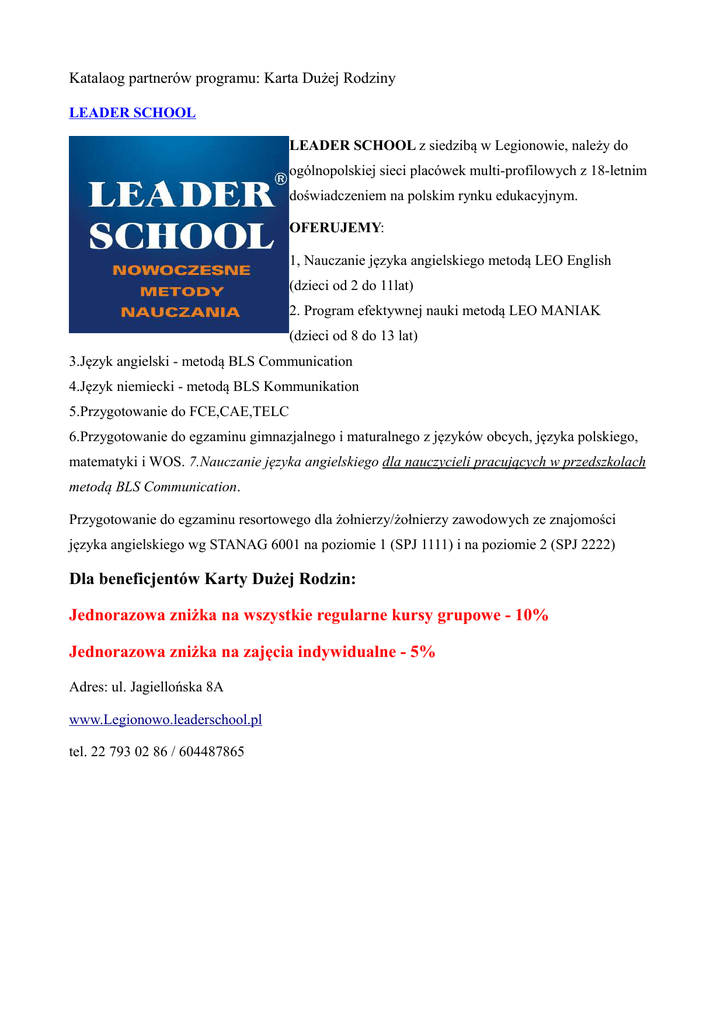 Katalaog partnerów programu: Karta Dużej Rodziny LEADER SCHOOL LEADER SCHOOL z siedzibą w Legionowie, należy do ogólnopolskiej sieci placówek multi-profilowych z 18-letnim doświadczeniem na polskim rynku edukacyjnym. OFERUJEMY: 1, Nauczanie języka angielskiego metodą LEO English (dzieci od 2 do 11lat) 2. Program efektywnej nauki metodą LEO MANIAK (dzieci od 8 do 13 lat) 3.Język angielski - metodą BLS Communication 4.Język niemiecki - metodą BLS Kommunikation 5.Przygotowanie do FCE,CAE,TELC 6.Przygotowanie do egzaminu gimnazjalnego i maturalnego z języków obcych, języka polskiego, matematyki i WOS. 7.Nauczanie języka angielskiego dla nauczycieli pracujących w przedszkolach metodą BLS Communication. Przygotowanie do egzaminu resortowego dla żołnierzy/żołnierzy zawodowych ze znajomości języka angielskiego wg STANAG 6001 na poziomie 1 (SPJ 1111) i na poziomie 2 (SPJ 2222) Dla beneficjentów Karty Dużej Rodzin: Jednorazowa zniżka na wszystkie regularne kursy grupowe - 10% Jednorazowa zniżka na zajęcia indywidualne - 5% Adres: ul. Jagiellońska 8A www.Legionowo.leaderschool.pl tel. 22 793 02 86 / 604487865