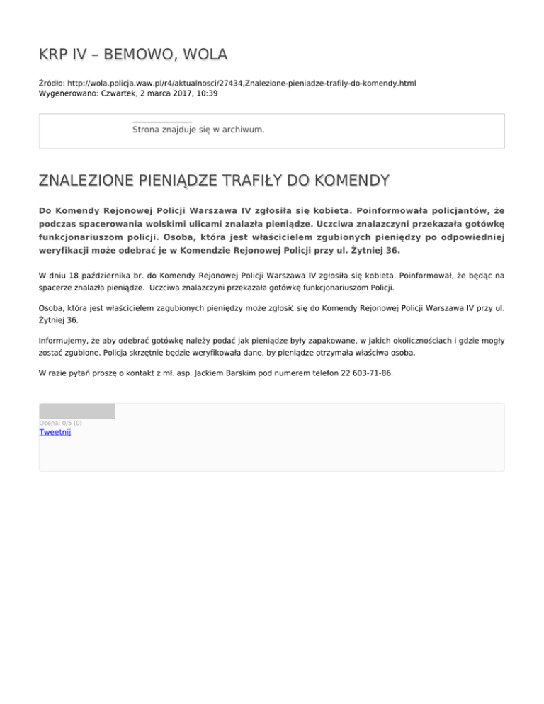 KRP IV – BEMOWO, WOLA Źródło: http://wola.policja.waw.pl/r4/aktualnosci/27434,Znalezione-pieniadze-trafily-do-komendy.html Wygenerowano: Czwartek, 2 marca 2017, 10:39 Strona znajduje się w archiwum. ZNALEZIONE PIENIĄDZE TRAFIŁY DO KOMENDY Do Komendy Rejonowej Policji Warszawa IV zgłosiła się kobieta. Poinformowała policjantów, że podczas spacerowania wolskimi ulicami znalazła pieniądze. Uczciwa znalazczyni przekazała gotówkę funkcjonariuszom policji. Osoba, która jest właścicielem zgubionych pieniędzy po odpowiedniej weryfikacji może odebrać je w Komendzie Rejonowej Policji przy ul. Żytniej 36. W dniu 18 października br. do Komendy Rejonowej Policji Warszawa IV zgłosiła się kobieta. Poinformował, że będąc na spacerze znalazła pieniądze. Uczciwa znalazczyni przekazała gotówkę funkcjonariuszom Policji. Osoba, która jest właścicielem zagubionych pieniędzy może zgłosić się do Komendy Rejonowej Policji Warszawa IV przy ul. Żytniej 36. Informujemy, że aby odebrać gotówkę należy podać jak pieniądze były zapakowane, w jakich okolicznościach i gdzie mogły zostać zgubione. Policja skrzętnie będzie weryfikowała dane, by pieniądze otrzymała właściwa osoba. W razie pytań proszę o kontakt z mł. asp. Jackiem Barskim pod numerem telefon 22 603-71-86. Ocena: 0/5 (0) Tweetnij