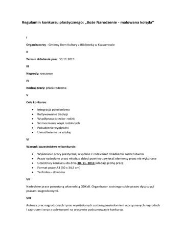 Regulamin konkursu plastycznego: „Boże Narodzenie - malowana kolęda” I Organizatorzy - Gminny Dom Kultury z Biblioteką w Ksawerowie II Termin składania prac: 30.11.2013 III Nagrody: rzeczowe IV Rodzaj pracy: praca rodzinna V Cele konkursu: Integracja pokoleniowa Kultywowanie tradycji Współpraca dziecko- rodzic Wzmocnienie więzi rodzinnych Pobudzenie wyobraźni Uwrażliwienie na sztukę VI Warunki uczestnictwa w konkursie: Wykonanie pracy plastycznej wspólnie z rodzicami/ dziadkami/ rodzeństwem Prace nadesłane przez młodsze dzieci powinny zawierać elementy przez nie wykonane Uczestnicy konkursu do dnia 30. 11. 2013 składają jedną pracę Format pracy A3 (50 x 34,5 cm) Technika – dowolna VII Nadesłane prace pozostaną własnością GDKzB. Organizator zastrzega sobie prawo dyspozycji pracami nagrodzonymi. VIII Autorzy prac nagrodzonych i prac wyróżnionych zostaną powiadomieni o przyznanych nagrodach i zaproszeni wraz z opiekunami na uroczyste podsumowanie konkursu. IX Terminarz konkursu 30. 11. 2013 – termin składania prac konkursowych. Prace w zamkniętej kopercie z dopiskiem: Konkurs plastyczny „Boże Narodzenie - malowana kolęda należy przesłać pocztą lub dostarczyć na adres (Gminny Dom Kultury z Biblioteką w Ksawerowie(sekretariat), ul. Jana Pawła II /1, 95-054 Ksawerów X Ogłoszenie wyniku wraz z otwarciem wystawy prac konkursowych odbędzie się 6 grudnia 2013 o godz. 17:00. XI Każda praca powinna być czytelnie podpisana wg wzoru pismem drukowanym: Imię: ..................... Nazwisko: .................................. Adres zamieszkania: .................................................................................... Wiek:………………………………………………………………………………………………………… Szkoła/ Przedszkole…………………………………………………………………………………. ........................................................................................................ Nazwa miejscowości, z której pochodzi praca........................................... Numer kontaktowy (telefon)……………………………………….