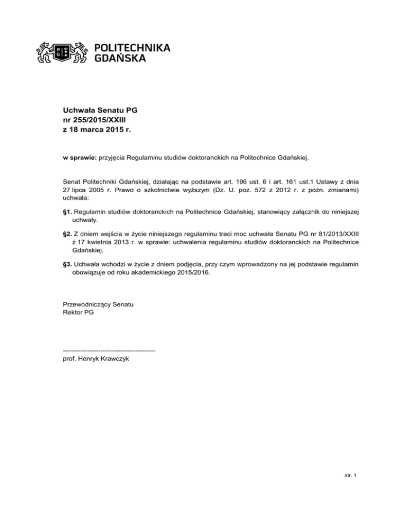 Uchwała Senatu Politechniki Gdańskiej nr 255/XXIII z dnia 18 marca