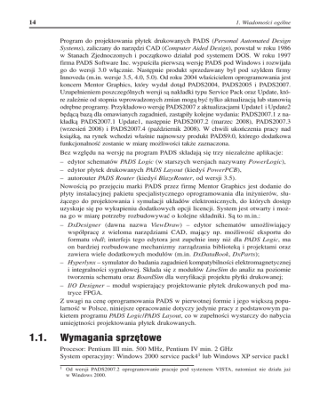 14 1. Wiadomości ogólne Program do projektowania płytek drukowanych PADS (Personal Automated Design Systems), zaliczany do narzędzi CAD (Computer Aided Design), powstał w roku 1986 w Stanach Zjednoczonych i początkowo działał pod systemem DOS. W roku 1997 firma PADS Software Inc. wypuściła pierwszą wersję PADS pod Windows i rozwijała go do wersji 3.0 włącznie. Następnie produkt sprzedawany był pod szyldem firmy Innoveda (m.in. wersje 3.5, 4.0, 5.0). Od roku 2004 właścicielem oprogramowania jest koncern Mentor Graphics, który wydał dotąd PADS2004, PADS2005 i PADS2007. Uzupełnieniem poszczególnych wersji są nakładki typu Service Pack oraz Update, które zależnie od stopnia wprowadzonych zmian mogą być tylko aktualizacją lub stanowią odrębne programy. Przykładowo wersję PADS2007 z aktualizacjami Update1 i Update2 będącą bazą dla omawianych zagadnień, zastąpiły kolejne wydania: PADS2007.1 z nakładką PADS2007.1 Update1, następnie PADS2007.2 (marzec 2008), PADS2007.3 (wrzesień 2008) i PADS2007.4 (październik 2008). W chwili ukończenia pracy nad książką, na rynek wchodzi właśnie najnowszy produkt PADS9.0, którego dodatkowa funkcjonalność zostanie w miarę możliwości także zaznaczona. Bez względu na wersję na program PADS składają się trzy niezależne aplikacje: – edytor schematów PADS Logic (w starszych wersjach nazywany PowerLogic), – edytor płytek drukowanych PADS Layout (kiedyś PowerPCB), – autorouter PADS Router (kiedyś BlazeRouter, od wersji 3.5). Nowością po przejęciu marki PADS przez firmę Mentor Graphics jest dodanie do płyty instalacyjnej pakietu specjalistycznego oprogramowania dla inżynierów, służącego do projektowania i symulacji układów elektronicznych, do których dostęp uzyskuje się po wykupieniu dodatkowych opcji licencji. System jest otwarty i można go w miarę potrzeby rozbudowywać o kolejne składniki. Są to m.in.: – DxDesigner (dawna nazwa ViewDraw) – edytor schematów umożliwiający współpracę z wieloma narzędziami CAD, mający np. możliwość eksportu do formatu vhdl; interfejs tego edytora jest zupełnie inny niż dla PADS Logic, ma on bardziej rozbudowane mechanizmy zarządzania biblioteką i projektami oraz zawiera wiele dodatkowych modułów (m.in. DxDataBook, DxParts); – Hyperlynx – symulator do badania zagadnień kompatybilności elektromagnetycznej i integralności sygnałowej. Składa się z modułów LineSim do analiz na poziomie tworzenia schematu oraz BoardSim dla weryfikacji projektu płytki drukowanej; – I/O Designer – moduł wspierający projektowanie płytek drukowanych pod matryce FPGA. Z uwagi na cenę oprogramowania PADS w pierwotnej formie i jego większą popularność w Polsce, niniejsze opracowanie dotyczy jedynie pracy z podstawowym pakietem programu PADS Logic/PADS Layout, co w zupełności wystarczy do nabycia umiejętności projektowania płytek drukowanych. 1.1. Wymagania sprzętowe Procesor: Pentium III min. 500 MHz, Pentium IV min. 2 GHz System operacyjny: Windows 2000 service pack41 lub Windows XP service pack1 1 Od wersji PADS2007.2 oprogramowanie pracuje pod systemem VISTA, natomiast nie działa już w Windows 2000. 1.3. Organizacja pracy 15 Pamięć RAM: min. 256...512 MB; zalecane 1 GB lub więcej Monitor: 1024×768, min. 256 kolorów; zalecane 2 monitory Mysz: 2-klawiszowa; zalecana 3-klawiszowa, najlepiej z rolką Przeglądarka: Internet Explorer 6.0 – do wyświetlania dokumentów pomocy w programie 200...300 MB wolnego miejsca na dysku (2,5 GB dla pełnego pakietu oprogramowania z płyty CD) 1.2. Dostępność oprogramowania Ze strony http://www.mentor.com/products/pcb-system-design/design-flows/pads/ pads_eval.uation można po zarejestrowaniu się pobrać wersję ewaluacyjną programu PADS, która działa z pełną funkcjonalnością przez 30 dni przy ograniczeniu do bazy 30 elementów, 65 sieci logicznych i 150 połączeń2. Wystarcza to w zupełności, aby na prostych przykładach poznać możliwości oprogramowania. Po przekroczeniu podanych limitów program przechodzi w tryb demonstracyjny, tzn. zablokowane zostają wszystkie funkcje wyjściowe (zapis, eksport, drukowanie itp.) oraz wyłączone niektóre kluczowe moduły (np. narzędzie weryfikacji projektu). Po powrocie do rozmiarów bazy podstawowej przywrócona zostaje pełna funkcjonalność. Istnieje możliwość zamówienia u producenta pełnej wersji 30-dniowej. W tym celu należy skontaktować się z lokalnym dystrybutorem firmy Mentor Graphics dla danego regionu (http://www.mentor.com/products/pcb-system-design/design-flows/ pads/resellers). 1.3. Organizacja pracy Standardowa instalacja umieszcza programy na dysku systemowym w katalogu MentorGraphics: C:/MentorGraphics/2007PADS 3/SDD_HOME/Programs/*.*. Katalog roboczy dla projektów to domyślnie C:/PADS Projects. Wszystkie programy pakietu PADS są aplikacjami „jednozadaniowymi”, tzn. w każdej z nich można pracować tylko z jednym projektem. Polecenie otwarcia pliku automatycznie zamyka bieżący projekt. Aby uruchomić równocześnie inny projekt należy otworzyć kolejną aplikację. Plik projektu wybrany do uruchomienia wprost z okna eksploratora plików uruchamia się również w nowej aplikacji. Nie ma opcji uruchomienia samej aplikacji bez równoczesnego otwarcia pliku – domyślnie pojawia się nienazwany projekt zdefiniowany w pliku startowym. Przy okazji warto zwrócić uwagę na cenną właściwość programu dotyczącą ochrony otwartego projektu przed ponowną edycją. W tym celu wejdźmy do katalogu C:/PADS Projects/Samples i spróbujmy dwukrotnie otworzyć projekt z pliku Preview.sch. Zauważmy, że druga aplikacja PADS Logic komunikuje zdarzenie i pozostawia użytkownikowi do wyboru albo zaniechanie czynności, albo utworzenie kopii tylko do odczytu (rysunek 1.1). W ten sposób wielokrotna edycja tego 2 3 Jako połączenie (Connection) należy liczyć każdą parę wyprowadzeń (Pin Pair). Dl