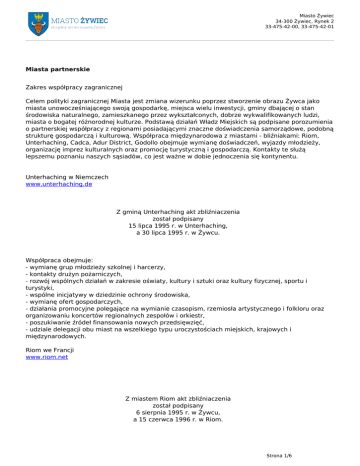 Miasto Żywiec 34-300 Żywiec, Rynek 2 33-475-42-00, 33-475-42-01 Miasta partnerskie Zakres współpracy zagranicznej Celem polityki zagranicznej Miasta jest zmiana wizerunku poprzez stworzenie obrazu Żywca jako miasta unowocześniającego swoją gospodarkę, miejsca wielu inwestycji, gminy dbającej o stan środowiska naturalnego, zamieszkanego przez wykształconych, dobrze wykwalifikowanych ludzi, miasta o bogatej różnorodnej kulturze. Podstawą działań Władz Miejskich są podpisane porozumienia o partnerskiej współpracy z regionami posiadającymi znaczne doświadczenia samorządowe, podobną strukturę gospodarczą i kulturową. Współpraca międzynarodowa z miastami - bliźniakami: Riom, Unterhaching, Cadca, Adur District, Godollo obejmuje wymianę doświadczeń, wyjazdy młodzieży, organizację imprez kulturalnych oraz promocję turystyczną i gospodarczą. Kontakty te służą lepszemu poznaniu naszych sąsiadów, co jest ważne w dobie jednoczenia się kontynentu. Unterhaching w Niemczech www.unterhaching.de Z gminą Unterhaching akt zbliźniaczenia został podpisany 15 lipca 1995 r. w Unterhaching, a 30 lipca 1995 r. w Żywcu. Współpraca obejmuje: - wymianę grup młodzieży szkolnej i harcerzy, - kontakty drużyn pożarniczych, - rozwój wspólnych działań w zakresie oświaty, kultury i sztuki oraz kultury fizycznej, sportu i turystyki, - wspólne inicjatywy w dziedzinie ochrony środowiska, - wymianę ofert gospodarczych, - działania promocyjne polegające na wymianie czasopism, rzemiosła artystycznego i folkloru oraz organizowaniu koncertów regionalnych zespołów i orkiestr, - poszukiwanie źródeł finansowania nowych przedsięwzięć, - udziale delegacji obu miast na wszelkiego typu uroczystościach miejskich, krajowych i międzynarodowych. Riom we Francji www.riom.net Z miastem Riom akt zbliźniaczenia został podpisany 6 sierpnia 1995 r. w Żywcu, a 15 czerwca 1996 r. w Riom. Strona 1/6 Miasto Żywiec 34-300 Żywiec, Rynek 2 33-475-42-00, 33-475-42-01 Współpraca obejmuje: - wymianę między rodzinami obu miast, - wymianę grup młodzieży - współdziałanie szpitali polegające na wymianie doświadczeń oraz wzajemnych wizytach grup roboczych, - wymianę ofert gospodarczych - spotkania grup roboczych w dziedzinie oświaty, wychowania młodzieży, kultury i sztuki oraz kultury fizycznej, sportu i turystyki - działania promocyjne polegające na wymianie czasopism i rzemiosła artystycznego, udziale w targach noworocznych oraz koncertach zespołów regionalnych i orkiestr, - udział delegacji obu miast w uroczystościach miejskich, krajowych i międzynarodowych, - nawiązanie kontaktów między klubami łuczników z obu miast. Współpraca Żywieckich Gimnazjów ze szkołami z RIOM we Francji Čadca na Slowacji www.mestocadca.sk Z miastem Čadca akt zbliźniaczenia został podpisany 10 sierpnia 1997 r. w Żywcu, a 16 stycznia 1998 r. w Čadcy. Za jeden z priorytetów w rozwoju miasta uznaje się współpracę transgraniczną obejmującą Beskid Żywiecki oraz Kysuce i zachodnią Orawę. 18 lutego 2000 r. podpisano umowę o utworzeniu Euroregionu "Beskidy". Wspólne wysiłki samorządowców po obu stronach granicy zaowocowały powstaniem Międzynarodowego Stowarzyszenia Gmin Słowacko-Polskich Regionu Beskidzkiego, które ma wspierać rozwój kontaktów w zakresie ochrony środowiska, gospodarki i kultury. Współpraca obejmuje: - wymianę doświadczeń w zakresie pracy Urzędów Miejskich, - wymianę informacji o potrzebach i możliwościach rynku słowackiego i rynku polskiego - zwłaszcza w strefie przygranicznej, - kontakty w zakresie oświaty, które opierają się głównie na wymianie dzieci i młodzieży szkolnej, - kontakty w zakresie kultury prowadzone za pośrednictwem miejskich jednostek kultury sportu i turystyki, takich jak Muzeum w Żywcu, Żywiecki Ośrodek Kultury, Zespół Zamkowo-Parkowy, Żywiecka Biblioteka Samorządowa, Miejski Ośrodek Sportu i Rekreacji, - organizowanie imprez kulturalnych z okazji "Dni Kultury Słowackiej w Żywcu - region "Kysuce" oraz "Dni Kultury Polskiej na Słowacji -region Żywiecczyzny", Strona 2/6 Miasto Żywiec 34-300 Żywiec, Rynek 2 33-475-42-00, 33-475-42-01 - działania promocyjne polegające na wymianie czasopism, rzemiosła artystycznego i folkloru oraz organizowaniu koncertów regionalnych zespołów i orkiestr, - udział delegacji obu miast w uroczystościach miejskich, państwowych i międzynarodowych. Adur District w Anglii www.adur.gov.uk W sierpniu 1998 r. w Anglii została podjęta deklaracja wspólnej intencji podpisania umowy partnerskiej z regionem Adur. Natomiast podpisanie umowy nastąpiło 6 sierpnia 2000 r. na żywieckim Rynku. Współpraca obejmuje: - wymianę doświadczeń w dziedzinie oświaty, kultury, sportu i turystyki, - popieranie kontaktów między społeczeństwami, a zwłaszcza pomiędzy młodzieżą, - nawiązywanie kontaktów gospodarczych firm i zakładów pracy. Gödöllö na Węgrzech www.godollo.hu Podpisanie aktu nastąpiło w dniu 1 czerwca 2002r.w Gödöllö, a w Żywcu w dniu 4 sierpnia 2002 r. Współpraca z miastem Gödöllö na Węgrzech została nawiazana w listopadzie 1999 r. poprzez zaproszenie władz naszego miasta do Gödöllö. Celem tej wizyty było nawiązanie kontaktów między naszymi miastami, które doprowadziły do ukształtowania się bliższych więzi i do podpisania aktu zbliźniaczenia. Współpraca obejmuje: - wymianę grup młodzieży szkolnej, - udział delegacji obu miast na wszelkiego typu uroczystościach miejskich, krajowych i międzynarodowych, - rozwój wspólnych działań w zakresie oświaty, kultury, kultury fizycznej, sportu i turystyki, - ulepszenie struktury organizacyjnej jednostek samorządowych w oparciu o wymianę doświadczeń i wdrażanie pomysłów wprowadzonych w innych miastach. Strona 3/6 Miasto Żywiec 34-300 Żywiec, Rynek 2 33-475-42-00, 33-475-42-01 Liptovský Mikulás na Słowacji www.liptovskymikulas.sk Umowa o sto