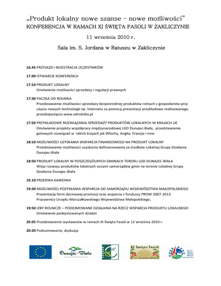 „Produkt lokalny nowe szanse – nowe możliwości” KONFERENCJA W RAMACH XI ŚWIĘTA FASOLI W ZAKLICZYNIE 11 września 2010 r. Sala im. S. Jordana w Ratuszu w Zakliczynie 16.45 PRZYJAZD I REJESTRACJA UCZESTNIKÓW 17.00 OTWARCIE KONFERENCJI 17:10 PRODUKT LOKALNY Omówienie możliwości sprzedaży i regulacji prawnych 17:30 PACZKA OD ROLNIKA Przedstawienie możliwości sprzedaży bezpośredniej produktów rolnych z gospodarstw przy użyciu nowych technologii np. Internetu za pomocą prezentacji przykładowo realizowanego przedsięwzięcia www.odrolnika.pl 17:50 PRZYKŁADOWE ROZWIĄZANIA SPRZEDAŻY PRODUKTÓW LOKALNYCH W KRAJACH UE Omówienie projektu współpracy międzynarodowej LGD Dunajec-Biała, przedstawienie gotowych rozwiązań w takich krajach jak Włochy, Anglia, Francja i inne 18:10 MOŻLIWOŚCI UZYSKANIA WSPARCIA FINANSOWEGO NA PRODUKT LOKALNY Przedstawienie możliwości uzyskania dofinansowania ze środków Lokalnej Grupy Działania Dunajec-Biała 18:50 PRODUKT LOKALNY W POSZCZEGÓLNYCH GMINACH TERENU LGD DUNAJEC-BIAŁA Wizja rozwoju produktów lokalnych oczami samorządów gmin na terenie Lokalnej Grupy Działania Dunajec-Biała 19.10 PRZERWA KAWOWA 19:30 MOŻLIWOŚCI POZYSKANIA WSPARCIA OD SAMORZĄDU WOJEWÓDZTWA MAŁOPOLSKIEGO Prezentacja form darmowej promocji oraz wsparcia z funduszy PROW 2007-2013. Pracownicy Urzędu Marszałkowskiego Województwa Małopolskiego. 19:50 IZBY ROLNICZE – PODEJMOWANE DZIAŁANIA NA RZECZ WSPARCIA PRODUKTU LOKALNEGO Omówienie podejmowanych działań 20.05 Przedstawienie wystawców w ramach XI Święta Fasoli w 12 września 2010 r. 20:20 Podsumowanie, dyskusja