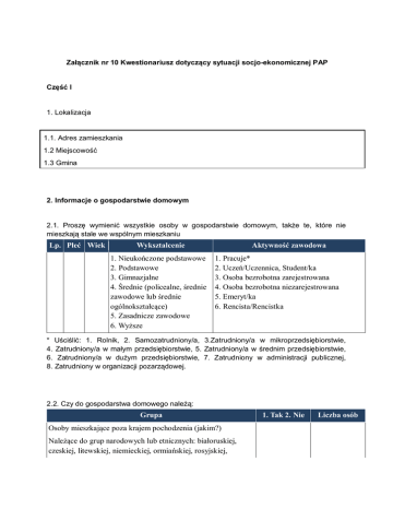 Załącznik nr 10 Kwestionariusz dotyczący sytuacji socjo-ekonomicznej PAP Część I 1. Lokalizacja 1.1. Adres zamieszkania 1.2 Miejscowość 1.3 Gmina 2. Informacje o gospodarstwie domowym 2.1. Proszę wymienić wszystkie osoby w gospodarstwie domowym, także te, które nie mieszkają stale we wspólnym mieszkaniu Lp. Płeć Wiek Wykształcenie 1. Nieukończone podstawowe 2. Podstawowe 3. Gimnazjalne 4. Średnie (policealne, średnie zawodowe lub średnie ogólnokształcące) 5. Zasadnicze zawodowe 6. Wyższe Aktywność zawodowa 1. Pracuje* 2. Uczeń/Uczennica, Student/ka 3. Osoba bezrobotna zarejestrowana 4. Osoba bezrobotna niezarejestrowana 5. Emeryt/ka 6. Rencista/Rencistka * Uściślić: 1. Rolnik, 2. Samozatrudniony/a, 3.Zatrudniony/a w mikroprzedsiębiorstwie, 4. Zatrudniony/a w małym przedsiębiorstwie, 5. Zatrudniony/a w średnim przedsiębiorstwie, 6. Zatrudniony/a w dużym przedsiębiorstwie, 7. Zatrudniony w administracji publicznej, 8. Zatrudniony w organizacji pozarządowej. 2.2. Czy do gospodarstwa domowego należą: Grupa Osoby mieszkające poza krajem pochodzenia (jakim?) Należące do grup narodowych lub etnicznych: białoruskiej, czeskiej, litewskiej, niemieckiej, ormiańskiej, rosyjskiej, 1. Tak 2. Nie Liczba osób słowackiej, ukraińskiej, żydowskiej, karaimskiej, łemkowskiej, romskiej, tatarskiej. Osoby z niepełnosprawnościami (jakimi?) Osoby przewlekle chore Osoby starsze wymagające intensywnej opieki Część II 2.3. Dochody gospodarstwa domowego Źródło Dochód miesięczny Praca najemna Prowadzenie przedsiębiorstwa (podać branżę) Gospodarstwo indywidualne w rolnictwie Wynajem nieruchomości Emerytura Renta Zasiłki Wsparcie rodziny/przyjaciół (wskazać miejsce aktualnego zamieszkania: za granicą, w innej miejscowości w Polsce, w tej samej miejscowości) Inne Razem 2.4. Wydatki miesięczne Źródła wydatków Żywność i napoje bezalkoholowe Napoje alkoholowe i wyroby tytoniowe Odzież i obuwie Użytkowanie mieszkania i nośniki energii Zdrowie Transport Średnie miesięczne kwoty Komunikacja Rekreacja i kultura Edukacja Restauracja i hotele Koszty uprawy ziemi Inne 2.5. Przedmioty stałego użytkowania Nazwa 1. Tak 2. Nie Ilość Rodzaj 1. Tak 2. Nie Hektary Telewizor Komputer Pralka Lodówka Zmywarka Samochód Zwierzęta hodowlane Krowa Owca Świnia Koza Drób Koń Inne (jakie?) Maszyny rolnicze (jakie?) 3. Własność ziemi Pole uprawne Sad Pastwisko Ogród warzywny Ogródek działkowy Ziemia nieuprawna Razem 4. Uprawa Uprawa Obszar (ha) Plony (tony)/rok Przychód/rok Zboża Ziemniaki Owoce Warzywa Kukurydza Inne Razem 5. Inne nieruchomości Lp. Funkcja budynku 1. Mieszkalny 2. Komercyjny 3. Gospodarczy Inne Wiek budynku Liczba pięter Powierzchnia (m2) Typ 1. Tymczaso wy 2. Stały Część III 6. Czas wolny, kultura, rekreacja, lokalna tożsamość kulturowa 6.1. W jaki sposób spędza Pan/Pani czas wolny? Aktywność Codziennie Raz – trzy razy w tygodniu Raz – trzy Co razy w miesiąc, miesiącu dwa Nigdy Oglądanie telewizji Granie w gry komputerowe Czytanie książek Czytanie gazet Oglądanie filmów Korzystanie z Internetu Wyjazdy do innego miasta Wyjście do kina Wyjście do teatru Wyjście na koncert Spotkania ze znajomymi (gdzie? w domu, w lokalach, na świeżym powietrzu?) Gry towarzyskie Spacerowanie Uprawianie sportu (jakiego?) Wycieczki, podróżowanie Inne 6.2. Z jakich instytucji korzysta Pan/Pani w swojej miejscowości? (szkoły, biblioteki, urzędy pracy, GOPS, orliki, etc.) 6.3. Jakie są według Pani/Pana najważniejsze instytucje w tej miejscowości? 6.4. Jakie są według Pani/Pana najważniejsze miejsca w tej miejscowości? 6.5. Jakie są według Pani/Pana najważniejsze obiekty/budynki w tej miejscowości?