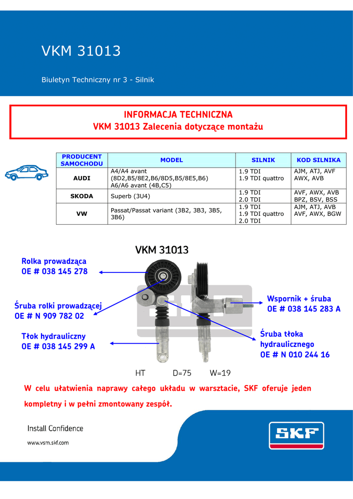 VKM 31013 Biuletyn Techniczny nr 3 - Silnik INFORMACJA TECHNICZNA VKM 31013 Zalecenia dotyczące montażu PRODUCENT SAMOCHODU AUDI SKODA VW MODEL A4/A4 avant (8D2,B5/8E2,B6/8D5,B5/8E5,B6) A6/A6 avant (4B,C5) Superb (3U4) Passat/Passat variant (3B2, 3B3, 3B5, 3B6) SILNIK KOD SILNIKA 1.9 TDI 1.9 TDI quattro AJM, ATJ, AVF AWX, AVB 1.9 2.0 1.9 1.9 2.0 AVF, BPZ, AJM, AVF, TDI TDI TDI TDI quattro TDI AWX, AVB BSV, BSS ATJ, AVB AWX, BGW Rolka prowadząca OE # 038 145 278 Śruba rolki prowadzącej OE # N 909 782 02 Tłok hydrauliczny OE # 038 145 299 A Wspornik + śruba OE # 038 145 283 A Śruba tłoka hydraulicznego OE # N 010 244 16 W celu ułatwienia naprawy całego układu w warsztacie, SKF oferuje jeden kompletny i w pełni zmontowany zespół. VKM 31013 Biuletyn Techniczny nr 3 - Silnik VKM 31013 = Jeden kompletny i zmontowany zespół! Rozwiązanie SKF = 1 artykuł (jeden kompletny i zmontowany zespół) Rozwiązanie producenta = 5 artykułów (Wspornik + śruba / Rolka prowadząca + Śruba mocująca rolkę / Tłok hydrauliczny + Śruba mocująca tłok) VKM 31013 Śruba rolki prowadzącej Hydraulic piston screw Bracket screw Klasa śruby producenta* 8.8 10.9 8.8 Klasa śruby stosowanej przez SKF* 8.8 10.9 8.8 * Klasa śruby określa jej sprężystość i wytrzymałość Alternator Sprzęgło wiskotyczne VKM 31013 (Napinacz) Wspomaganie kierownicy Klimatyzacja VKMV 4PK855 (Pasek napędu klimatyzacji) Wał korbowy VKMV 5PK1432 (Pasek napędu alternatora) 31059 (Tensioner) VKMVKM 31059 (Napinacz) Powyższy schemat pokazuje, że wszystkie podzespoły (alternator, wspom. kier., klimatyzacja) są napędzane paskami. Z tego powodu zalecamy jednoczesną wymianę tych pasków, pamiętając o zachowaniu długości stosowanej przez producenta! VKM 31013 Biuletyn Techniczny nr 3 - Silnik VKM 31013 INSTRUKCJA MONTAŻU - Przed założeniem napinacza VKM 31013 zaleca się oczyścić otwór wspornika alternatora. Bez tej operacji, może wystąpić problem z dokręceniem śruby. - Załóż napinacz VKM 31013 na wspornik alternatora. Przy dokręcaniu śruby, sprawdź położenie o-ringu (znajduje się on na gwincie śruby). Źle założony o-ring to problem z dokręceniem śruby i nieprawidłowa praca uszczelnienia. O-ring założony prawidłowo Obróć klucz 19 przeciwnie do ruchu wskazówek zegara w celu zwolnienia VKM 31013. Załóż pasek na tworzywową rolkę prowadzącą. Po założeniu paska na rolkę, zwolnij powoli klucz 19 w celu przywrócenia prawidłowego napięcia paska. O-ring założony nieprawidłowo Prawidłowy moment dokręcenia (śruby wspornika) wynosi 25 Nm. Prawidłowe napięcie VKM 31013 jest ustalane poprzez zastosowanie paska o odpowiedniej długości! Czynność ta powinna być wykonywana bardzo ostrożnie, ponieważ pasek jest bardzo mocno napięty i ześlizgnięcie się klucza może spowodować poważne obrażenia! VKM 31013 Biuletyn Techniczny nr 3 - Silnik W celu profesjonalnego wykonania naprawy zaleca się, przy wymianie napinacza VKM 31013, nie podejmować zbędnego ryzyka i wymienić wszystkie inne elementy zawarte w następujących zestawach VKMA: Modele bez klimatyzacji VKMA 31000 VKMV 5PK1432 (napęd alternatora) VKM 31013 (napęd alternatora) Modele z klimatyzacją VKMA 31020 VKMV 5PK1432 (napęd alternatora) VKM 31013 (napęd alternatora) VKMV 4PK855 (napęd klimatyzacji) VKM 31059 (napęd klimatyzacji) Długość paska stosowanego przez producenta samochodu (z dokładnością do milimetra) ma kluczowe znaczenie dla prawidłowej pracy po naprawie! Niebezpieczeństwo: zła długość pasa (za krótki lub za długi) powoduje nieprawidłowe napięcie pasa w przekładni pasowej napędzającej elementy osprzętu silnika. W celu uniknięcia ewentualnych reklamacji i zapewnienia prawidłowego wykonania usługi wymieniaj zawsze cały zestaw VKMA!