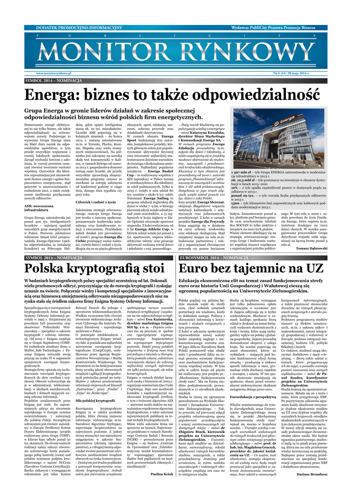 Wydawca: PubliCity Prasowa Promocja Biznesu DODATEK PROMOCYJNO-INFORMACYJNY Nr 4 (41) 28 maja 2014 r. www.monitorrynkowy.pl SYMBOL 2014 – NOMINACJA Energa: biznes to także odpowiedzialność Grupa Energa w gronie liderów działań w zakresie społecznej odpowiedzialności biznesu wśród polskich firm energetycznych. Dostarczanie energii elektrycznej to nie tylko biznes, ale także odpowiedzialność za zrównoważony rozwój. Podejmując to wyzwanie Grupa Energa stara się kłaść duży nacisk na odpowiedzialne sąsiedztwo, w tym przede wszystkim wspieranie i rozwój lokalnych społeczności. Zarząd wychodzi bowiem z założenia, że rozwój powinien oznaczać również tworzenie wartości wspólnej. Oczywiście dla klientów najważniejsza jest niezawodność dostaw energii i ogólne bezpieczeństwo energetyczne, stąd priorytet w unowocześnianiu i rozbudowie sieci, a także zwiększenie możliwości przyłączania nowych odbiorców. AMI: nowoczesna infrastruktura Grupa Energa zainstalowała już ponad 400 tys. inteligentnych liczników – najwięcej spośród wszystkich grup energetycznych w Polsce. Pierwsze, pilotażowe wdrożenie Smart Grid przeprowadziła Energa-Operator (spółka odpowiedzialna za instalację liczników) na Półwyspie Hel- skim, gdzie spięto inteligentną siecią ok. 10 tys. mieszkańców. Liczniki AMI pojawiają się w kolejnych miastach – do końca 2014 r. zostaną zainstalowane m.in. w Toruniu, Płocku, Koninie, Słupsku oraz wielu mniejszych miejscowościach. Na półmetku jest zakrojony na szeroką skalę test konsumencki w Kaliszu, w ramach którego od czerwca 2013 r. gospodarstwa domowe testują same liczniki, ale przede wszystkim sprawdzają eksperymentalne programy cenowe ze stawkami za energię zależnymi od konkretnej godziny w ciągu dnia, danego dnia tygodnia czy pory roku. Człowiek i radość z życia Założeniem strategii zrównoważonego rozwoju Grupy Energa jest troska o interesy społeczne, poszanowanie środowiska naturalnego oraz kształtowanie relacji z otoczeniem. Przykładem takich działań jest prowadzony od 2008 r. program Energa dla Ciebie promujący ważne wartości: rozwój dzieci i radość z życia. Skupia się on na pięciu głównych obszarach: sport, edukacja, mecenat, ochrona przyrody oraz działalność charytatywna. W ramach obszaru Energa Sport funkcjonują trzy autorskie, kompleksowe projekty, których głównym celem jest popularyzowanie aktywności fizycznej oraz stwarzanie najbardziej utalentowanym dzieciom warunków do treningu i doskonalenia umiejętności. Najbardziej popularna inicjatywa – Energa Basket Cup – to realizowany wspólnie z SZS największy w Polsce turniej w minikoszykówce dla młodzieży ze szkół podstawowych. Tylko w 2013 r. wzięło w nim udział 80 tys. uczniów z około 6 tys. szkół. Natomiast Energa Sailing to program edukacji żeglarskiej dla dzieci w wieku 7–9 lat, w którego pierwszej edycji wzięło udział ponad 1000 uczestników, a 13 najlepszych w kraju żeglarzy w klasie Optimist otrzymało sportowe stypendia. Z kolei realizowany od 6 lat Energa Athletic Cup, w którym udział wzięło już ponad 5 tys. sportowców, wspiera lekkoatletyczne talenty oraz promuje aktywność ruchową wśród dzieci i młodzieży z woj. pomorskiego. SYMBOL 2014 – NOMINACJA – Duży nacisk kładziemy na popularyzację wiedzy o energetyce – mówi Katarzyna Kowalska, dyrektor Biura Marketingu i Komunikacji Energa SA. – W ramach programu Energa Edukacja prowadzimy m.in. zajęcia dla dzieci i młodzieży, a także angażujemy się w projekty naukowe skierowane do studentów, nauczycieli i przedstawicieli środowiska akademickiego. Kluczowy w tym obszarze jest prowadzony od 2010 r. autorski program „Planeta Energii” adresowany do nauczycieli i uczniów klas I–III szkół podstawowych. Dotychczas w jego trzech edycjach wzięło udział prawie 110 tys. dzieci z całej Polski. Inny projekt, Energa Mecenat, obejmuje długofalowe wsparcie instytucji kulturalnych i artystycznych oraz jednorazowych przedsięwzięć. Z kolei w ramach projektu Energa dla Przyrody firma angażuje się w działania na rzecz ochrony środowiska oraz edukację ekologiczną. Stąd inicjatywy mające na celu m.in. budowanie partnerstwa i relacji z organizacjami chroniącymi przyrodę czy pomoc bocianom 1 397 mln zł – tyle Grupa ENERGA zainwestowała w modernizację infrastruktury w 2013 r. ok. 12,5 mld zł – tyle przeznaczy na inwestycje w obszarze dystrybucji w latach 2013–2021 12% – o tyle spadła częstotliwość przerw w dostawach prądu na odbiorcę w 2013 r. ponad 29 tys. – o tyle wzrosła liczba przyłączonych odbiorców w 2013 r. 1300 – tyle kilometrów linii napowietrznych oraz kablowych poddano modernizacji w 2013 r. białym. Zamontowanie ponad 9 tys. platform pod bocianie gniazda oraz uruchomienie infolinii 801 BOCIAN to tylko niektóre z inicjatyw na rzecz tych ptaków. Ważny element składający się na strategię zrównoważonego rozwoju Grupy i budowania wartości wspólnej stanowi współpraca z organizacjami pożytku publicz- nego. W tym celu w 2009 r. została powołana do życia Fundacja Energa, która wspiera m.in. instytucje działające na rzecz dzieci chorych. W wyniku zaangażowania pracowników Grupa dotychczas wsparła setki organizacji na łączną kwotę ponad 3 mln zł. Tomasz Dąbrowski EUROSYMBOL 2014 – NOMINACJA Polska kryptografią stoi Euro bez tajemnic na UZ W badaniach kryptograficznych polscy specjaliści uczestniczą od lat. Dokonali wielu przełomowych odkryć, przyczyniając się do rozwoju kryptografii i zyskując uznanie na świecie. Połączenie wiedzy i kompetencji specjalistów z innowacyjnością oraz biznesową umiejętnością odkrywania niezagospodarowanych nisz na rynku stało się źródłem sukcesu firmy Enigma Systemy Ochrony Informacji. Edukacja ekonomiczna elit na temat zasad funkcjonowania strefy euro oraz historia Unii Gospodarczej i Walutow