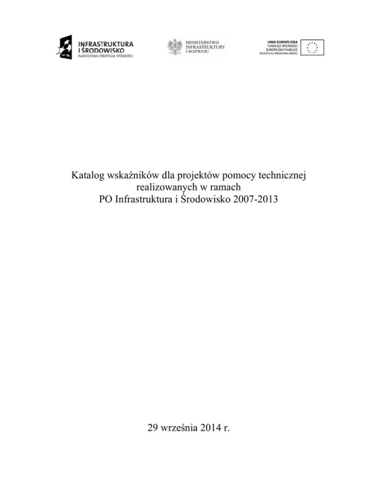 Katalog wskaźników dla projektów pomocy technicznej realizowanych w ramach PO Infrastruktura i Środowisko 2007-2013 29 września 2014 r. Zasady wprowadzania wskaźników do KSI (SIMIK 07-13) ...................................................3 Projekty PT POIiŚ realizowane w latach 2007-2009 ...........................................................3 Projekty PT POIiŚ realizowane począwszy od 2010 r. ........................................................3 Wskaźniki wprowadzane do KSI (SIMIK 07-13) ................................................................3 Wskaźniki dla działań 14.1, 15.1 oraz 15.4 .............................................................................4 1. Liczba utworzonych miejsc pracy finansowanych ze środków programu ........................4 2. Liczba zakupionych zestawów komputerowych ..............................................................5 3. Liczba przeprowadzonych szkoleń, warsztatów, treningów, wizyt studyjnych ................6 4. Liczba przeszkolonych osób ...........................................................................................7 Wskaźniki dla działań 14.2 i 15.2 ...........................................................................................9 5. Liczba opublikowanych tekstów, ulotek i broszur promujących POIiŚ ............................9 6. Liczba zorganizowanych konferencji, seminariów, warsztatów, konsultacji oraz spotkań o charakterze informacyjnym ............................................................................................10 7. Liczba przeszkolonych osób .........................................................................................11 Wskaźnik dla działań 14.3 i 15.3 ..........................................................................................12 8. Liczba zrealizowanych badań ewaluacyjnych oraz analiz i ekspertyz ............................12 Zasady wprowadzania wskaźników do KSI (SIMIK 07-13) Projekty PT POIiŚ realizowane w latach 2007-2009 W ramach KSI (SIMIK 07-13) wskaźniki produktu oraz rezultatu zostały wprowadzane w odniesieniu do całego projektu przez IZ (jako suma wartości wskaźników: IP, IP-II, w przypadku sektora transport również GDDKiA oraz PKP PLK S.A.) na etapie wprowadzania umowy o dofinansowanie na realizację ww. projektów zawartej pomiędzy IZ a IP. Wobec powyższego IP wprowadzając umowy podpisane z IW/GDDKiA/PKP PLK S.A. nie powinna wprowadzać wskaźników odrębnie (aby uniknąć dublowania wartości wskaźników). To samo dotyczy również wniosków o płatność. W odniesieniu do projektów z lat 2007-2009 wyjątkowo, w przypadku gdy w ramach danego działania na poziomie IP nie zaplanowano żadnych wydatków natomiast zaplanowano wydatki na poziomie IW: - IZ wprowadza wniosek o dofinansowanie w części dot. IW uwzględniający zaplanowaną kwotę; - IP wprowadza umowę o dofinansowanie pod ww. wniosek, w którym uwzględnia również informację o planowanych do osiągnięcia wskaźnikach. Projekty PT POIiŚ realizowane począwszy od 2010 r. W ramach projektów PT POIiŚ realizowanych począwszy od 2010 r. - IP jest zobowiązana do wprowadzania wskaźników w odniesieniu do umów podpisywanych z IW/GDDKiA/PKP PLK S.A. oraz wniosków o płatność składanych przez IW/GDDKiA/PKP PLK S.A. do IP. Powyższe wynika z tego, że w latach 2007-2009 wnioski o dofinansowanie zawierały zagregowane dane nt. wskaźników realizowanych w ramach sektora oraz IP przedkładały do IZ sektorowe wnioski o płatność. Począwszy od 2010 r., po zmianach systemu wdrażania PT POIiŚ, we wnioskach o dofinansowanie przedstawiane są wskaźniki w podziale na poszczególnych beneficjentów, a dodatkowo wnioski o płatność od IW/GDDKiA/PKP PLK S.A. zatwierdzane są na poziomie IP (brak sektorowego wop). W przypadku ostatniego RPD na lata 2014-2015 – wskaźniki dodatkowo przedstawione są w podziale na lata (sposób przedstawiania wskaźników według tego podziału został opisany szczegółowo w Instrukcji wypełniania wniosku o dofinansowanie ze środków pomocy technicznej POIiŚ RPD związanych z realizacją POIiŚ). Wskaźniki wprowadzane do KSI (SIMIK 07-13) Do KSI (SIMIK 07-13) wprowadzane są następujące wskaźniki (produktu/rezultatu) w odniesieniu do projektów pomocy technicznej realizowanych począwszy od 2010 r. Uwaga: do KSI nie wprowadza się wszystkich wskaźników ujętych w „Katalogu wskaźników dla projektów pomocy technicznej realizowanych w ramach POIiŚ”. W poniższej tabeli zostały przedstawione te wskaźniki produktu/rezultatu z ww. Katalogu wskaźników, które należy wprowadzić do KSI (SIMIK 07-13) oraz odpowiadające im wskaźniki (nazwy) w systemie KSI. Wskaźnik produktu/rezultatu: Wskaźnik produktu/rezultatu: Katalog wskaźników KSI (SIMIK 07-13) DZIAŁANIE 14.1/15.1/15.4 Wskaźniki produktu: 01. Liczba utworzonych miejsc pracy Liczba miejsc pracy sfinansowanych ze finansowanych ze środków programu środków programu (pomocy technicznej) 02. Liczba zakupionych zestawów komputerowych Liczba zakupionych zestawów komputerowych (laptopy, serwery, komputery) 03. Liczba przeprowadzonych szkoleń, warsztatów, Liczba przeprowadzonych szkoleń, warsztatów, treningów, wizyt studyjnych treningów, wizyt studyjnych Wskaźniki rezultatu: 04. Liczba przeszkolonych osób Liczba przeszkolonych osób DZIAŁANIE 14.2/15.2 Wskaźniki produktu: 06. Liczba zorganizowanych konferencji, Liczba zorganizowanych konferencji, spotkań, seminariów, warsztatów, konsultacji oraz spotkań o seminariów charakterze informacyjnym DZIAŁANIE 14.3/15.3 Wskaźniki produktu: Liczba ocen, ekspertyz, analiz, studiów, 08. Liczba zrealizowanych badań ewaluacyjnych opracowań i koncepcji wykonanych przez oraz analiz i ekspertyz ewaluatorów zewnętrznych Wskaźniki dla działań 14.1, 15.1 oraz 15.4 1. Liczba utworzonych miejsc pracy finansowanych ze środków programu Wskaźnik Kod 01 Nazwa wskaźnik