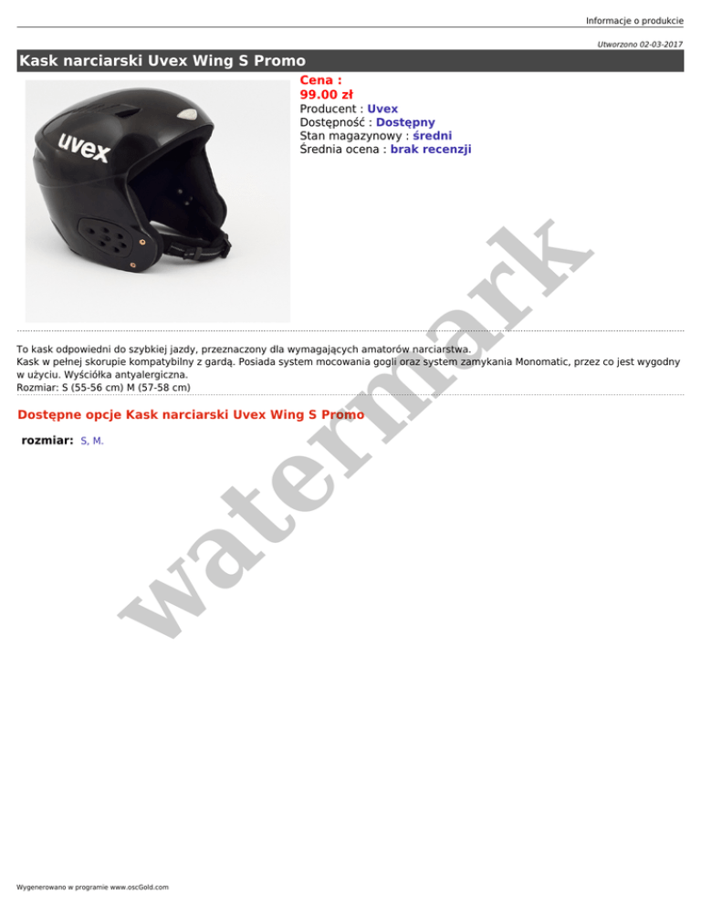 Informacje o produkcie Utworzono 02-03-2017 Kask narciarski Uvex Wing S Promo Cena : 99.00 zł er m ar k Producent : Uvex Dostępność : Dostępny Stan magazynowy : średni Średnia ocena : brak recenzji To kask odpowiedni do szybkiej jazdy, przeznaczony dla wymagających amatorów narciarstwa. Kask w pełnej skorupie kompatybilny z gardą. Posiada system mocowania gogli oraz system zamykania Monomatic, przez co jest wygodny w użyciu. Wyściółka antyalergiczna. Rozmiar: S (55-56 cm) M (57-58 cm) Dostępne opcje Kask narciarski Uvex Wing S Promo w at rozmiar: S, M. Wygenerowano w programie www.oscGold.com