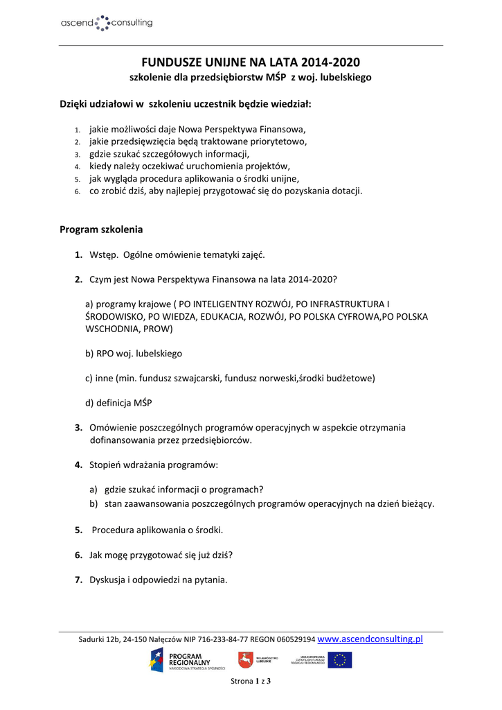 FUNDUSZE UNIJNE NA LATA 2014-2020 szkolenie dla przedsiębiorstw MŚP z woj. lubelskiego Dzięki udziałowi w szkoleniu uczestnik będzie wiedział: 1. 2. 3. 4. 5. 6. jakie możliwości daje Nowa Perspektywa Finansowa, jakie przedsięwzięcia będą traktowane priorytetowo, gdzie szukać szczegółowych informacji, kiedy należy oczekiwać uruchomienia projektów, jak wygląda procedura aplikowania o środki unijne, co zrobić dziś, aby najlepiej przygotować się do pozyskania dotacji. Program szkolenia 1. Wstęp. Ogólne omówienie tematyki zajęć. 2. Czym jest Nowa Perspektywa Finansowa na lata 2014-2020? a) programy krajowe ( PO INTELIGENTNY ROZWÓJ, PO INFRASTRUKTURA I ŚRODOWISKO, PO WIEDZA, EDUKACJA, ROZWÓJ, PO POLSKA CYFROWA,PO POLSKA WSCHODNIA, PROW) b) RPO woj. lubelskiego c) inne (min. fundusz szwajcarski, fundusz norweski,środki budżetowe) d) definicja MŚP 3. Omówienie poszczególnych programów operacyjnych w aspekcie otrzymania dofinansowania przez przedsiębiorców. 4. Stopień wdrażania programów: a) gdzie szukać informacji o programach? b) stan zaawansowania poszczególnych programów operacyjnych na dzień bieżący. 5. Procedura aplikowania o środki. 6. Jak mogę przygotować się już dziś? 7. Dyskusja i odpowiedzi na pytania. Sadurki 12b, 24-150 Nałęczów NIP 716-233-84-77 REGON 060529194 www.ascendconsulting.pl Strona 1 z 3 Grupa odbiorcza: Osoby zainteresowane otrzymaniem dotacji z funduszów unijnych zwłaszcza przedsiębiorstwa MŚP oraz osoby planujące rozpoczęcie działalności gospodarczej. Forma szkolenia: Metodyka szkolenia obejmuje dyskusję z uczestnikami oraz udzielanie odpowiedzi na zgłaszane przez nich pytania. Szkolenie uwzględnia praktyczne przykłady dla omawianych zagadnień. Termin i miejsce szkolenia: 24 czerwiec 2015r., godz. 9.00-13.00; Lublin, Business Link ul. Lipowa 4 Osoba prowadząca: Bartosz Kowalik – Ekspert z zakresu pozyskiwania środków finansowych dla różnych beneficjentów (min. przedsiębiorstwa MŚP, JST, NGO) w ramach Funduszów Europejskich w latach 2007-2013, funduszów przedakcesyjnych oraz wielu innych (min. środki budżetowe). Założyciel firmy doradczej Ascend Consulting (od 2009r.). Wieloletni doradca biznesowy, trener biznesu i wykładowca szkoleń, min. zakresu funduszy unijnych. Akredytowany ekspert LAWP do działania 1,7 w trzech specjalizacjach (m. in. pozyskiwanie funduszy na rozwój). Z biznesem związany od 2000r., pełnił funkcje zarządzające i kierownicze w kilku przedsiębiorstwach MŚP. Absolwent Wyższej Szkoły Przedsiębiorczości i Administracji w Lublinie, studiów MBA realizowanych we współpracy z University of Illinois (USA) ze specjalności Zarządzanie i Marketing. Członek międzynarodowej organizacji International Project Management Asosiation. Cena szkolenia: Przy wysłaniu formularza zgłoszeniowego do 16 czerwca - 160 zł + 23% VAT od 17.06.2015r. cena wynosi - 200 zł + 23% VAT za udział w szkoleniu jednej osoby. Cena obejmuje: uczestnictwo w zajęciach, materiały szkoleniowe, przerwy kawowe oraz certyfikat uczestnictwa. Na szkoleniu obowiązuje określony limit miejsc. O zakwalifikowaniu do udziału decyduje kolejność zgłoszeń. Zachęcamy do podjęcia decyzji w możliwie szybkim czasie. Kontakt w sprawie szkolenia: Karina Sobieszek Specjalista ds. szkoleń tel: 081 311 76 01 e-mail: [email protected] Sadurki 12b, 24-150 Nałęczów NIP 716-233-84-77 REGON 060529194 www.ascendconsulting.pl Strona 2 z 3 Dodatkowe informacje: W przypadku zgłoszenia się zbyt małej ilości osób termin szkolenia może zostać przesunięty lub odwołany. Sadurki 12b, 24-150 Nałęczów NIP 716-233-84-77 REGON 060529194 www.ascendconsulting.pl Strona 3 z 3