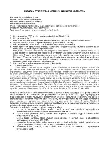 PROGRAM STUDIÓW DLA KIERUNKU INŻYNIERIA KOSMICZNA Kierunek: inżynieria kosmiczna Poziom: studia pierwszego stopnia Profil kształcenia: ogólnoakademicki Forma studiów: stacjonarne Obszar kształcenia: nauki ścisłe, nauki techniczne, kompetencje inżynierskie Dziedziny: nauki fizyczne, nauki techniczne Tytuł zawodowy uzyskiwany przez absolwenta: inżynier 1. 2. 3. 4. 5. 6. Liczba punktów ECTS konieczna do uzyskania kwalifikacji: 210. Liczba semestrów: 7. Opis poszczególnych modułów kształcenia: sylabusy zebrano w osobnym dokumencie. Wymiar, zasady i forma odbywania praktyk: przedstawiono poniżej. Matryca efektów kształcenia: przedstawiono w osobnym dokumencie. Opisy sposobów sprawdzania efektów kształcenia osiąganych przez studenta zawarte są w sylabusach do poszczególnych przedmiotów. Weryfikacja efektów kształcenia dla programu kształcenia jako całości będzie prowadzona przez zespoły do spraw jakości kształcenia Wydziałów współprowadzących kierunek Inżynieria Kosmiczna. Prace te będą koordynowane przez międzywydziałowy zespół programowy nowego kierunku. W ramach ewaluacji jakości kształcenia, poza wynikami weryfikacji wewnętrznej, brane pod uwagę będą m.in. opinie jednostek prowadzących praktyki studenckie, staże podyplomowe i zatrudniających absolwentów. 7. Plan studiów: przedstawiono w osobnym dokumencie. 8. Zasady dyplomowania. Warunkiem uzyskania tytułu inżyniera przez absolwentów kierunku Inżynieria Kosmiczna jest zaliczenie wszystkich przedmiotów składających się na program studiów, przedstawienie pracy dyplomowej i pozytywny wynik egzaminu dyplomowego. Tematy pracy dyplomowej proponowane są przez prowadzących seminaria dyplomowe lub przez nauczycieli akademickich z tytułem naukowym, prowadzących zajęcia dla studentów kierunku. W uzasadnionych wypadkach promotorem pracy dyplomowej może zostać, za zgodą Dziekana Wydziału Fizyki i Astronomii, osoba o odpowiednich kwalifikacjach, reprezentująca jednostkę zewnętrzną. Zasady i formę przeprowadzania egzaminu dyplomowego określa Dziekan Wydziału Fizyki i Astronomii w zgodzie z zasadami określonymi przez Radę Wydziału. Procedura dyplomowania, w tym ocena pracy dyplomowej i egzaminu dyplomowego a także całościowa ocena studiów przeprowadzana jest w zgodzie z zasadami Regulaminu Studiów UZ (Uchwała Senatu nr 522 z dnia 25.04.2012). Wszystkie poniższe wskaźniki zostały wyliczone w oparciu o dane dotyczące czasu pracy studenta wyszczególnione w sylabusach, po przeliczeniu na punkty ECTS. Do zajęć wymagających bezpośredniego udziału nauczycieli akademickich wliczono konsultacje i egzaminy. Do zajęć o charakterze praktycznych wliczono czas poświęcony na przygotowanie do tych zajęć, wykonanie zadań domowych, opracowanie sprawozdań, przygotowanie do bieżących sprawdzianów i kolokwiów oraz konsultacje związane z zajęciami praktycznymi. W wypadku modułów wybieralnych wzięto pod uwagę odpowiednie wartości średnie. Sumaryczne wskaźniki charakteryzujące program studiów: • Łączna liczba punktów, którą student musi uzyskać na zajęciach wymagających bezpośredniego udziału nauczycieli akademickich: 106 ECTS. • Łączna liczba punktów, którą student musi uzyskać w ramach zajęć z zakresu nauk podstawowych: 55 ECTS. • Łączna liczba punktów, którą student musi uzyskać w ramach zajęć o charakterze praktycznym: minimalnie 128 ECTS. • Minimalna liczba punktów, którą student musi uzyskać realizując moduły kształcenia na zajęciach ogólnouczelnianych lub na innym kierunku studiów: 1 ECTS. • Minimalna liczba punktów, którą student musi uzyskać na zajęciach z wychowania fizycznego: 1 ECTS. Liczba punktów ECTS, którą student uzyskuje realizując moduły kształcenia podlegające wyborowi: 64, co stanowi 30.4% całkowitej liczby punktów ECTS dla kierunku Inżynieria Kosmiczna. Liczby punktów dla modułów wybieralnych dla poszczególnych semestrów podane są w Planie Studiów. Procentowy udział liczby punktów ECTS dla każdego z obszarów kształcenia w łącznej liczbie punktów ECTS: • obszar nauk ścisłych 96.3% (202.3 punkty ECTS) • obszar nauk technicznych 3.7% (7.7 punktów ECTS) Sposób wyliczenia wskaźników dla obu obszarów nauk opisano w dokumencie przedstawiającym Efekty Kształcenia. Wymiar, zasady i forma odbywania praktyk dla kierunku Inżynieria Kosmiczna 1. Wymiar i harmonogram praktyki Praktyka zawodowa zaplanowana jest na przerwę wakacyjną (czerwiec – wrzesień) po VI semestrze studiów. Praktyka realizowana jest przez 6 tygodni, w całkowitym wymiarze 150 godzin, co odpowiada 5 punktom ECTS. Formalne zaliczenie praktyki następuje w VII semestrze. 2. Cel i charakter praktyki Głównym celem praktyki jest zdobycie przez studentów doświadczenia zawodowego w jednostce przemysłowej lub w instytucji badawczej. Podczas praktyki studenci zapoznają się z zasadami pracy obowiązującymi w zakładzie pracy, organizacją jednostki i procesem realizacji zadań wykonywanych przez zakład. Obserwując działalność jednostki oraz wykorzystując wiedzę i umiejętności zdobyte podczas studiów podczas wykonywania przydzielonych zadań, studenci poznają wymagania pracy zawodowej. 3. Nadzór nad przebiegiem praktyk Przebieg praktyk jest nadzorowany przez opiekuna praktyk, powołanego przez Dziekana Wydziału Fizyki i Astronomii. Opieka polega na kontroli realizacji celów i harmonogramu praktyk oraz nawiązaniu niezbędnych kontaktów z jednostkami prowadzącymi praktyki. 4. Miejsce i termin odbycia praktyki oraz przygotowanie praktyk Miejsce i termin odbycia praktyki wybierają studenci. Dodatkowo Wydziały uczestniczące w prowadzeniu zajęć dla studentów nowego kierunku proponują listę jednostek do odbycia praktyk. W miarę rozwoju współpracy z zewnętrznymi partnerami kierunku Inżynieria Kosmiczna poszerzana będzie oferta praktyk w jednostkach krajowych i za