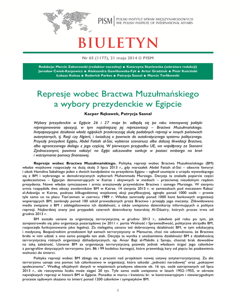 Nr 65 (1177), 21 maja 2014 © PISM .. . .. . Redakcja: Marcin Zaborowski (redaktor naczelny) Katarzyna Staniewska (sekretarz redakcji) Jarosław Ćwiek-Karpowicz Aleksandra Gawlikowska-Fyk Artur Gradziuk Piotr Kościński Łukasz Kulesa Roderick Parkes Patrycja Sasnal Marcin Terlikowski . Represje wobec Bractwa Muzułmańskiego a wybory prezydenckie w Egipcie Kacper Rękawek, Patrycja Sasnal Wybory prezydenckie w Egipcie 26 i 27 maja br. odbędą się po roku intensywnej polityki represjonowania opozycji, w tym najsilniejszej jej reprezentacji – Bractwa Muzułmańskiego. Antyopozycyjne działania władz egipskich przekraczają skalę podobnych represji w innych państwach autorytarnych, tj. Rosji czy Algierii, i świadczą o powrocie do autokratycznego systemu politycznego. Przyszły prezydent Egiptu, Abdel Fattah al-Sisi, wybierze scenariusz albo dalszej likwidacji Bractwa, albo ograniczonego dialogu z jego częścią. W pierwszym przypadku UE, we współpracy ze Stanami Zjednoczonymi, powinna nałoŜyć na Egipt odczuwalne sankcje w postaci embarga na broń i wstrzymania pomocy finansowej. Represje wobec Bractwa Muzułmańskiego. Politykę represji wobec Bractwa Muzułmańskiego (BM) władze wojskowe rozpoczęły na duŜą skalę 3 lipca 2013 r., gdy marszałek Abdel Fattah al-Sisi – obecnie faworyt i obok Hamdina Sabahiego jeden z dwóch kandydatów na prezydenta Egiptu – ogłosił usunięcie z urzędu wywodzącego się z BM i wybranego w demokratycznych wyborach Muhammada Mursiego. Decyzja ta znalazła poparcie części społeczeństwa – Egipcjan demonstrujących w Kairze i aktywnych w mediach – przeciwnej nieudolnym rządom prezydenta. Nowe władze tymczasowe i armia aresztowały przywódców Bractwa i samego Mursiego. W sierpniu armia rozpędziła dwa obozy zwolenników BM w Kairze. 14 sierpnia 2013 r. w zamieszkach pod meczetem Rabaa’ al-Adawijja w Kairze, podczas kilkugodzinnej wojskowej akcji pacyfikacyjnej, zginęło ponad 1000 osób – prawie tyle samo co na placu Tian’anmen w czerwcu 1989 r. Władze zamroziły ponad 1000 kont bankowych organizacji wspierających BM, zamknęły ponad 100 szkół prowadzonych przez Bractwo i przejęły jego meczety. Zlikwidowano media związane z BM i zdelegalizowano ich działalność, a takŜe uwięziono dziennikarzy informujących o polityce represji. Najbardziej znany jest przypadek czterech dziennikarzy katarskiej Al-DŜaziry, których proces trwa od grudnia 2013 r. BM zostało uznane za organizację terrorystyczną w grudniu 2013 r., zaledwie pół roku po tym, jak zarejestrowało się jako organizacja pozarządowa (w 2011 r. partia Wolność i Sprawiedliwość, polityczne skrzydło BM, rozpoczęła funkcjonowanie jako legalna). Za nielegalną uznano teŜ dobroczynną działalność BM, w tym edukacyjną i medyczną. Bezpośrednim pretekstem był zamach terrorystyczny w Mansurze, choć nie udowodniono, Ŝe Bractwo brało w nim udział, a ono samo potępiło ten atak. Decyzja ta wynika z utoŜsamienia działalności BM z działalnością terrorystyczną róŜnych organizacji dŜihadystycznych, np. Ansar Bajt al-Makdis z Synaju, chociaŜ brak dowodów na taką zaleŜność. Uznanie BM za organizację terrorystyczną pozwala jednak władzom ścigać jego członków z paragrafów dotyczących terroryzmu (art. 86 i 99 kodeksu karnego), które przewidują kary od pięciu lat pozbawienia wolności do śmierci. Polityka represji wobec BM zbiega się z pracami nad projektem nowej ustawy antyterrorystycznej. Za akt terroryzmu uznaje ona pomoc lub członkostwo w organizacji, która szkodzi „jedności narodowej” oraz „pokojowi społecznemu”. Według oficjalnych danych w więzieniach przebywa obecnie ok. 16 tys. osób zatrzymanych od lipca 2013 r., ale rzeczywista liczba moŜe sięgać 20 tys. Tyle samo osób uwięziono w latach 1952–1955, w okresie największych represji w historii BM w Egipcie. Ponadto w marcu i kwietniu br. w kontrowersyjnym i niewiarygodnym procesie sądowym skazano na śmierć ponad 1200 członków i sympatyków BM. 1 BM wobec kampanii prezydenckiej. Uznanie BM za organizację terrorystyczną nie oznacza jednak zakończenia przez nie działalności politycznej. Pomimo aresztowań jego członków i rozbicia centralnych struktur, BM istnieje nadal, a jego ramię polityczne – partia Wolność i Sprawiedliwość – jest najwaŜniejszą częścią tzw. Narodowego Sojuszu na rzecz Wspierania Praworządności (NSRWP, zwanego takŜe Sojuszem przeciwko Zamachowi Stanu), który skupia islamistyczne partie polityczne sprzeciwiające się odsunięciu od władzy prezydenta Mursiego. NSRWP podjęło decyzję o bojkocie zbliŜających się wyborów prezydenckich, które określane są przez Sojusz jako „farsa”. W odpowiedzi obaj kandydaci na prezydenta Egiptu, Sisi i Sabahi, jednoznacznie deklarują brak zainteresowania porozumieniem politycznym, choć uwidaczniają się między nimi róŜnice. W swojej kampanii Sisi zapowiedział całkowitą likwidację BM. Sabahi próbuje natomiast zdobyć poparcie szeregowych członków NSRWP deklaracjami o konieczności zwolnienia więźniów politycznych oraz zapewnienia islamistom prawa do pokojowych antyrządowych protestów. Główną formą kontestacji egipskiego porządku politycznego są dla BM i NSRWP demonstracje uliczne po piątkowych modłach oraz częste protesty na terenie kampusów kairskich uniwersytetów. Wystąpienia odbywają się przewaŜnie na egipskiej prowincji lub obrzeŜach miast, a ich celem jest dalsza polityczna mobilizacja zwolenników islamistów wokół hasła niekonstytucyjności tymczasowego prezydenta i rządu oraz nielegalności tegorocznych wyborów prezydenckich. W oficjalnych wystąpieniach niektórzy islamiści dodatkowo próbują formułować ofertę politycznej współpracy skierowaną do środowisk lewicowo-liberalnych, które w teorii mogłyby stać się sojusznikiem BM i NSRWP w walce o pluralizm polityczny i odsunięcie wojska od po