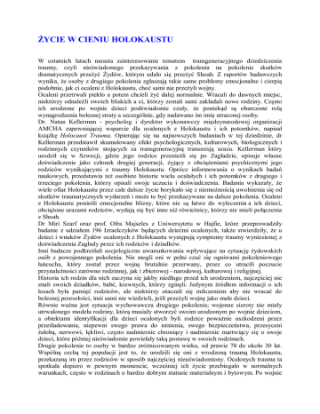 ŻYCIE W CIENIU HOLOKAUSTU W ostatnich latach narasta zainteresowanie tematem transgeneracyjnego dziedziczenia traumy, czyli nieświadomego przekazywania z pokolenia na pokolenie skutków dramatycznych przeżyć Żydów, którym udało się przeżyć Shoah. Z raportów badawczych wynika, że osoby z drugiego pokolenia zgłaszają takie same problemy emocjonalne i cierpią podobnie, jak ci ocaleni z Holokaustu, choć sami nie przeżyli wojny. Ocaleni przetrwali piekło a potem chcieli żyć dalej normalnie. Wracali do dawnych miejsc, niektórzy odnaleźli swoich bliskich a ci, którzy zostali sami zakładali nowe rodziny. Często ich urodzone po wojnie dzieci podświadomie czuły, że poniekąd są obarczone rolą wynagrodzenia bolesnej straty a szczególnie, gdy nadawano im imię utraconej osoby. Dr. Natan Kellerman - psycholog i dyrektor wykonawczy międzynarodowej organizacji AMCHA zapewniającej wsparcie dla ocalonych z Holokaustu i ich potomków, napisał książkę Holocaust Trauma. Opierając się na najnowszych badaniach w tej dziedzinie, dr Kellerman przedstawił skumulowany efekt psychologicznych, kulturowych, biologicznych i rodzinnych czynników stojących za transgeneracyjną transmisją urazu. Kellerman który urodził się w Szwecji, gdzie jego rodzice przenieśli się po Zagładzie, opisuje własne doświadczenie jako członek drugiej generacji, żyjący z obciążeniami psychicznymi jego rodziców wynikającymi z traumy Holokaustu. Oprócz informowania o wynikach badań naukowych, przedstawia też osobiste historie wielu ocalałych i ich potomków z drugiego i trzeciego pokolenia, którzy opisali swoje uczucia i doświadczenia. Badania wykazały, że wiele ofiar Holokaustu przez całe dalsze życie borykało się z niemożnością uwolnienia się od skutków traumatycznych wydarzeń i może to być przekazywane na dalsze pokolenia. Ocaleni z Holokaustu ponieśli emocjonalne blizny, które nie są łatwe do wyleczenia a ich dzieci, obciążone urazami rodziców, wydają się być inne niż rówieśnicy, którzy nie mieli połączenia z Shoah. Dr Miri Szarf oraz prof. Ofra Majseles z Uniwersytetu w Hajfie, które przeprowadziły badanie z udziałem 196 Izraelczyków będących dziećmi ocalonych, także stwierdziły, że u dzieci i wnuków Żydów ocalonych z Holokaustu występują symptomy traumy wyniesionej z doświadczenia Zagłady przez ich rodziców i dziadków. Inni badacze podkreślali socjologiczne uwarunkowania wpływające na sytuację żydowskich osób z powojennego pokolenia. Nie mogli oni w pełni czuć się ogniwami pokoleniowego łańcucha, który został przez wojnę brutalnie przerwany, przez co utracili poczucie przynależności zarówno rodzinnej, jak i zbiorowej - narodowej, kulturowej i religijnej. Historia ich rodzin dla nich zaczyna się jakby niedługo przed ich urodzeniem, najczęściej nie znali swoich dziadków, babć, krewnych, którzy zginęli. Jedynym źródłem informacji o ich losach była pamięć rodziców, ale niektórzy otaczali się milczeniem aby nie wracać do bolesnej przeszłości, inni sami nie wiedzieli, jeśli przeżyli wojnę jako małe dzieci. Równie ważna jest sytuacja wychowawcza drugiego pokolenia; wojenne sieroty nie miały utrwalonego modelu rodziny, którą musiały stworzyć swoim urodzonym po wojnie dzieciom, a obiektami identyfikacji dla dzieci ocalonych byli rodzice poważnie uszkodzeni przez prześladowania, niepewni swego prawa do istnienia, swego bezpieczeństwa, przesyceni żałobą, nerwowi, lękliwi, często nadmiernie chroniący i nadmiernie martwiący się o swoje dzieci, które później nieświadomie powielały taką postawę w swoich rodzinach. Drugie pokolenie to osoby w bardzo zróżnicowanym wieku, od prawie 70 do około 30 lat. Wspólną cechą tej populacji jest to, że urodzili się oni z wrodzoną traumą Holokaustu, przekazaną im przez rodziców w sposób najczęściej nieuświadomiony. Ocalonych trauma ta spotkała dopiero w pewnym momencie, wcześniej ich życie przebiegało w normalnych warunkach, często w rodzinach o bardzo dobrym statusie materialnym i bytowym. Po wojnie utracili wszystko, swoje mienie, rodziny a przede wszystkim zdrowie poprzez maltretowanie w obozach lub długotrwałe życie w ukryciu, głód i rozwijające się nieleczone choroby. Biologiczne wyniszczenie ich organizmów nie pozostało bez wpływu na zdrowie oraz rozwój ich urodzonych po wojnie dzieci. Dodatkowo, obciążenie drugiego pokolenia odziedziczoną traumą Holokaustu zmniejszyło ich odporność na stres, co mogło stać się katalizatorem powstawania wielu groźnych chorób powodujących obniżenie jakości ich życia. A więc drugie pokolenie Żydów wzrastające i żyjące w cieniu Zagłady, również można nazwać ofiarami Holokaustu. Krystyna Podgórska