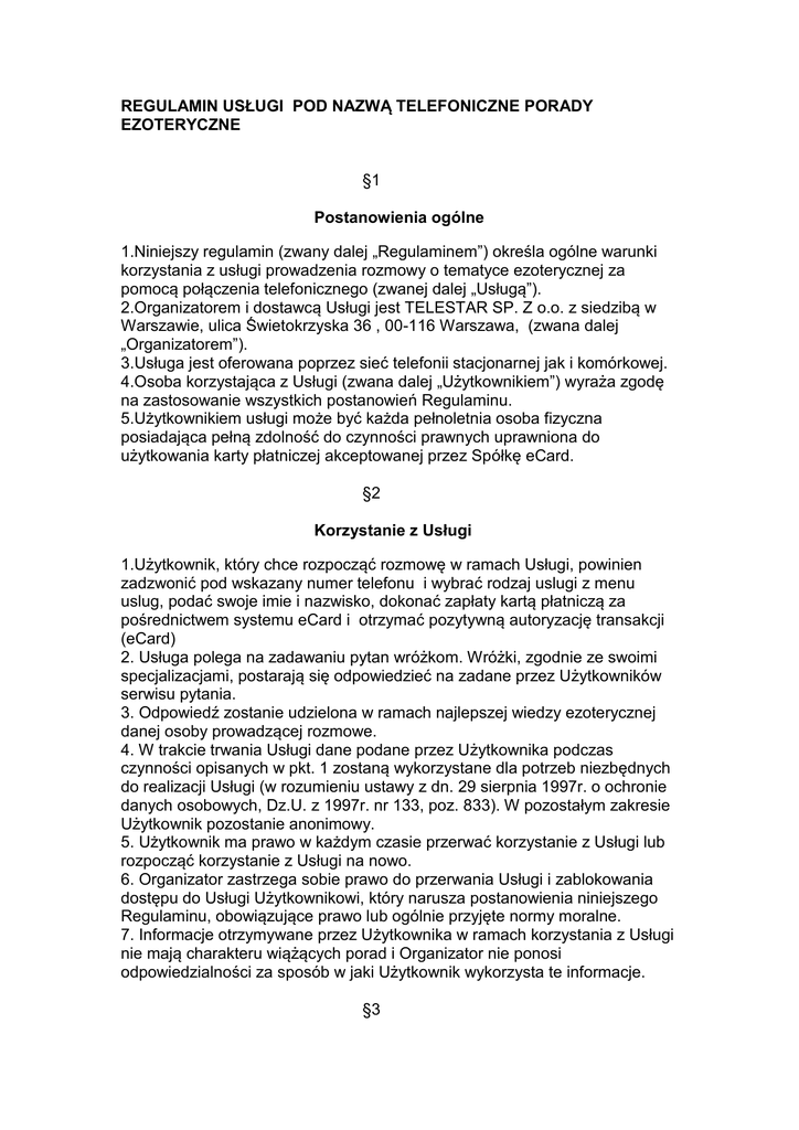 REGULAMIN USŁUGI POD NAZWĄ TELEFONICZNE PORADY EZOTERYCZNE §1 Postanowienia ogólne 1.Niniejszy regulamin (zwany dalej „Regulaminem”) określa ogólne warunki korzystania z usługi prowadzenia rozmowy o tematyce ezoterycznej za pomocą połą czenia telefonicznego (zwanej dalej „Usługą ”). 2.Organizatorem i dostawcą Usługi jest TELESTAR SP. Z o.o. z siedzibą w Warszawie, ulica Świetokrzyska 36 , 00-116 Warszawa, (zwana dalej „Organizatorem”). 3.Usługa jest oferowana poprzez sieć telefonii stacjonarnej jak i komórkowej. 4.Osoba korzystają ca z Usługi (zwana dalej „Użytkownikiem”) wyraża zgodę na zastosowanie wszystkich postanowień Regulaminu. 5.Użytkownikiem usługi może być każda pełnoletnia osoba fizyczna posiadają ca pełną zdolność do czynności prawnych uprawniona do użytkowania karty płatniczej akceptowanej przez Spółkę eCard. §2 Korzystanie z Usługi 1.Użytkownik, który chce rozpoczą ć rozmowę w ramach Usługi, powinien zadzwonić pod wskazany numer telefonu i wybrać rodzaj uslugi z menu uslug, podać swoje imie i nazwisko, dokonać zapłaty kartą płatniczą za pośrednictwem systemu eCard i otrzymać pozytywną autoryzację transakcji (eCard) 2. Usługa polega na zadawaniu pytan wróżkom. Wróżki, zgodnie ze swoimi specjalizacjami, postarają się odpowiedzieć na zadane przez Użytkowników serwisu pytania. 3. Odpowiedź zostanie udzielona w ramach najlepszej wiedzy ezoterycznej danej osoby prowadzą cej rozmowe. 4. W trakcie trwania Usługi dane podane przez Użytkownika podczas czynności opisanych w pkt. 1 zostaną wykorzystane dla potrzeb niezbędnych do realizacji Usługi (w rozumieniu ustawy z dn. 29 sierpnia 1997r. o ochronie danych osobowych, Dz.U. z 1997r. nr 133, poz. 833). W pozostałym zakresie Użytkownik pozostanie anonimowy. 5. Użytkownik ma prawo w każdym czasie przerwać korzystanie z Usługi lub rozpoczą ć korzystanie z Usługi na nowo. 6. Organizator zastrzega sobie prawo do przerwania Usługi i zablokowania dostępu do Usługi Użytkownikowi, który narusza postanowienia niniejszego Regulaminu, obowią zują ce prawo lub ogólnie przyjęte normy moralne. 7. Informacje otrzymywane przez Użytkownika w ramach korzystania z Usługi nie mają charakteru wią żą cych porad i Organizator nie ponosi odpowiedzialności za sposób w jaki Użytkownik wykorzysta te informacje. §3 PŁATNOŚCI 1.Usługa jest dostępna w sieci telekomunikacyjnej zarowno stacjonarnej jak i komórkowej. 2.Opłata zjednorazowe skorzystanie z usługi wynosi: 60 zł (z VAT) za 60 minut rozmowy, 30 zl (z Vat) za 30 minut rozmowy, 20 zl (z Vat) za 20 minut rozmowy, 10 zl (z Vat) za 10 minut rozmowy 3.Opłata za Usługę będzie wykonana kartą płatniczą z wykorzystanie systemu autoryzacji eCard. Płatności online obsługuje firma eCard S.A., dostępne formy płatności: 1. Karty płatnicze: • Visa • Visa Electron • MasterCard • Maestro • Master Card Electronic 2. ePrzelewy: • Płacę z inteligo (inteligo) • mTransfer (mBank) • MultiTransfer (MultiBank) • Płać z Nordea (Nordea) • Przelew24 (Bank Zachodni WBK) • Przelew z BPH (Bank BPH) • Płacę z iPKO (PKO BP) • Pekao24Przelew (Bank Pekao) • Płacę z City Handlowy (CitiBank Handlowy) • PayWay Toyota Bank (Toyota Bank) • MeritumBank Przelew (Meritum Bank) • Płać z BOŚ (Bank Ochrony Środowiska) • Płacę z Alior Bankiem (Alior Bank) • Millennium - Płatności Internetowe (Bank Millennium) • Płać z ING (ING Bank Śląski) • Crédit Agricole przelew online (Crédit Agricole Bank Polski) • Eurobank płatność online (Euro Bank S.A.) 3. Przelewy półautomatyczne: • Deutsche Bank Polska S.A. • Invest Bank S.A. • Kredyt Bank S.A. • Raiffaisen Bank Polska S.A. • Bank Pocztowy S.A. Bank Spółdzielczy we Wschowie 4. Organizator dołoży wszelkich starań w celu zapewnienia prawidłowego działania Usługi. 5.Organizator nie ponosi odpowiedzialności za: a) treść rozmów prowadzonych przez użytkownika z wrózką w ramach Uslugi., b) korzystanie z Usługi przez osoby nieuprawnione do użytkowania karty płatniczej, c) szkody spowodowane nieprawidłowym korzystaniem przez Użytkownika z Usługi, d) szkody spowodowane wykorzystaniem przez Użytkownika informacji otrzymanych w wyniku korzystania z Usługi, e) problemy w funkcjonowaniu Usługi, jeżeli nastą piły one wskutek zdarzeń, których Organizator przy zachowaniu należytej staranności nie był w stanie przewidzieć, lub którym nie mógł zapobiec, w szczególności w przypadku problemów zwią zanych ze zdarzeniami losowymi o charakterze siły wyższej, f) korzystanie z Usługi przez Użytkowników niezgodnie z postanowieniami niniejszego Regulaminu lub bez zapoznania się z Regulaminem, w tym zwłaszcza wynikają ce z niewłaściwego zrozumienia przez Użytkownika charakteru Usługi, g) przerwy w świadczeniu Usługi zaistniałe z przyczyn technicznych (np. konserwacja, przeglą d, wymiana sprzętu) lub niezależnych od Organizatora. §4 REKLAMACJE I ZWROTY 1. Organizator nie ponosi odpowiedzialności za: a) treść rozmów prowadzonych przez użytkownika z wrózką w ramach Uslugi., b) korzystanie z Usługi przez osoby nieuprawnione do użytkowania karty płatniczej. Jednak w przypadku zgłoszenia do Organizatora żądania zwrotu płatnosci za Usługe, Organizator postąpi zgodnie z §4 pkt.3 c) szkody spowodowane nieprawidłowym korzystaniem przez Użytkownika z Usługi, d) szkody spowodowane wykorzystaniem przez Użytkownika informacji otrzymanych w wyniku korzystania z Usługi, e) problemy w funkcjonowaniu Usługi, jeżeli nastą piły one wskutek zdarzeń, których Organizator przy zachowaniu należytej staranności nie był w stanie przewidzieć, lub którym nie mógł zapobiec, w szczególności w przypadku problemów zwią zanych ze zdarzeniami losowymi o charakterze siły wyższej, f) korzystanie z Usługi przez Użytkowników niezgodnie z postanowieniami 