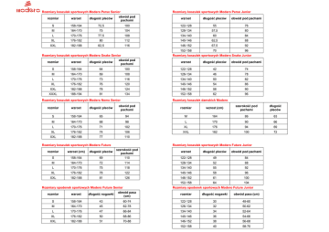 Rozmiary koszulek sportowych Modero Perso Senior Rozmiary koszulek sportowych Modero Perso Junior rozmiar wzrost długość pleców obwód pod pachami wzrost długość pleców obwód pod pachami S 158-164 72,5 100 122-128 55 76 M 164-170 75 104 128-134 57,5 80 L 170-176 77,5 108 134-140 60 84 XL 176-182 80 112 140-146 62,5 88 XXL 182-188 82,5 116 146-152 67,5 92 152-158 70 96 Rozmiary koszulek sportowych Modero Snake Senior Rozmiary koszulek sportowych Modero Snake Junior rozmiar wzrost długość pleców obwód pod pachami wzrost długość pleców obwód pod pachami S 158-164 64 100 122-128 42 74 M 164-170 69 108 128-134 46 78 L 170-176 73 116 134-140 50 82 XL 176-182 76 120 140-146 54 86 XXL 182-188 78 124 146-152 58 90 XXXL 188-194 81 134 152-158 62 96 Rozmiary koszulek sportowych Modero Nemo Senior Rozmiary koszulek damskich Modero rozmiar wzrost długość pleców obwód pod pachami rozmiar wzrost (cm) szerokość pod pachami długość pleców S 158-164 65 94 M 164 86 63 M 164-170 68 98 L 170 90 66 L 170-176 71 102 XL 176 94 69 XL 176-182 74 106 XXL 182 100 72 XXL 182-188 77 110 Rozmiary koszulek sportowych Modero Future Rozmiary koszulek sportowych Modero Future Junior rozmiar wzrost (cm) długość pleców S 158-164 69 szerokość pod pachami 110 M 164-170 72 114 128-134 52 88 L 170-176 75 118 134-140 55 92 XL 176-182 78 122 140-146 58 96 XXL 182-188 81 126 146-152 61 100 152-158 64 104 Rozmiary spodenek sportowych Modero Future Senior wzrost długość pleców obwód pod pachami 122-128 49 84 Rozmiary spodenek sportowych Modero Future Junior rozmiar wzrost długość nogawki obwód pasa (cm) S 158-164 43 60-74 122-128 30 48-60 M 164-170 45 62-78 128-134 32 50-62 L 170-176 47 66-84 134-140 34 52-64 XL 176-182 50 68-86 140-146 36 54-66 XXL 182-188 51 70-88 146-152 38 56-68 152-158 40 58-70 rozmiar długość nogawki obwód pasa (cm)