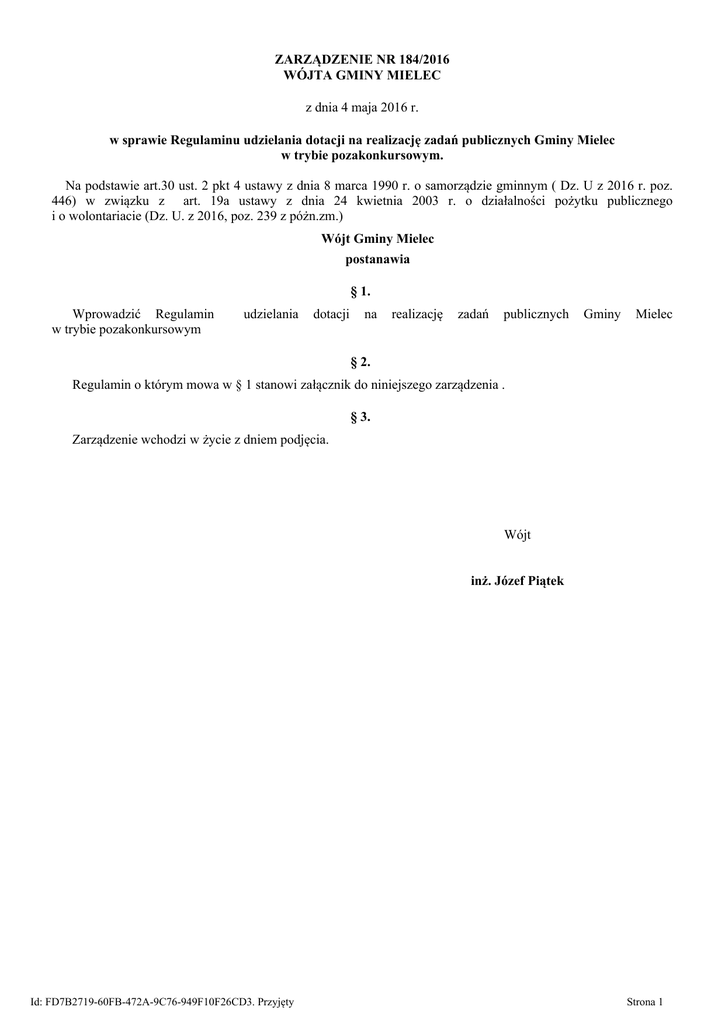 ZARZĄDZENIE NR 184/2016 WÓJTA GMINY MIELEC z dnia 4 maja 2016 r. w sprawie Regulaminu udzielania dotacji na realizację zadań publicznych Gminy Mielec w trybie pozakonkursowym. Na podstawie art.30 ust. 2 pkt 4 ustawy z dnia 8 marca 1990 r. o samorządzie gminnym ( Dz. U z 2016 r. poz. 446) w związku z art. 19a ustawy z dnia 24 kwietnia 2003 r. o działalności pożytku publicznego i o wolontariacie (Dz. U. z 2016, poz. 239 z póżn.zm.) Wójt Gminy Mielec postanawia § 1. Wprowadzić Regulamin w trybie pozakonkursowym udzielania dotacji na realizację zadań publicznych Gminy Mielec § 2. Regulamin o którym mowa w § 1 stanowi załącznik do niniejszego zarządzenia . § 3. Zarządzenie wchodzi w życie z dniem podjęcia. Wójt inż. Józef Piątek Id: FD7B2719-60FB-472A-9C76-949F10F26CD3. Przyjęty Strona 1 Załącznik do Zarządzenia Nr 184/2016 Wójta Gminy Mielec z dnia 4 maja 2016 r. REGULAMIN UDZIELANIA DOTACJI NA REALIZACJĘ ZADAŃ PUBLICZNYCH GMINY MIELEC W TRYBIE POZAKONKURSOWYM. 1. Niniejszy Regulamin udzielania dotacji w formie małych grantów przez Gminę Mielec, zwany w dalszej części Regulaminem, określa zasady i tryb rozpatrywania ofert realizacji zadania publicznego składanych przez organizacje pozarządowe oraz podmioty wymienione w art. 3 ust. 3 ustawy z dnia 24 kwietnia 2003 r. o działalności pożytku publicznego i o wolontariacie (tekst jednolity Dz. U. z 2016 roku poz. 239 ze zm.), dalej łącznie zwane jako organizacje pozarządowe, w trybie art. 19a powołanej Ustawy. 2. Wysokość środków finansowych przeznaczonych przez organ wykonawczy jednostki samorządu terytorialnego na realizację zadań, o których mowa w art.19a ustawy wskazanej w pkt. 1 nie może przekroczyć 20% środków przeznaczonych w danym roku budżetowym na realizację zadań publicznych przez organizacje pozarządowe oraz podmioty wymienione w art. 3 ust. 3 ustawy. 3. Organizacja może złożyć ofertę na finansowanie lub dofinansowanie realizacji zadania publicznego. 4. Dofinansowane mogą być jedynie zadania publiczne, które mieszczą się w priorytetowych zadaniach publicznych, określonych w obowiązującym programie współpracy Gminy Mielec z organizacjami pozarządowymi i innymi podmiotami prowadzącymi działalność pożytku publicznego 5. Wysokość finansowania lub dofinansowania zadania publicznego nie może przekroczyć 10.000 zł, 6. Zadanie publiczne ma być realizowane w okresie nie dłuższym niż 90 dni. 7. Zadanie, na które przyznana jest dotacja, nie może stanowić części większego zadania, musi być to zadanie samodzielne. 8. Łączna kwota środków finansowych przekazanych tej samej organizacji pozarządowej lub podmiotowi wymienionemu w art. 3 ust 3 ustawy, nie może przekroczyć w danym roku kalendarzowym kwoty 20.000 zł. 9. Termin realizacji zadania musi zawierać się w danym roku kalendarzowym 10. Oferta musi być złożona co najmniej 21 dni przed rozpoczęciem realizacji zadania publicznego 11. O terminie złożenia oferty decyduje data wpływu oferty do siedziby Urzędu Gminy Mielec. 12. Warunkiem ubiegania się o dofinansowanie ze wzorem określonym w odrębnych przepisach. jest złożenie oferty na druku zgodnym 13. Do oferty należy dołączyć: 1) kopię aktualnego odpisu z Krajowego Rejestru Sądowego, innego rejestru lub ewidencji; 2) kopię statutu organizacji składającej ofertę; 3) zaświadczenie o posiadanym rachunku bankowym. 14. Wszystkie wymienione dokumenty powinny być dołączone w oryginale lub w postaci czytelnej kserokopii z potwierdzeniem jej zgodności z oryginałem przez osobę lub osoby uprawnione. 15. Oferty niekompletne i nieprawidłowo wypełnione niespełniające warunków określonych w niniejszym regulaminie, w tym złożone z uchybieniem terminu o którym mowa w pkt. 10 będą podlegały odrzuceniu. 16. Obowiązek sporządzenia Id: FD7B2719-60FB-472A-9C76-949F10F26CD3. Przyjęty kompletnej oferty spoczywa na oferencie. Strona 1 17. Oferty na realizację zadania publicznego wraz z wymaganymi załącznikami należy składać w sekretariacie Urzędu Gminy Mielec, ul. Głowackiego 5, 39-300 Mielec. 18. Wójt Gminy Mielec w terminie nie dłuższym niż 7 dni roboczych od dnia wpływu oferty uznając celowość realizacji zadania zamieszcza ofertę na okres 7 dni na tablicy ogłoszeń urzędu, na stronie internetowej www.gmina.mielec.pl oraz w Biuletynie Informacji Publicznej. 19. W w terminie 7 dni od dnia zamieszczenia oferty formie każdy może zgłosić do niej uwagi pisemnej. 20. Po upływie terminu, o którym mowa w pkt. 19, po rozpatrzeniu zgłoszonych uwag Wójt Gminy Mielec podejmuje decyzję o udzieleniu lub odmowie udzielenia dotacji na realizację zadania publicznego i przekazuje oferentowi informację o rozstrzygnięciu. 21. Kwota przyznanej dotacji może być inna od określonej w ofercie. W przypadku przyznania dotacji w wysokość innej niż wnioskowana, warunkiem zawarcia umowy jest korekta oferty. 22. Wójt Gminy Mielec uznając celowość realizacji zadania publicznego, na które została złożona oferta, zleca organizacji pozarządowej jego realizację oraz niezwłocznie podpisuje umowę o powierzenie lub wsparcie realizacji zadania publicznego. 23. Zasady o realizacji zadania publicznego realizację oraz rozliczenia udzielonej zadania dotacji określa umowa publicznego. 24. Realizację oferty Wójt Gminy Mielec uznaje za niecelową i odmawia udzielenia dotacji w szczególności jeśli: 1) wnioskowana kwota finansowania lub dofinansowania zadania publicznego jest wyższa, niż wysokość zabezpieczonych w budżecie Gminy Mielec środków finansowych na realizację zadań publicznych z pominięciem otwartego konkursu ofert, 2) zadanie nie odpowiada zakresowi działalności statutowej oferenta, 3) oferta została złożona na zadanie, na które ogłoszono otwarty konkurs ofert, 4) termin realizacji zadania przekracza rok budżetowy, 5) brak spełnienia warunku, o którym mowa w pkt. 4 niniejszego r
