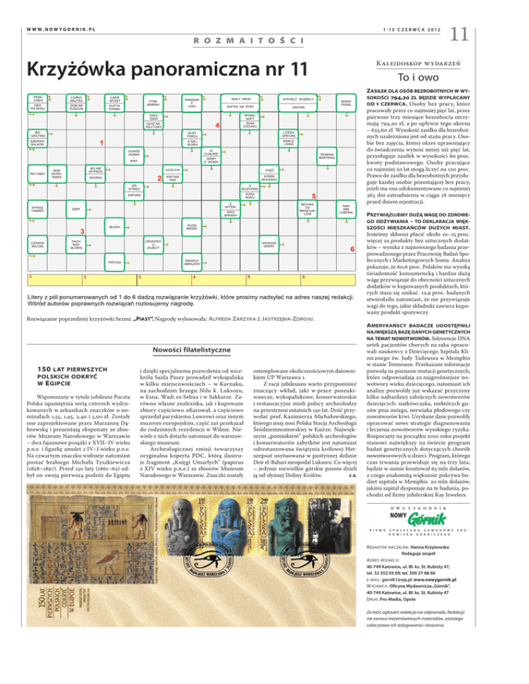 W W W.NOW YGORNIK.PL 1-15 C Z E R W C A 2 012 R O Z M A I T O Ś C I Krzyżówka panoramiczna nr 11 11 K To i owo ZASIŁEK DLA OSÓB BEZROBOTNYCH W WYSOKOŚCI , ZŁ BĘDZIE WYPŁACANY OD CZERWCA. Osoby bez pracy, które pracowały przez co najmniej pięć lat, przez pierwsze trzy miesiące bezrobocia otrzymają , zł, a po upływie tego okresu – , zł. Wysokość zasiłku dla bezrobotnych uzależniona jest od stażu pracy. Osobie bez zajęcia, której okres uprawniający do świadczenia wynosi mniej niż pięć lat, przysługuje zasiłek w wysokości proc. kwoty podstawowego. Osoby pracujące co najmniej lat mogą liczyć na proc. Prawo do zasiłku dla bezrobotnych przysługuje każdej osobie pozostającej bez pracy, jeżeli ma ona udokumentowane co najmniej dni zatrudnienia w ciągu miesięcy przed dniem rejestracji. Rozwiązanie poprzedniej krzyżówki brzmi: „PIAST”. Nagrodę wylosowała: ALFREDA ZARZYKA Z JASTRZĘBIA-ZDROJU. PRZYWIĄZUJEMY DUŻĄ WAGĘ DO ZDROWEGO ODŻYWIANIA – TO DEKLARACJA WIĘKSZOŚCI MIESZKAŃCÓW DUŻYCH MIAST. Jesteśmy skłonni płacić około – proc. więcej za produkty bez sztucznych dodatków – wynika z najnowszego badania przeprowadzonego przez Pracownię Badań Społecznych i Marketingowych Soma. Analiza pokazuje, że , proc. Polaków ma wysoką świadomość konsumencką i bardzo dużą wagę przywiązuje do obecności sztucznych dodatków w kupowanych produktach, których stara się unikać. , proc. badanych stwierdziło natomiast, że nie przywiązuje wagi do tego, jakie składniki zawiera kupowany produkt spożywczy. AMERYKAŃSCY BADACZE UDOSTĘPNILI NAJWIĘKSZĄ BAZĘ DANYCH GENETYCZNYCH NA TEMAT NOWOTWORÓW. Sekwencje DNA Nowości filatelistyczne 150 LAT PIERWSZYCH POLSKICH ODKRYĆ W E GIPCIE Wspomniany w tytule jubileusz Poczta Polska upamiętnia serią czterech wydrukowanych w arkusikach znaczków o nominałach ,, ,, , i , zł. Zostały one zaprojektowane przez Marzannę Dąbrowską i prezentują eksponaty ze zbiorów Muzeum Narodowego w Warszawie – dwa fajansowe posążki z XVII–IV wieku p.n.e. i figurkę amulet z IV–I wieku p.n.e. Na czwartym znaczku widnieje natomiast postać hrabiego Michała Tyszkiewicza (–). Przed laty (–) odbył on swoją pierwszą podróż do Egiptu i dzięki specjalnemu pozwoleniu od wicekróla Saida Paszy prowadził wykopaliska w kilku miejscowościach – w Karnaku, na zachodnim brzegu Nilu k. Luksoru, w Esna, Wadi es-Sebua i w Sakkarze. Zarówno własne znaleziska, jak i kupowane zbiory częściowo ofiarował, a częściowo sprzedał paryskiemu Luwrowi oraz innym muzeom europejskim, część zaś przekazał do rodzinnych rezydencji w Wilnie. Niewiele z nich dotarło natomiast do warszawskiego muzeum. Archeologicznej emisji towarzyszy oryginalna koperta PDC, którą ilustruje fragment „Księgi Umarłych” (papirus z XIV wieku p.n.e.) ze zbiorów Muzeum Narodowego w Warszawie. Znaczki zostały ostemplowane okolicznościowym datownikiem UP Warszawa . Z racji jubileuszu warto przypomnieć znaczący wkład, jaki w prace poszukiwawcze, wykopaliskowe, konserwatorskie i restauracyjne mieli polscy archeolodzy na przestrzeni ostatnich lat. Dość przywołać prof. Kazimierza Michałowskiego, którego imię nosi Polska Stacja Archeologii Śródziemnomorskiej w Kairze. Największym „pomnikiem” polskich archeologów i konserwatorów zabytków jest natomiast odrestaurowana świątynia królowej Hetszepsut usytuowana w pustynnej dolinie Deir el-Bahari nieopodal Luksoru. Co więcej – jedynie niewielkie górskie pasmo dzieli ją od słynnej Doliny Królów. Z.B. setek pacjentów chorych na raka opracowali naukowcy z Dziecięcego Szpitala Klinicznego św. Judy Tadeusza w Memphis w stanie Tennessee. Przekazane informacje pozwolą na poznanie mutacji genetycznych, które odpowiadają za najgroźniejsze nowotwory wieku dziecięcego, natomiast ich analizy pozwoliły już wskazać przyczyny kilku najbardziej zabójczych nowotworów dziecięcych: siatkówczaka, niektórych guzów pnia mózgu, nerwiaka płodowego czy nowotworów krwi. Uzyskane dane pozwoliły opracować nowe strategie diagnozowania i leczenia nowotworów wysokiego ryzyka. Rozpoczęty na początku roku projekt stanowi największy na świecie program badań genetycznych dotyczących chorób nowotworowych u dzieci. Program, którego czas trwania przewiduje się na trzy lata, będzie w sumie kosztował mln dolarów, z czego znakomitą większość pokrywa budżet szpitala w Memphis. mln dolarów, jakimi szpital dysponuje na te badania, pochodzi od firmy jubilerskiej Kay Jewelers. D W U T Y G O D N I K P I S M O S P O Ł E C Z N O - Z A W O D O W E D O W I S K A G Ó R N I C Z E G O Ś R O - R EDAKTOR NACZELNA : Hanna Krzyżowska Redaguje zespół A DRES REDAKCJI : 40-749 Katowice, ul. Bł. ks. St. Kubisty 47, tel. 32 352 03 09; tel. 500 27 88 66 E - MAIL : [email protected]; www.nowygornik.pl W YDAWCA : Oficyna Wydawnicza „Górnik”, 40-749 Katowice, ul. Bł. ks. St. Kubisty 47 D RUK : Pro-Media, Opole Za treść ogłoszeń redakcja nie odpowiada. Redakcja nie zwraca niezamówionych materiałów, zastrzega sobie prawo ich redagowania i skracania.
