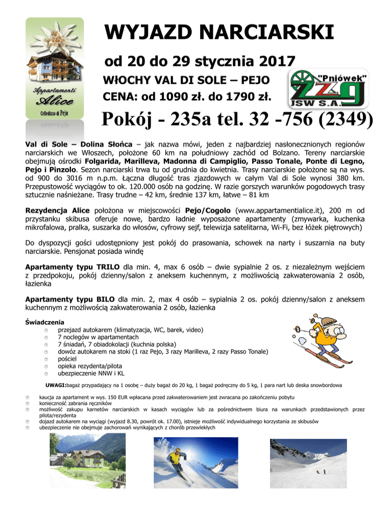 WYJAZD NARCIARSKI od 20 do 29 stycznia 2017 WłOCHY VAL DI SOLE – PEJO CENA: od 1090 zł. do 1790 zł. Pokój - 235a tel. 32 -756 (2349) Val di Sole – Dolina Słońca – jak nazwa mówi, jeden z najbardziej nasłonecznionych regionów narciarskich we Włoszech, położone 60 km na południowy zachód od Bolzano. Tereny narciarskie obejmują ośrodki Folgarida, Marilleva, Madonna di Campiglio, Passo Tonale, Ponte di Legno, Pejo i Pinzolo. Sezon narciarski trwa tu od grudnia do kwietnia. Trasy narciarskie położone są na wys. od 900 do 3016 m n.p.m. Łączna długość tras zjazdowych w całym Val di Sole wynosi 380 km. Przepustowość wyciągów to ok. 120.000 osób na godzinę. W razie gorszych warunków pogodowych trasy sztucznie naśnieżane. Trasy trudne – 42 km, średnie 137 km, łatwe – 81 km Rezydencja Alice położona w miejscowości Pejo/Cogolo (www.appartamentialice.it), 200 m od przystanku skibusa oferuje nowe, bardzo ładnie wyposażone apartamenty (zmywarka, kuchenka mikrofalowa, pralka, suszarka do włosów, cyfrowy sejf, telewizja satelitarna, Wi-Fi, bez łóżek piętrowych) Do dyspozycji gości udostępniony jest pokój do prasowania, schowek na narty i suszarnia na buty narciarskie. Pensjonat posiada windę Apartamenty typu TRILO dla min. 4, max 6 osób – dwie sypialnie 2 os. z niezależnym wejściem z przedpokoju, pokój dzienny/salon z aneksem kuchennym, z możliwością zakwaterowania 2 osób, łazienka Apartamenty typu BILO dla min. 2, max 4 osób – sypialnia 2 os. pokój dzienny/salon z aneksem kuchennym z możliwością zakwaterowania 2 osób, łazienka Świadczenia przejazd autokarem (klimatyzacja, WC, barek, video) 7 noclegów w apartamentach 7 śniadań, 7 obiadokolacji (kuchnia polska) dowóz autokarem na stoki (1 raz Pejo, 3 razy Marilleva, 2 razy Passo Tonale) pościel opieka rezydenta/pilota ubezpieczenie NNW i KL UWAGI:bagaż przypadający na 1 osobę – duży bagaż do 20 kg, 1 bagaż podręczny do 5 kg, 1 para nart lub deska snowbordowa kaucja za apartament w wys. 150 EUR wpłacana przed zakwaterowaniem jest zwracana po zakończeniu pobytu konieczność zabrania ręczników możliwość zakupu karnetów narciarskich w kasach wyciągów lub za pośrednictwem biura na warunkach przedstawionych przez pilota/rezydenta dojazd autokarem na wyciągi (wyjazd 8.30, powrót ok. 17.00), istnieje możliwość indywidualnego korzystania ze skibusów ubezpieczenie nie obejmuje zachorowań wynikających z chorób przewlekłych