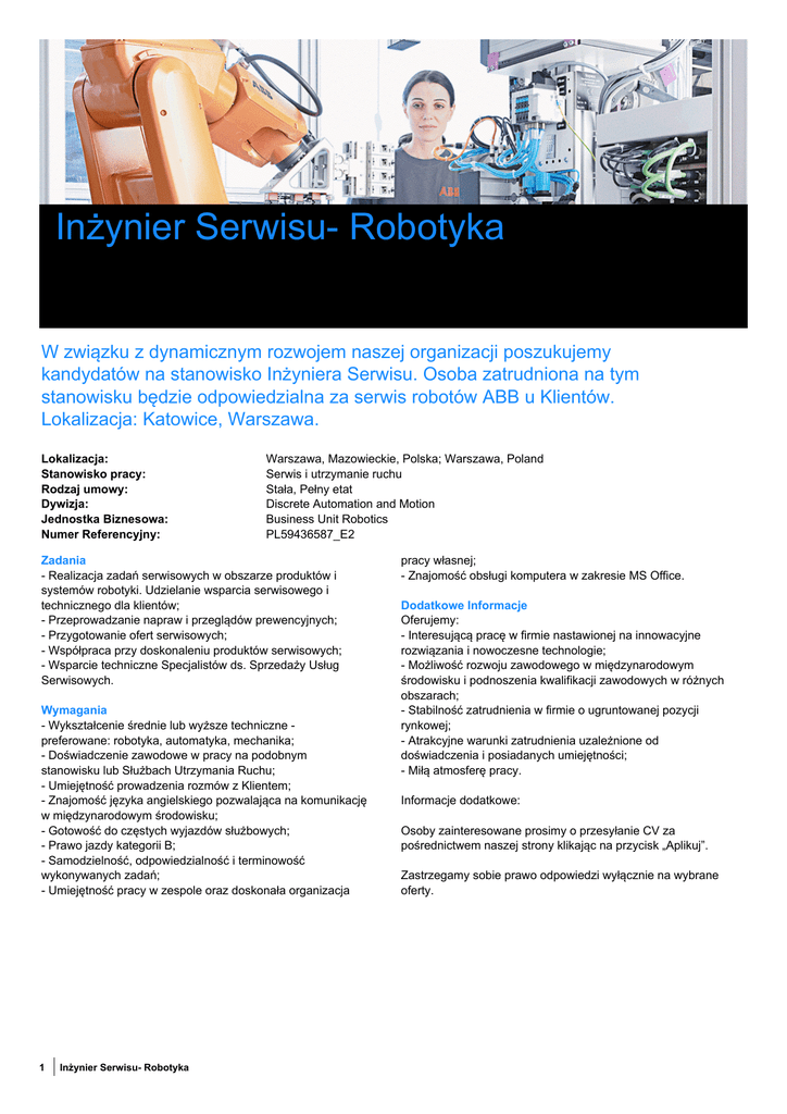 Inżynier Serwisu- Robotyka W związku z dynamicznym rozwojem naszej organizacji poszukujemy kandydatów na stanowisko Inżyniera Serwisu. Osoba zatrudniona na tym stanowisku będzie odpowiedzialna za serwis robotów ABB u Klientów. Lokalizacja: Katowice, Warszawa. Lokalizacja: Stanowisko pracy: Rodzaj umowy: Dywizja: Jednostka Biznesowa: Numer Referencyjny: Warszawa, Mazowieckie, Polska; Warszawa, Poland Serwis i utrzymanie ruchu Stała, Pełny etat Discrete Automation and Motion Business Unit Robotics PL59436587_E2 Zadania - Realizacja zadań serwisowych w obszarze produktów i systemów robotyki. Udzielanie wsparcia serwisowego i technicznego dla klientów; - Przeprowadzanie napraw i przeglądów prewencyjnych; - Przygotowanie ofert serwisowych; - Współpraca przy doskonaleniu produktów serwisowych; - Wsparcie techniczne Specjalistów ds. Sprzedaży Usług Serwisowych. Wymagania - Wykształcenie średnie lub wyższe techniczne preferowane: robotyka, automatyka, mechanika; - Doświadczenie zawodowe w pracy na podobnym stanowisku lub Służbach Utrzymania Ruchu; - Umiejętność prowadzenia rozmów z Klientem; - Znajomość języka angielskiego pozwalająca na komunikację w międzynarodowym środowisku; - Gotowość do częstych wyjazdów służbowych; - Prawo jazdy kategorii B; - Samodzielność, odpowiedzialność i terminowość wykonywanych zadań; - Umiejętność pracy w zespole oraz doskonała organizacja 1 Inżynier Serwisu- Robotyka pracy własnej; - Znajomość obsługi komputera w zakresie MS Office. Dodatkowe Informacje Oferujemy: - Interesującą pracę w firmie nastawionej na innowacyjne rozwiązania i nowoczesne technologie; - Możliwość rozwoju zawodowego w międzynarodowym środowisku i podnoszenia kwalifikacji zawodowych w różnych obszarach; - Stabilność zatrudnienia w firmie o ugruntowanej pozycji rynkowej; - Atrakcyjne warunki zatrudnienia uzależnione od doświadczenia i posiadanych umiejętności; - Miłą atmosferę pracy. Informacje dodatkowe: Osoby zainteresowane prosimy o przesyłanie CV za pośrednictwem naszej strony klikając na przycisk „Aplikuj”. Zastrzegamy sobie prawo odpowiedzi wyłącznie na wybrane oferty. Wszystkie oferty powinny zawierać klauzulę: „Wyrażam zgodę na przetwarzanie moich danych osobowych zawartych w ofercie pracy zgodnie z Ustawą z dnia 29 sierpnia 1997 o ochronie danych osobowych (tekst jednolity Dz. U. 2002.101.926. z późn. zm.) dla potrzeb niezbędnych do realizacji procesu rekrutacji”. ABB (www.abb.com) jest liderem w technologiach dla energetyki i automatyki, które pozwalają klientom przemysłowym oraz zakładom użyteczności publicznej zwiększyć swoją efektywność, jednocześnie minimalizując oddziaływanie na środowisko naturalne. Grupa ABB zatrudnia około 135 000 pracowników w blisko 100 krajach świata. Our ambition. Your legacy. 2 Inżynier Serwisu- Robotyka
