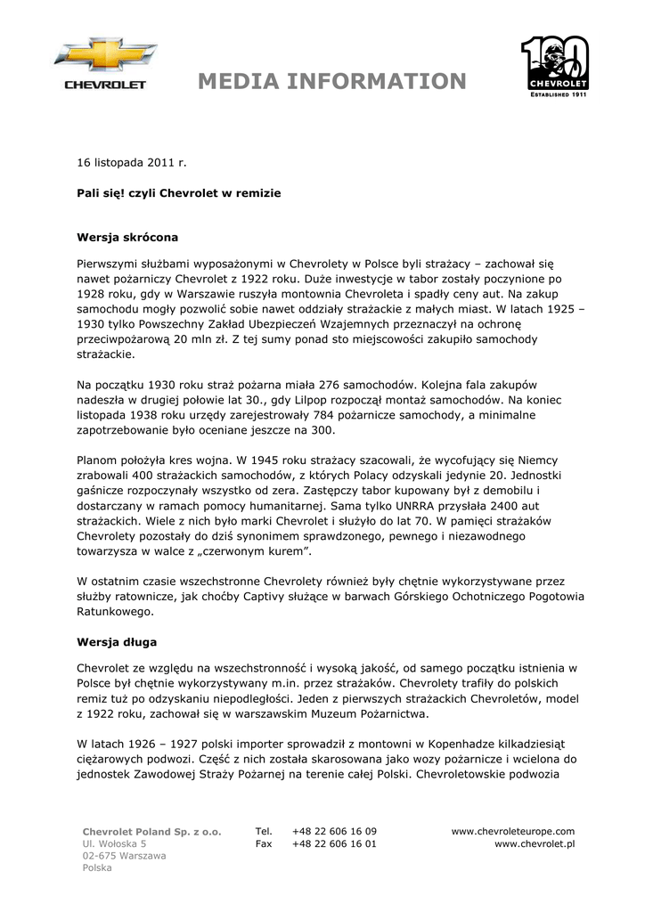 MEDIA INFORMATION 16 listopada 2011 r. Pali się! czyli Chevrolet w remizie Wersja skrócona Pierwszymi służbami wyposażonymi w Chevrolety w Polsce byli strażacy – zachował się nawet pożarniczy Chevrolet z 1922 roku. Duże inwestycje w tabor zostały poczynione po 1928 roku, gdy w Warszawie ruszyła montownia Chevroleta i spadły ceny aut. Na zakup samochodu mogły pozwolić sobie nawet oddziały strażackie z małych miast. W latach 1925 – 1930 tylko Powszechny Zakład Ubezpieczeń Wzajemnych przeznaczył na ochronę przeciwpożarową 20 mln zł. Z tej sumy ponad sto miejscowości zakupiło samochody strażackie. Na początku 1930 roku straż pożarna miała 276 samochodów. Kolejna fala zakupów nadeszła w drugiej połowie lat 30., gdy Lilpop rozpoczął montaż samochodów. Na koniec listopada 1938 roku urzędy zarejestrowały 784 pożarnicze samochody, a minimalne zapotrzebowanie było oceniane jeszcze na 300. Planom położyła kres wojna. W 1945 roku strażacy szacowali, że wycofujący się Niemcy zrabowali 400 strażackich samochodów, z których Polacy odzyskali jedynie 20. Jednostki gaśnicze rozpoczynały wszystko od zera. Zastępczy tabor kupowany był z demobilu i dostarczany w ramach pomocy humanitarnej. Sama tylko UNRRA przysłała 2400 aut strażackich. Wiele z nich było marki Chevrolet i służyło do lat 70. W pamięci strażaków Chevrolety pozostały do dziś synonimem sprawdzonego, pewnego i niezawodnego towarzysza w walce z „czerwonym kurem”. W ostatnim czasie wszechstronne Chevrolety również były chętnie wykorzystywane przez służby ratownicze, jak choćby Captivy służące w barwach Górskiego Ochotniczego Pogotowia Ratunkowego. Wersja długa Chevrolet ze względu na wszechstronność i wysoką jakość, od samego początku istnienia w Polsce był chętnie wykorzystywany m.in. przez strażaków. Chevrolety trafiły do polskich remiz tuż po odzyskaniu niepodległości. Jeden z pierwszych strażackich Chevroletów, model z 1922 roku, zachował się w warszawskim Muzeum Pożarnictwa. W latach 1926 – 1927 polski importer sprowadził z montowni w Kopenhadze kilkadziesiąt ciężarowych podwozi. Część z nich została skarosowana jako wozy pożarnicze i wcielona do jednostek Zawodowej Straży Pożarnej na terenie całej Polski. Chevroletowskie podwozia Chevrolet Poland Sp. z o.o. Ul. Wołoska 5 02-675 Warszawa Polska Tel. Fax +48 22 606 16 09 +48 22 606 16 01 www.chevroleteurope.com www.chevrolet.pl 2 ciężarowe z fabryki w Danii były dużo tańsze od konkurencyjnych marek, ale nadal dość kosztowne, jak na krajowe warunki. Sytuacja zmieniła się diametralnie latem 1928 roku, kiedy z warszawskiej montowni Chevroleta zaczęły wyjeżdżać samochody osobowe i ciężarowe oraz kompletne podwozia do karosowania we własnym zakresie. Za sprawą dobrze zorganizowanego cyklu produkcji, ceny pojazdów były bezkonkurencyjnie niskie. Na zakup samochodu mogły pozwolić sobie nawet oddziały z małych miast. W latach 1925 – 1930 tylko Powszechny Zakład Ubezpieczeń Wzajemnych przeznaczył na ochronę przeciwpożarową 20 mln zł. Z tej sumy ponad sto miejscowości zakupiło samochody strażackie. Na początku 1930 roku straż pożarna miała 276 samochodów. Pożarnicze Chevrolety pojawiły się w oddziałach straży pożarnej, zawodowej i fabrycznej, we wszystkich dużych miastach: Warszawie, Poznaniu, Krakowie, Łodzi, Kielcach, Lublinie, Białymstoku, Grodnie, Brześciu, Gdyni, Katowicach, Częstochowie, Siedlcach, Lwowie i Wilnie. Ceny podwozi Chevroleta były na tyle przystępne, że mogły pozwolić sobie na nie nawet Ochotnicze Straże Pożarne. Np. w 1929 roku OSP w Staniszewie kupiła pożarniczego Chevroleta, który pozostawał w służbie aż do roku 1962. Także jednostki ochotnicze w Pruszkowie i Nadarzynie wzbogaciły się o Chevroleta. Kolejna fala zakupów przyszła wraz z uruchomieniem w Warszawie drugiej montowni Chevroleta w latach 1936 – 1939. Pożarnicze auta tej marki trafiły m.in. do OSP w: Chęcinach, Mosinie i Rembertowie. W 1938 roku dwa Chevrolety kupiły Siedlce dla Miejskiej Straży Ogniowej. Na koniec listopada 1938 roku urzędy zarejestrowały 784 pożarnicze samochody, a minimalne zapotrzebowanie było oceniane jeszcze na 300. W wykazie samochodów Straży Ogniowej m.st. Warszawy z dnia 1 września 1939 roku, wśród 63 wymienionych pojazdów znajdowało się 13 Chevroletów, w tym 2 osobowe. W czasie wojny polska straż pożarna straciła większość taboru – został zniszczony podczas przejścia frontów albo zagrabili go niemieccy i rosyjscy okupanci. W znajdującym się w archiwum Muzeum Pożarnictwa w Warszawie wykazie stanowiących własność Warszawskiej Straży Pożarnej samochodów pożarniczych zarekwirowanych i wywiezionych przez Niemców w pierwszych dniach sierpnia 1944 roku, wymienionych jest 40 samochodów pożarniczych, w tym 8 Chevroletów (7 ciężarowych i 1 osobowy). Po wojnie strażacy oceniali, że wycofujący się Niemcy zrabowali ok. 400 strażackich samochodów, z których Polacy odzyskali jedynie 20. W okresie powojennym zrabowane auta zostały zastąpione przez Chevrolety, które w latach 1945 – 1947 trafiły do Polski różnymi drogami – Lend-Lease, UNRRA, zakupy rządowe w zachodnim demobilu. Sama tylko UNRRA przysłała 2400 aut strażackich. Po adaptacjach demobilowe Chevrolety stawały się wozami pożarniczymi oddziałów Zawodowej i Ochotniczej Straży Pożarnej. Chevrolety służyły m.in. w powstałej w 1946 roku Zakładowej Straży Pożarnej w Zakładach Papierniczych w Fordonie (do 1970 roku!). Chevroleta miała także cukrownia w Szamotułach. W 1945 roku Chevrolet trafił do strażaków z OSP w Złotokłosie, w kolejnym roku samochód tej marki otrzymali strażacy z Solca Kujawskiego. Chevrolet Poland Sp. z o.o. Ul. Wołoska 5 02-675 Warszawa Polska Tel. Fax +48 22 606 16 09 +48 22 606 16 01 www.chevroleteurope.com www.chevrolet.pl 3 Chevrolety były długowieczn