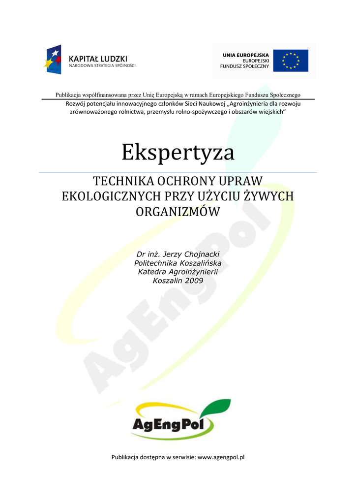 Publikacja współfinansowana przez Unię Europejską w ramach Europejskiego Funduszu Społecznego Rozwój potencjału innowacyjnego członków Sieci Naukowej „Agroinżynieria dla rozwoju zrównoważonego rolnictwa, przemysłu rolno-spożywczego i obszarów wiejskich” Ekspertyza TECHNIKA OCHRONY UPRAW EKOLOGICZNYCH PRZY UŻYCIU ŻYWYCH ORGANIZMÓW Dr inŜ. Jerzy Chojnacki Politechnika Koszalińska Katedra AgroinŜynierii Koszalin 2009 Publikacja dostępna w serwisie: www.agengpol.pl 2 Spis treści 1. Wstęp ........................................................................................................................ 3 2. Metody aplikacji biologicznych czynników ochrony roślin ............................................ 4 2.1. Sposoby nanoszenia biopreparatów zawierających wirusy, bakterie, grzyby owadobójcze nicienie .................................................................. 7 2.1.1. Ochrona materiału siewnego ......................................................................... 7 2.1.2. Ochrona roślin ............................................................................................... 8 2.2. Sposoby nanoszenia drapieŜnych roztoczy i owadów ........................................ 12 2.3. Kalibracja maszyn i urządzeń do aplikacji biopreparatów ................................... 14 3. Środki ostroŜności podczas stosowania Ŝywych organizmów ................................... 15 4. Kierunki obecnych i przyszłych prac badawczych ..................................................... 15 5. Literatura .................................................................................................................. 16 3 1. Wstęp Jednym z głównych sposobów ochrony upraw w rolnictwie ekologicznym jest metoda biologiczna. Polega ona na zwalczaniu agrofagów za pomocą Ŝywych organizmów takich jak wirusy, bakterie, pierwotniaki i grzyby, owadobójcze nicienie, roztocze i pająki oraz drapieŜne i pasoŜytnicze owady. Są to naturalnymi wrogowie szkodników roślin, wysublimowani z pośród wielu gatunków organizmów będących agresywnymi i skutecznymi pasoŜytami agrofagów, które nadają się do sztucznego rozmnaŜania i stosowania w sposób zmasowany. W ochronie roślin uŜywane są dla nich nazwy takie jak: biologiczne czynniki ochrony roślin, biopreparaty, biopestycydy lub biologiczne środki ochrony roślin. Podobnie jak w przypadku środków chemicznych, w zaleŜności od zastosowania nazywa się je: bioinsektycydami, bioherbicydami lub biofungicydami. Zaletą stosowania Ŝywych organizmów do ochrony roślin jest ich bezpieczeństwo dla ludzi wynikające z braku kumulacji w glebie i na roślinach substancji szkodliwych dla środowiska i zdrowia ludzkiego a takŜe selektywne zwalczanie agrofagów. Pozytywne aspekty stosowania biopreparatów w rolnictwie ekologicznym stwarzają zachętę dla konsumentów Ŝywności do kupowania produktów wyhodowanych tą metodą. Wykorzystanie Ŝywych organizmów w rolnictwie powoduje równieŜ, Ŝe dla osób wykonujących zabiegi ochrony roślin z uŜyciem tych substancji są one bardziej bezpieczne niŜ z uŜyciem środków chemicznych. Biopestycydy od preparatów chemicznych znacząco odróŜnia takŜe zdolność do rozmnaŜania się. Sprzyja ona utrzymywaniu ich biologicznej aktywności do czasu zmniejszenia populacji agrofagów poniŜej ekonomicznej szkodliwości a następnie dalszemu, profilaktycznemu zabezpieczenie hodowanych roślin. Zdolność wielu gatunków Ŝywych organizmów do poruszania się i do aktywnego wyszukiwania szkodników stwarza moŜliwość na wykorzystanie ich do zwalczania agrofagów w miejscach upraw, na które trudno by było umieścić środki chemiczne. Stosowanie organizmów poŜytecznych w ochronie roślin moŜe odbywać się róŜnymi sposobami, poprzez: - introdukcję na zagroŜone tereny organizmów sprowadzonych z innych odległych miejsc lub kontynentów, - ochronę i stwarzanie warunków do rozmnaŜania, - rozprzestrzenianie organizmów sztucznie wyhodowanych. Introdukcja Ŝywych organizmów z innych kontynentów jest procesem trudnym i nie zawsze dającym oczekiwane rezultaty. Osiedlenie Ŝywego organizmu na nie zamieszkiwanym dotychczas przez niego terenie niesie zagroŜenie, Ŝe z jednej strony nieobecność naturalnych wrogów moŜe doprowadzić do sytuacji, Ŝe sam z czasem stanie się pasoŜytem a z drugiej , Ŝe musi mieć zapewnione warunki do przeŜycia. Ich brak powoduje, Ŝe niektóre organizmy nie przeŜywają na miejscu introdukcji, inne jak np. owady często uciekają z tych miejsc. Ochrona poŜytecznych organizmów polega na stosowaniu selektywnych środków w ochronie roślin i na wykonywaniu zabiegów w okresach najmniejszej ich liczebności oraz na tworzeniu warunków sprzyjających ich rozmnaŜaniu. Tworzenie warunków sprzyjających rozmnaŜaniu poŜytecznych organizmów jest wynikiem utrzymywania duŜej róŜnorodności roślin poprzez pozostawianie zadrzewionych i pokrytych krzakami pasów ziemi w otoczeniu pól oraz na wysiewaniu w uprawie głównej dodatkowych gatunków roślin produkujących duŜe ilości nektaru i pyłku. Rozprzestrzenianie organizmów sztucznie wyhodowanych wykonywane jest w sposób masowy na uprawach, na których szkodniki rozmnoŜyły się do poziomu zagraŜającego opłacalności upraw lub gdy istnieje zagroŜenie, ze taki poziom mogą osiągnąć. Metody rozprzestrzeniania organizmów sztucznie wyhodowanych ze względu na ich róŜnorodność gatunkową i środowisko działania są bardzo róŜne. Mogą być uwalniane z pojemników, rozsypywane, zmieszane z cieczą rozpylane lub rozlewane. Na małych uprawach lub do doniczek moŜna to robić ręcznie. W przypadku gospodarstw towarowych, ze względu na wysokie koszty robocizny, wymagane jest uŜycie do tego celu urządzeń technicznych. 4 Podstawowym warunkiem wyboru metody rozpraszania i zastosowania do tego celu maszyny jest zapewnienie bezpieczeństwa Ŝy