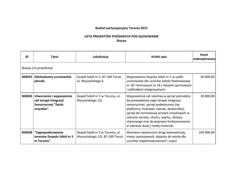 Budżet partycypacyjny Torunia 2015 LISTA PROJEKTÓW PODDANYCH POD GŁOSOWANIE Skarpa ID Tytuł Lokalizacja Krótki opis Koszt zaakceptowany Skarpa (14 projektów) SK0025 Odchudzamy uczniowskie plecaki. Zespół Szkół nr 5, 87-100 Toruń, ul. Wyszyńskiego 6. Wyposażenie Zespołu Szkól nr 5 w szafki uczniowskie dla uczniów Szkoły Podstawowej nr 18 i Gimnazjum nr 18 z klasami sportowymi i oddziałami integracyjnymi. 50 000,00 SK0026 Utworzenie i wyposażenie sali terapii Integracji Sensorycznej "Świat zmysłów". Zespół Szkół nr 5 w Toruniu, ul. Wyszyńskiego 1/5. Wyposażenie sali szkolnej w sprzęt potrzebny do prowadzenia zajęć terapii integracji sensorycznej: sprzęt podwieszany (np. platformy, huśtawki, hamak, deskorolka), sprzęt do normalizacji wrażeń zmysłowych w zakresie wzroku, słuchu, węchu, dotyku, równowagi oraz do poprawy funkcjonowania w zakresie dużej i małej motoryki. 20 000,00 SK0028 "Zagospodarowanie terenów Zespołu Szkół nr 5 w Toruniu". Zespół Szkół nr 5 w Toruniu, ul. Wymiana nawierzchni drogi wewnętrznej, Wyszyńskiego 1/5, 87-100 Toruń. miejsc postojowych, dojazdu do windy dla uczniów niepełnosprawnych i części 195 000,00 chodników. SK0030 Rewitalizacja nawierzchni do wejścia głównego Zespołu Szkół nr 5. Zespół Szkół nr 5, ul. Wyszyńskiego 1/5. Wymiana chodnika przed wejściem główny do szkoły na kostkę brukową. W zależności od możliwości technicznych ułożenie logo szkoły z kostek brukowych innego koloru. 150 000,00 SK0032 Zdrowe gotowanie dla mieszkańców Skarpy. Klub "Zodiak" Spółdzielni Mieszkaniowej "Na Skarpie". Organizacja 10 spotkań poświęconych zdrowemu odżywianiu dla dzieci, młodzieży i seniorów (łącznie dla 200 osób). Uczestnicy nauczą się pod okiem kucharza gotować zdrowo i smacznie. Wszystkie przepisy po zakończeniu cyklu zostaną zebrane i wydane w formie broszurki, która zostanie rozniesiona przez gospodarzy domów do wszystkich mieszkań znajdujących się na terenie osiedla. Realizacja możliwa pod warunkiem uzyskania zgody właściciela terenu. 20 000,00 SK0034 Stół betonowy do tenisa stołowego na zewnątrz. Teren III Liceum Ogólnokształcącego, ul. Raszei 1. Montaż stołu betonowego do tenisa stołowego na zewnątrz, z zaokrąglonymi obrzeżami i aluminiowym profilem dla bezpieczeństwa oraz zaimpregnowany w celu zapewnienia odporności na warunki atmosferyczne. 4 000,00 SK0035 Boisko do gry w piłkę ręczną o nawierzchni bezpiecznej. Osiedle Skarpa - nieruchomość Bożena I - lokalizacja przy ul. Szosa Lubicka 154. Wykonanie boiska do gry w piłkę ręczną o nawierzchni bezpiecznej oraz wyposażenie obiektu w 2 bramki, piłkochwyty, siedziska 350 000,00 (20 sztuk), 4 kosze boczne, oświetlenie lampami energooszczędnymi typu LED, ogrodzenie z furtką umożliwiającą zamykanie boiska po godz. 20:00. Realizacja możliwa pod warunkiem uzyskania zgody właściciela terenu. SK0036 Oświetlenie ścieżek pieszych w parku na osiedlu Skarpa w części sektora Maciej. Park osiedlowy w sektorze Maciej Wykonanie oświetlenia wewnętrznych ścieżek pomiędzy blokiem spacerowych w części parku sektora Maciej. Mossakowskiego 4 w kierunku południowym do bloków mieszkalnych przy ul. Przy Skarpie 23. Zakres prac: wykonanie oświetlenia wewnętrznych ścieżek spacerowych w części parku sektora Maciej. SK0039 Ścianka wspinaczkowa dla mieszkańców Skarpy. Sala Gimnastyczna III Liceum Ogólnokształcącego przy ulicy Raszei 1 w Toruniu. 100 000,00 Budowa ścianki wspinaczkowej w sali gimnastycznej wraz z zakupem sprzętu (kaski, liny zabezpieczające). Ścianka będzie wykorzystywana w trakcie lekcji w-f przez uczniów, a także będzie udostępniona za niewielką opłatą dla mieszkańców osiedla. 72 000,00 SK0041 "Jak Cię widzą tak Cię Zespół Szkół nr 5 w Toruniu ul. Wymiana ogrodzenia wokół placu szkolnego, piszą" - poprawa wizerunku Wyszyńskiego 1/5, 87-100 Toruń. boisk szkolnych oraz placu przed wejściem do otoczenia szkoły - Zespołu Zespołu Szkół nr 5. Szkół nr 5 poprzez wymianę 200 000,00 ogrodzenia. SK0043 Mural o tematyce edukacyjno-sportowej. Zachodnia elewacja budynku mieszkalnego przy ul. Suleckiego 4. Realizacja muralu o tematyce edukacyjnosportowej na zachodniej elewacji budynku mieszkalnego przy ul. Suleckiego 4. Realizacja projektu uzależniona od zgody właścicieli budynku na umieszczenie muralu na elewacji. Wykonawca (w tym autor projektu) zostanie wyłoniony w trybie publicznego naboru ofert. Realizacja możliwa pod warunkiem uzyskania zgody właściciela terenu. 14 000,00 SK0044 Eko street art - muralowa ścieżka edukacyjna. Osiedle Skarpa - Nieruchomość Regina. Stworzenie pierwszej edukacyjnej ścieżki ekologicznej w Europie przebiegającej na terenie blokowiska. Trasa złożona będzie z 5 murali podnoszących świadomość ekologiczną dzieci i dorosłych. Ponadto zostanie uruchomiona aplikacja na telefon oraz strona www. Wykonawcy (w tym autor projektu, aplikacji, dydaktycy) zostaną wyłonieni w trybie publicznego naboru ofert. Realizacja możliwa pod warunkiem uzyskania zgody właściciela terenu. 65 000,00 SK0045 Wygodne miejsce nauki. Szkoła Podstawowa nr 32 im. Zakup zestawów stolików i krzeseł Armii Krajowej, Toruń, ul. uczniowskich oraz biurek nauczycielskich do 8 Kosynierów Kościuszkowskich 11. sal lekcyjnych. 43 536,00 SK0046 Szkoła XXI wieku - Szkoła Podstawowa nr 32 im. 86 940,00 Zakup tablic interaktywnych do 9 sal efektywna i atrakcyjna. Armii Krajowej, Toruń, ul. lekcyjnych. Tablice ułatwiają przekazywanie Kosynierów Kościuszkowskich 11. wiedzy uczniom przy użyciu mediów elektronicznych. Większość podręczników stosowanych w szkole posiada wersję multimedialną, a również nauczyciele przygotowują dodatkowe materiały multimedialne. UWAGA! Projekty oznaczone kolorem czerwonym zostały umieszczone na liście do głosowania warunkowo, ponieważ przewidują działania na terenach (nieru