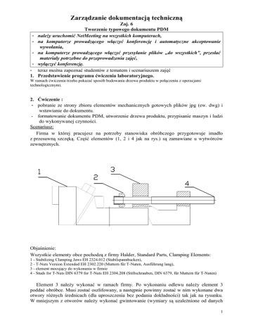 Zarządzanie dokumentacją techniczną 1. Zaj. 6 Tworzenie typowego dokumentu PDM należy uruchomić NetMeeting na wszystkich komputerach, na komputerze prowadzącego włączyć konferencję i automatyczne akceptowanie wywołania, na komputerze prowadzącego włączyć przesyłanie plików „do wszystkich”, przesłać materiały potrzebne do przeprowadzenia zajęć, wyłączyć konferencję. teraz można zapoznać studentów z tematem i scenariuszem zajęć Przedstawienie programu ćwiczenia laboratoryjnego. W ramach ćwiczenia trzeba pokazać sposób budowania drzewa produktu w połączeniu z operacjami technologicznymi. 2. Ćwiczenie : - pobranie ze strony zbioru elementów mechanicznych gotowych plików jpg (ew. dwg) i wstawianie do dokumentu. - formatowanie dokumentu PDM, utworzenie drzewa produktu, przypisanie maszyn i ludzi do wykonywanej czynności. Scenariusz: Firma w której pracujesz na potrzeby stanowiska obróbczego przygotowuje imadło z przesuwną szczęką. Część elementów (1, 2 i 4 jak na rys.) są zamawiane u wytwórców zewnętrznych. Objaśnienie: Wszystkie elementy obce pochodzą z firmy Halder, Standard Parts, Clamping Elements: 1 - Stabilizing Clamping Jaws EH 2324.012 (Stabilspannbacken), 2 - T-Nuts Version Extended EH 2302.220 (Muttern für T-Nuten, Ausführung lang), 3 - element mocujący do wykonania w firmie 4 - Studs for T-Nuts DIN 6379 for T-Nuts EH 2304.208 (Stiftschrauben, DIN 6379, für Muttern für T-Nuten) Element 3 należy wykonać w ramach firmy. Po wykonaniu odlewu należy element 3 poddać obróbce. Musi zostać oszlifowany, a następnie powinny zostać w nim wykonane dwa otwory różnych średnicach (dla uproszczenia bez podania dokładności) tak jak na rysunku. W mniejszym z otworów należy wykonać gwintowanie (wymiary są uzależnione od danych 1 Zarządzanie dokumentacją techniczną technicznych części zamówionych u zewnętrznego wytwórcy, które odczytać można z katalogu) . Z katalogu części, na stronie http://www.traceparts.com/ (wersja angielskojęzyczna, jest jeszcze do wyboru francuska, niemiecka, japońska i włoska) po wyszukaniu wytwórcy, można pobrać rysunki poszczególnych elementów składowych w formacie jpg lub dwg dla utworzenia drzewa produktu. Aby to wykonać należy: – wybrać w menu „For CAD users”, tracepartsonline.net; – następnie: „Download free CAD drawings”, zostawić domyślny j. angielski lub niemiecki (firma jest niemiecka) – wybrać „Halder normalien” a następnie w Standard Parts elementy jak wyżej opisano. Pobierając rysunek należy przepisać Bill of Material tłumacząc: Description = Opis, Order Number = Numer porządkowy, Selection = Wybór, Supplier = Dostawca. Z History można (nie trzeba) przepisać podstawowe dane techniczne części. Uwaga: w celu pobrania elementu z katalogu studenci muszą się zalogować na stronie PowerParts on Web. Uruchomienie katalogu może wymagać włączenia wirtualnej maszyny Java w Windows XP – do pobrania ze strony np. http://www2.centrumxp.pl/Programy/ itd. (Java Virtual Machine 1.4.2.05) . Po utworzeniu drzewa produktu, do każdej czynności należy przypisać człowieka i ew. maszynę. Zakładamy, że mamy trzech ludzi oraz dwie maszyny: szlifierkę i wiertarkę pionową. Należy podać kolejność wykonywania operacji. Materiały: - zadanie z rysunkiem - strona TraceParts on Web; - wzorzec dokumentu PDM. 2