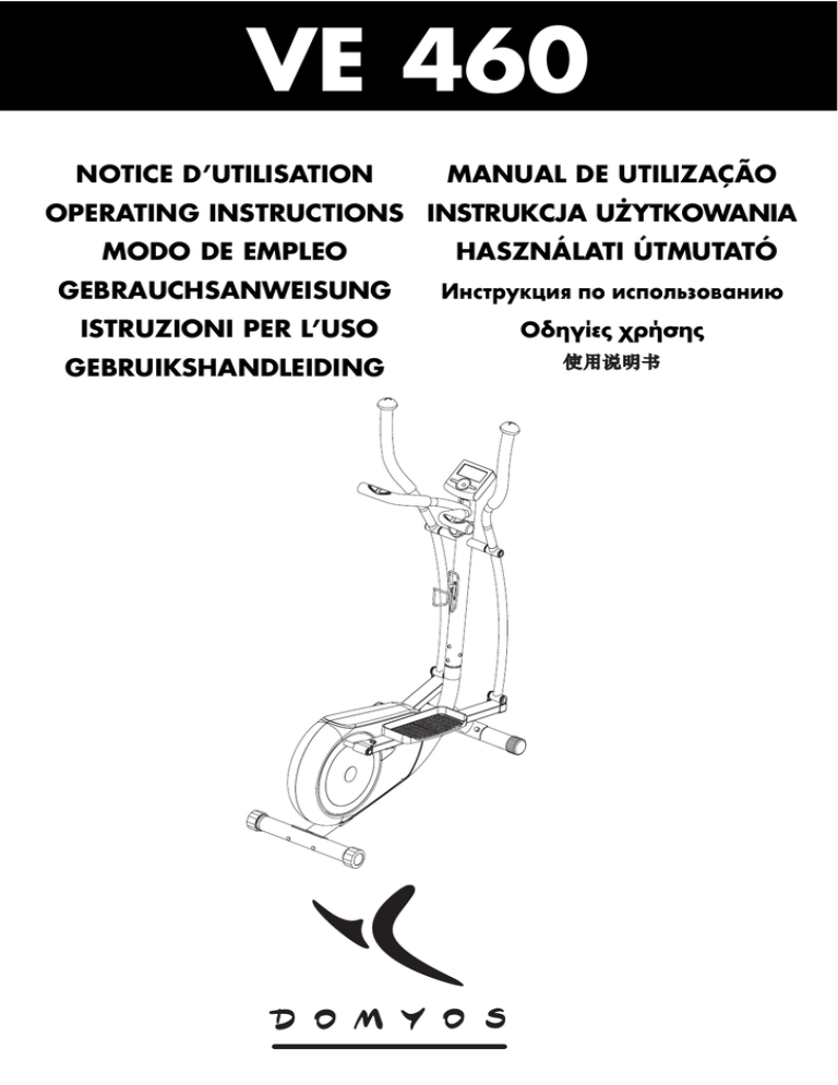 VE 460 NOTICE D’UTILISATION MANUAL DE UTILIZAÇÃO OPERATING INSTRUCTIONS INSTRUKCJA UŻYTKOWANIA MODO DE EMPLEO HASZNÁLATI ÚTMUTATÓ GEBRAUCHSANWEISUNG Инструкция по использованию ISTRUZIONI PER L’USO Οδηγίες χρήσης GEBRUIKSHANDLEIDING VE 460 Réalisation : EVOLUTION + 32 / 69 250 500 Notice à conserver Keep these instructions Bitte bewahren Sie diese Hinweise auf Istruzioni da conservare Conservar instrucciones Bewaar deze handleiding Instruções a conservar Zachowaj instrukcję Őrizze meg a használati útmutatót Сохранить инструкцию DECATHLON - 4, Boulevard de Mons - 59665 Villeneuve d'Ascq - France Made in China - Hecho en China Réf. pack : 425.980 - CNPJ : 02.314.041/0001-88 - - MONTAGE • ASSEMBLY •MONTAJE • MONTAGE • MONTAGGIO • AFWERKING • MONTAGEM • MONTAŻ • SZERELÉS • Сборка • Συναρμολόγηση • 3 4 1 2 B 5 3 D 6 4 C 7 5 G 8 P O L S K I Wybrali Pańs WO sprzęt fitness marki DOMYOS. Dziękujemy za zaufanie, jakie okazali Państwo dla naszych wyrobów. Stworzyliśmy markę DOMYOS, aby pomóc wszystkim miłośnikom sportu w utrzymywaniu formy. Produkt stworzony przez i dla miłośników sportu. Chętnie zapoznamy się z Państwa uwagami i sugestiami dotyczącymi produktów DOMYOS. Do Państwa dyspozycji jest cały zespół sklepu oraz dział projektowy produktów DOMYOS. Można wysyłać do nas wiadomość e-mail na następujący adres: www.decathlon.com Życzymy Państwu udanych ćwiczeń, wyrażając nadzieję, że ten właśnie produkt DOMYOS stanie się dla Państwa synonimem przyjemności. Konsola Czujnik tętna Pokrętło regulacji oporu Kierownica i uchwyty Rurka podtrzymująca kierownicę PRZÓD LEWA STRONA Pedał VE 460 PRAWA STRONA TYŁ 36 kg 79,6 lbs 148 x 46 x 120 cm 58 x 18 x 47 inch OSTRZEŻENIE Model nr : _ _ _ _ _ _ _ _ _ _ _ _ _ _ _ _ _ _ _ Nr seryjny : _ _ _ _ _ _ _ _ _ _ _ _ _ _ _ _ _ Należy przeczytać wszystkie uwagi odnoszące się do urządzenia. Aby móc uzyskać w przyszłości dodatkowe informacje, prosimy o wpisanie powyżej numeru seryjnego. Przed rozpoczęciem użytkowania należy zapoznać się ze wszystkimi uwagami oraz zaleceniami dotyczącymi obsługi urządzenia, zamieszczonymi w niniejszej instrukcji. Instrukcję należy zachować, aby w razie potrzeby móc z niej skorzystać w przyszłości. Nr seryjny 65 P O L S K I OPIS VE 460 to urządzenie fitness najnowszej generacji. Produkt wyposażony został w przekładnię magnetyczną, zapewniającą większy komfort i regularność pedałowania. VE460 łączy w sobie ruch okrężny charakterystyczny dla roweru, poziome ruchy towarzyszące bieganiu oraz pionowe ruchy steppera: dzięki temu trening jest kompletny! Eliptyczne ruchy stóp w przód i w tył wraz z ruchami ramion umożliwiają ćwiczenie mięśni ramion, grzbietu, piersi i pośladków, jak również mięśni czworogłowych oraz łydek. BEZPIECZEŃSTWO Ostrzeżenie: aby zmniejszyć niebezpieczeństwo odniesienia poważnych obrażeń, przed użyciem produktu należy przeczytać uważnie poniższe zalecenia obsługi. 1. Przed użyciem produktu należy zapoznać się ze wszystkimi zaleceniami instrukcji obsługi. Urządzenie może być używane wyłącznie w sposób zgodny z instrukcją obsługi. Instrukcję należy przechowywać przez cały okres użytkowania produktu. 13. W przypadku odczuwania bólu lub wystąpienia zawrotów głowy w czasie wykonywania ćwiczeń, należy natychmiast przerwać ćwiczenie, odpocząć i skontaktować się z lekarzem. 14. Do urządzenia nie należy dopuszczać dzieci ani zwierząt domowych. 2. Urządzenie jest zgodne z normami europejskimi oraz chińskimi, dotyczącymi domowych urządzeń do ćwiczeń nie przeznaczonych do celów terapeutycznych (EN-957-1, EN 957-9 klasa HC / odpowiednik GB17498). 15. Nie zbliżać rąk i nóg do elementów w ruchu. 16. Przed rozpoczęciem realizacji programu ćwiczeń, użytkownik powinien koniecznie skontaktować się z lekarzem, aby upewnić się, że nie posiada jakichkolwiek przeciwwskazań, w szczególności, jeżeli użytkownik nie uprawiał sportu od wielu lat. 3. Montażem urządzenia powinna zajmować się osoba dorosła. 4. Do właściciela należy poinformowanie wszystkich użytkowników produktu o wszystkich zaleceniach obsługi. 17. Zapobiegać wystawaniu elementów regulacyjnych. 5. DOMYOS nie ponosi odpowiedzialności za wszelkie skargi związane z obrażeniami lub szkodami poniesionymi przez użytkowników lub stratami materialnymi, wynikłymi z użytkowania lub niewłaściwego użytkowania produktu przez nabywcę lub osoby trzecie (obowiązuje jedynie na terytorium Stanów Zjednoczonych). 18. Nie należy dokonywać żadnych przeróbek urządzenia VE460. 19.W czasie ćwiczeń nie należy garbić się i należy zachować wyprostowaną postawę.. 6. Produkt jest przeznaczony do użytkowania wyłącznie w warunkach domowych. Nie używać produktu do celów komercyjnych, wynajmu lub w firmach. 20. Precyzja odczytu czujnika tętna może zależeć od wielu czynników – nie jest on narzędziem medycznym, ma jedynie na celu ułatwienie użytkownikowi określenia ogólnej tendencji rytmu tętna. 7. Produkt należy użytkować w pomieszczeniach, z dala od wilgoci i kurzu, na płaskim, stabilnym podłożu, w miejscu o wystarczająco dużej powierzchni. Należy upewnić się, czy ilość miejsca jest wystarczająca dla bezpiecznego poruszania się dookoła urządzenia. Aby zabezpieczyć podłogę należy umieścić wykładzinę pod produktem. 21. Osoby noszące rozrusznik pracy serca, defibrylator lub podobne wszczepione urządzenia elektroniczne mogą używać czujnika tętna wyłącznie na własne ryzyko. Przed pierwszym wykorzystaniem urządzenia zalecane jest przeprowadzenie testu pod nadzorem lekarza. 22. Kobiety w ciąży nie powinny używać czujnika tętna. Przed wykorzystaniem urządzenia należy skontaktować się z lekarzem.. 8. Użytkownik jest zobow