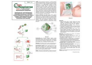 Polski 4.25pl BUZZ z TummyTickle™ stymulowanie dotykiem INSTRUKCJE UŻYTKOWANIA Prawidłowe korzystanie z monitora oddechu Respisense w znacznym stopniu zwiększy Twoje doświadczenie jako użytkownika. Prosimy o uważne przeczytanie tych instrukcji. WAŻNE: Przed rozpoczęciem korzystania z monitora dokładnie przeczytaj wszystkie instrukcje • Stosuj się do tych instrukcji przez cały okres użytkowania monitora • Korzystaj z monitora rozważnie, ponieważ nie jest on w stanie zlokalizować wszystkich zagrożeń oddechowych • Do podtrzymywania monitora nie stosuj prowizorycznych uchwytów, gdyż takie rozwiązanie może być niebezpieczne dla zdrowia dziecka • Przed każdym użyciem sprawdź stan monitora i nie korzystaj z niego jeśli jest uszkodzony, zużyty lub niezdatny do użytku • Monitor może być używany jedynie wtedy, gdy jego alarmy będą z łatwością słyszalne przez opiekuna • Nie otwieraj monitora • Nie wkładaj do środka żadnych części • Gdy monitor nie jest używany, trzymaj go w bezpiecznym miejscu i z dala od dzieci • Zawiera małe części, które mogłyby być niebezpieczne dla dzieci w przypadku rozbiórki • Pozbądź się części opakowania, które mogą być niebezpieczne dla dzieci • W określonych przypadkach do uratowanie dziecka niezbędne mogą być sztuczne oddychanie i masaż serca (CPR). Sztuczne oddychanie lub masaż serca: Monitor oddechu Respisense jest w stanie zaalarmować opiekunów w przypadkach zagrożenia życia. W określonych sytuacjach do uratowania dziecka niezbędny może być masaż serca (CPR), więc nauczenie się CPR może zwiększyć Twoje szanse na uratowanie dziecka. Zwróć się po konkretną poradę i, jeśli uznasz to za przydatne, weź udział w szkoleniu z CPR przed rozpoczęciem użytkowania monitora. Informacje o sztucznym oddychaniu i masażu serca u małych dzieci możesz znaleźć w Internecie lub za pośrednictwem różnych organizacji. Rysunek 1 Uruchomienie: Aby uruchomić urządzenie, naciśnij i krótko przytrzymaj PRZYCISK c. Monitor się włączy i wykona sekwencję samo-testującą, podczas której stymulator dotyku “TummyTickle” zostanie na chwilę uruchomiony, a wskaźniki od d do g zaświecą się i usłyszysz tony rozpoczęcia (niski-wysoki). Przed użyciem monitora upewnij się, czy występują wszystkie te elementy. Wyłączanie: Aby wyłączyć monitor, naciśnij i przytrzymaj przycisk c do momentu aż tony wyłączania (wysoki-niski) będą słyszalne. Przytwierdzanie monitora: Monitor został stworzony tak, aby górna przednia krawędź pieluch jednorazowych oraz części garderoby była dopasowana do mocnych elastycznych gumek wokół talii, pod warunkiem że takie taśmy są wystarczająco cienkie, by monitor mógł z łatwością przesuwać i wystarczająco grube, by monitor mógł je prawidłowo chwytać. Uwaga: Zalecana jest szczególna dbałość o właściwe zamocowanie monitora, w przeciwnym razie monitor może zsunąć się z pieluchy Rysunek 2 Wskazówki: • Monitor wyczuwa ruchy w brzuchu dziecka przy pomocy urządzenia wyczuwającego zmiany ciśnienia za tylną membraną. Aby zapewnić prawidłowe działanie monitora, w czasie jego pracy tylna jego część musi całkowicie i równomiernie przylegać do brzucha dziecka, zazwyczaj w niewielkiej odległości w bok od pępka. • Gdy monitor jest uruchomiony, krótkie naciśnięcie PRZYCISKU c spowoduje, że następstwem wykrycia ruchu będzie słyszalne TYKNIĘCIE. Ponownie naciśnij krótko ten przycisk, by wyłączyć tą funkcję. Ten cykl można powtórzyć. • Jeśli używane pieluchy są bardzo cienkie, lepszy uchwyt możemy osiągnąć, przesuwając mały kawałek materiału po krawędzi pieluchy zanim ustawimy monitor na pieluszce. Jeśli nastąpi zsunięcie monitora w trakcie działania, co jest jednak mało prawdopodobne, wówczas nie dojdzie do wyczucia ruchów dziecka ani alarmu. Wskazówki: Proszę odwołać się do rysunku 1 oraz diagramu wydrukowanego na tylnej części monitora. ZIELONE światło d zapali się, gdy stwierdzony zostanie ruch rytmiczny, głównie podczas snu dziecka. ŻÓŁTE światło e, oznaczone jako “yyy”, zapali się gdy zostanie stwierdzony ruch ogólny, nierytmiczny. POMARAŃCZOWE światło f, oznaczone jako “!”, jest wskaźnikiem gotowości i zapali się, gdy wystąpią następujące okoliczności: • Gdy działa stymulator dotyku lub słychać sygnał alarmu lub • Jeśli uruchomiono stymulator dotyku, ale ruch został wznowiony ponownie przed upływem pięciu sekund, monitor zaświeci się na POMARAŃCZOWO, a nie na ZIELONO ani ŻÓŁTO. CZERWONE światło g, oznaczone jako “x”, jest systemowym wskaźnikiem ostrzegającym i zapali się gdy: • Bateria jest prawie wyczerpana (czerwone światło zapali się podczas ruchu, zamiast innych świateł) lub • Bateria osiąga koniec okresu swojej przydatności. CZERWONE światło może pojawić się w formie serii błyśnięć, którym towarzyszy dźwięk alarmu, gdy napięcie baterii stanie się zbyt małe, aby bateria mogła prawidłowo działać. Patrz sekcja Działanie poniżej. Uwaga: W ciemnym pomieszczeniu wskaźniki będą widoczne przez większość tkanin i koców. Proszę obrócić kartkę … Alarmy: • Pierwotny alarm wystąpi jeśli nie został stwierdzony żaden ruch przez okres 20 kolejnych sekund. Mimo że mogłoby to wskazywać, że dziecko wymaga pilnej uwagi ze strony opiekuna lub specjalisty medycznego, zawsze najlepszym rozwiązaniem na tego typu alarm będzie możliwie najbardziej spokojna reakcja. Nigdy nie trzęś dzieckiem! • Wtórny alarm wystąpi, jeśli stymulator dotyku został uruchomiony sześciokrotnie, ale ruch został za każdym razem wznowiony przed upływem 5 sekund od momentu stymulacji. To może wskazywać, że urządzenie lub pielucha nie są odpowiednio przytwierdzone, że pielucha stała się zbyt mokra i wypycha monitor z okolic brzucha dziecka, lub że ruch został 