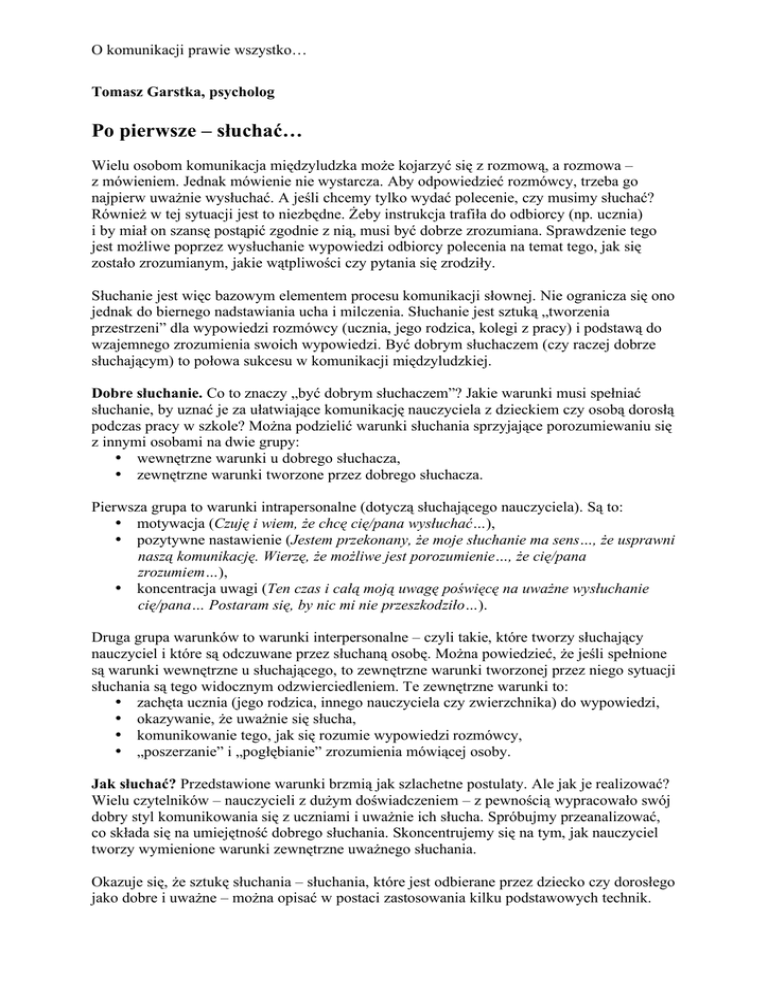 O komunikacji prawie wszystko… Tomasz Garstka, psycholog Po pierwsze – słuchać… Wielu osobom komunikacja międzyludzka może kojarzyć się z rozmową, a rozmowa – z mówieniem. Jednak mówienie nie wystarcza. Aby odpowiedzieć rozmówcy, trzeba go najpierw uważnie wysłuchać. A jeśli chcemy tylko wydać polecenie, czy musimy słuchać? Również w tej sytuacji jest to niezbędne. Żeby instrukcja trafiła do odbiorcy (np. ucznia) i by miał on szansę postąpić zgodnie z nią, musi być dobrze zrozumiana. Sprawdzenie tego jest możliwe poprzez wysłuchanie wypowiedzi odbiorcy polecenia na temat tego, jak się zostało zrozumianym, jakie wątpliwości czy pytania się zrodziły. Słuchanie jest więc bazowym elementem procesu komunikacji słownej. Nie ogranicza się ono jednak do biernego nadstawiania ucha i milczenia. Słuchanie jest sztuką „tworzenia przestrzeni” dla wypowiedzi rozmówcy (ucznia, jego rodzica, kolegi z pracy) i podstawą do wzajemnego zrozumienia swoich wypowiedzi. Być dobrym słuchaczem (czy raczej dobrze słuchającym) to połowa sukcesu w komunikacji międzyludzkiej. Dobre słuchanie. Co to znaczy „być dobrym słuchaczem”? Jakie warunki musi spełniać słuchanie, by uznać je za ułatwiające komunikację nauczyciela z dzieckiem czy osobą dorosłą podczas pracy w szkole? Można podzielić warunki słuchania sprzyjające porozumiewaniu się z innymi osobami na dwie grupy: • wewnętrzne warunki u dobrego słuchacza, • zewnętrzne warunki tworzone przez dobrego słuchacza. Pierwsza grupa to warunki intrapersonalne (dotyczą słuchającego nauczyciela). Są to: • motywacja (Czuję i wiem, że chcę cię/pana wysłuchać…), • pozytywne nastawienie (Jestem przekonany, że moje słuchanie ma sens…, że usprawni naszą komunikację. Wierzę, że możliwe jest porozumienie…, że cię/pana zrozumiem…), • koncentracja uwagi (Ten czas i całą moją uwagę poświęcę na uważne wysłuchanie cię/pana… Postaram się, by nic mi nie przeszkodziło…). Druga grupa warunków to warunki interpersonalne – czyli takie, które tworzy słuchający nauczyciel i które są odczuwane przez słuchaną osobę. Można powiedzieć, że jeśli spełnione są warunki wewnętrzne u słuchającego, to zewnętrzne warunki tworzonej przez niego sytuacji słuchania są tego widocznym odzwierciedleniem. Te zewnętrzne warunki to: • zachęta ucznia (jego rodzica, innego nauczyciela czy zwierzchnika) do wypowiedzi, • okazywanie, że uważnie się słucha, • komunikowanie tego, jak się rozumie wypowiedzi rozmówcy, • „poszerzanie” i „pogłębianie” zrozumienia mówiącej osoby. Jak słuchać? Przedstawione warunki brzmią jak szlachetne postulaty. Ale jak je realizować? Wielu czytelników – nauczycieli z dużym doświadczeniem – z pewnością wypracowało swój dobry styl komunikowania się z uczniami i uważnie ich słucha. Spróbujmy przeanalizować, co składa się na umiejętność dobrego słuchania. Skoncentrujemy się na tym, jak nauczyciel tworzy wymienione warunki zewnętrzne uważnego słuchania. Okazuje się, że sztukę słuchania – słuchania, które jest odbierane przez dziecko czy dorosłego jako dobre i uważne – można opisać w postaci zastosowania kilku podstawowych technik. O komunikacji prawie wszystko… Nie są one skomplikowane, jednak ich łatwość bywa myląca. Wymagają bowiem konsekwentnego i stałego stosowania w kontaktach z ludźmi, by nauczyciel był postrzegany przez innych jako dobry słuchacz. Zapewne wielu czytelników rozpozna metody stosowane przez siebie w praktyce, być może na poziomie nieświadomej już kompetencji (automatycznie), nienazywane przytaczanymi poniżej terminami. Zadbać o atmosferę! Na początek warto zawsze zadbać o warunki rozmowy – czas i miejsce. Jeśli rozmawiamy z kimś w biegu, nie będzie czuł się słuchany. Gdy rozmowa odbywa się w hałasie i na dystans – nie będzie mógł słuchać, bo warunki na to nie pozwolą. Dlatego warto umówić się na rozmowę w cichym miejscu i wyraźnie powiedzieć, ile czasu się na nią przeznacza, by nie robić wrażenia niespodziewanego zakończenia. To zapewnia nam dobre warunki słuchania. Kiedy słuchamy kogoś na forum (ucznia w klasie, rodzica na zebraniu) również warto zadbać, by miał szansę swobodnie się wypowiedzieć, a my – szansę go dobrze wysłuchać. Czasem wystarczy prosty komunikat nauczyciela do grupy: Chcę wysłuchać Janka /panią X i przeszkadza mi w tym szum waszych/państwa rozmów. Proszę teraz o zaprzestanie rozmów i zachęcam, byśmy słuchali się wzajemnie. Mowa ciała. Gdy obserwuje się osobę, która uważnie słucha swojego rozmówcy, widać, że automatycznie przyjmuje ona podczas rozmowy podobną pozycję ciała – są jak lustrzane odbicia. Oczywiście dotyczy to sytuacji, w której chodzi o zachętę do mówienia i uważne słuchanie. Gdy ktoś chce rozkazywać, przybiera postawę dominującą, stara się być „nad” osobą, do której mówi. Tworzenie warunków dobrego słuchania polega jednak na tym dostrojeniu niewerbalnym (pozasłownym). Badacze, zajmujący się procesami porozumiewania się między ludźmi, oszacowali, że w zwykłej rozmowie przekazywanych słowami jest mniej niż 35 proc. informacji. Aż 65 proc. informacji o danej sytuacji rozmówcy czerpią z przekazu niewerbalnego. Zrozumiałe więc, że przyjazne nastawienie – zachętę do mówienia i gotowość do wysłuchania nas – odczytujemy przede wszystkim z postawy ciała, mimiki i ruchów drugiej osoby (patrz tabela). Tab.1. Zachowania niewerbalne w zależności od nastawienia do rozmówcy1 • • • • • • Nastawienia przyjazne Patrzenie rozmówcy w oczy Aprobujące kiwanie głową Uśmiech „Otwarta” postawa ciała Zbliżenie do rozmówcy Naturalna, żywa gestykulacja • • • • • • Nastawienie nieprzyjazne Unikanie wymiany spojrzeń Pochylanie, odwracanie głowy Uboga mimika 