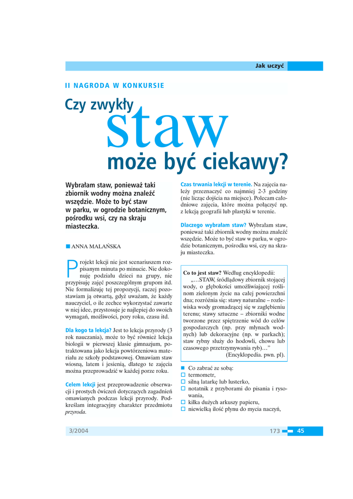 Jak uczyç I I N A G R O D A W KO N K U R S I E Czy zwyk∏y staw mo˝e byç ciekawy? Wybra∏am staw, poniewa˝ taki zbiornik wodny mo˝na znaleêç wsz´dzie. Mo˝e to byç staw w parku, w ogrodzie botanicznym, poÊrodku wsi, czy na skraju miasteczka. ANNA MALA¡SKA P rojekt lekcji nie jest scenariuszem rozpisanym minuta po minucie. Nie dokonuj´ podzia∏u dzieci na grupy, nie przypisuj´ zaj´ç poszczególnym grupom itd. Nie formalizuj´ tej propozycji, raczej pozostawiam jà otwartà, gdy˝ uwa˝am, ˝e ka˝dy nauczyciel, o ile zechce wykorzystaç zawarte w niej idee, przystosuje je najlepiej do swoich wymagaƒ, mo˝liwoÊci, pory roku, czasu itd. Dla kogo ta lekcja? Jest to lekcja przyrody (3 rok nauczania), mo˝e to byç równie˝ lekcja biologii w pierwszej klasie gimnazjum, potraktowana jako lekcja powtórzeniowa materia∏u ze szko∏y podstawowej. Omawiam staw wiosnà, latem i jesienià, dlatego te zaj´cia mo˝na przeprowadziç w ka˝dej porze roku. Celem lekcji jest przeprowadzenie obserwacji i prostych çwiczeƒ dotyczàcych zagadnieƒ omawianych podczas lekcji przyrody. PodkreÊlam integracyjny charakter przedmiotu przyroda. 3/2004 Czas trwania lekcji w terenie. Na zaj´cia nale˝y przeznaczyç co najmniej 2-3 godziny (nie liczàc dojÊcia na miejsce). Polecam ca∏odniowe zaj´cia, które mo˝na po∏àczyç np. z lekcjà geografii lub plastyki w terenie. Dlaczego wybra∏am staw? Wybra∏am staw, poniewa˝ taki zbiornik wodny mo˝na znaleêç wsz´dzie. Mo˝e to byç staw w parku, w ogrodzie botanicznym, poÊrodku wsi, czy na skraju miasteczka. Co to jest staw? Wed∏ug encyklopedii: „…STAW, Êródlàdowy zbiornik stojàcej wody, o g∏´bokoÊci umo˝liwiajàcej roÊlinom zielonym ˝ycie na ca∏ej powierzchni dna; rozró˝nia si´: stawy naturalne – rozlewiska wody gromadzàcej si´ w zag∏´bieniu terenu; stawy sztuczne – zbiorniki wodne tworzone przez spi´trzenie wód do celów gospodarczych (np. przy m∏ynach wodnych) lub dekoracyjne (np. w parkach); staw rybny s∏u˝y do hodowli, chowu lub czasowego przetrzymywania ryb)…” (Encyklopedia. pwn. pl). Co zabraç ze sobà: termometr, silnà latark´ lub lusterko, notatnik z przyborami do pisania i rysowania, kilka du˝ych arkuszy papieru, niewielkà iloÊç p∏ynu do mycia naczyƒ, 173 45 Jak uczyç naczynie szklane, butelk´, sznurek, miseczk´, spinacz biurowy lub ig∏´. Propozycje tematów do realizacji podczas lekcji nad stawem I. Co to jest staw? Zadajemy uczniom pytanie, co wed∏ug nich jest stawem? Grupujemy wszystkie wypowiedzi (np. na arkuszu papieru). Omawiamy ró˝nic´ mi´dzy obiegowym poj´ciem (np. staw to ma∏e jezioro) a bardziej Êcis∏à definicjà stawu u˝ywanà przez przyrodników (patrz wiadomoÊci pomocnicze poni˝ej). Uczniowie mogà naszkicowaç kszta∏t stawu, jego brzegi, otoczenie itd. WiadomoÊci pomocnicze Zgodnie z potocznà opinià staw to ma∏e jezioro. Przyrodnicy uwa˝ajà, ˝e nie odpowiada to prawdzie. Staw to ma∏y, p∏ytki zbiornik wodny (naturalny lub sztuczny). Jego g∏´bokoÊç nie przekracza 2 m. Dzi´ki temu roÊliny mogà pokrywaç ca∏à powierzchni´ dna stawu. RoÊliny wymagajà Êwiat∏a s∏onecznego, które jest jeszcze w stanie dotrzeç do dna tak p∏ytkiego zbiornika. Jeziora majà miejsca, w których dno nie jest pokryte roÊlinnoÊcià (z regu∏y na Êrodku, gdzie jest g∏´boko i Êwiat∏o s∏oneczne nie dociera). Dno stawu jest muliste. Czasem ró˝nice mi´dzy stawem a jeziorem nie sà wyraêne – niektóre partie jezior wyglàdajà jak stawy. Powierzchnie wód jezior mogà byç pokryte roÊlinami p∏ywajàcymi (nie sà zakorzenione w dnie, tak jak roÊliny w stawach). II. Staw sezonowy i staw sta∏y. Pytamy uczniów, czy znajà miejsca w okolicy, gdzie czasami jest staw , a czasami nie. Byç mo˝e w∏aÊnie jesteÊmy w takim miejscu (zw∏aszcza, je˝eli jest to lato). Jaka mo˝e byç przyczyna, ˝e jedne stawy sà obecne przez ca∏y rok, a inne tylko sezonowo? Co dzieje si´ ze zwierz´tami, które ˝yjà w stawie sezonowym? 46 174 Je˝eli znajdujemy si´ nad wyschni´tym stawem, dzieci powinny naszkicowaç, jak taki staw wyglàda. Je˝eli nie ma w okolicy wyschni´tego stawu, mo˝na zasugerowaç wykonanie rysunku z wyobraêni. Odpowiedzi dzieci, ich wiadomoÊci z lekcji przyrody, zapisujemy na du˝ym arkuszu papieru. WiadomoÊci pomocnicze Niektóre stawy sà stawami przez ca∏y rok, inne tylko sezonowo – z regu∏y wiosnà i jesienià. Je˝eli wody gruntowe sà g∏´boko pod powierzchnià, a staw jest szczególnie p∏ytki, to sà sprzyjajàce warunki, by ca∏a woda ze stawu wyparowa∏a (np. w goràce letnie dni). Takie stawy nazywamy sezonowymi. W stawach sezonowych ˝yjà gatunki roÊlin i zwierzàt, które rozwijajà si´ i sà aktywne, gdy w stawie jest woda. Gdy staw wysycha, organizmy te przechodzà w form´ przetrwalnikowà lub prze˝ywajà suchy sezon, ukryte w b∏otnistym dnie stawu. Trwajà tak w stanie hibernacji, dopóki staw znowu nie nape∏ni si´ wodà. Du˝e roÊliny ˝yjàce w stawach bardzo szybko produkujà swoje nasiona (w ciàgu kilku tygodni). Gdy staw wyschnie, roÊliny te umierajà, ale pozostawione nasiona, gdy tylko sezonowy staw nape∏ni si´ wodà, natychmiast wykie∏kujà i dadzà ˝ycie nowym roÊlinom. III. Woda, temperatura i tlen. Pytamy uczniów, czy organizmom ˝yjàcym w wodzie jest potrzebny do ˝ycia tlen. Pytamy, czy w wodzie jest obecny tlen i czy jego iloÊç zale˝y od temperatury wody. Pytamy, jak g´stoÊç wody (charakterystyczna wielkoÊç fizyczna) zale˝y od temperatury? Polecamy uczniom zaczerpnàç do pojemnika wod´ z powierzchni stawu oraz z jego dna. Najlepiej przywiàzaç do sznurka pustà butelk´, obcià˝yç jà i rzuciç na dno stawu. Nast´pnie nale˝y poczekaç 2–3 minuty, a˝ butelka nape∏ni si´ wodà i szybko jà wyciàgnàç – dzi´ki wàskiemu otworowi butelki woda z dna nie zdà˝y si´ wymieszaç z wodà z powierzchni jeziora. biologia w