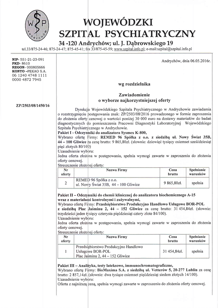 voI'EWoDZKI SZPITAL PSYCHIATRYCZNY 34 -120An lrych6w,'ul. ]. D4browskiego L9 f x 33l8'7 e-mail:[email protected] 5-45-59;www.szpital.info.pl; tel.33l87 5-24-46;875- 4-47;875-45-41; NrP-551-21-23-091 PKD- 8610 REGON-000805666 KONTO-PEKAOS.A. 06 1240 4748 rrll oooo 4872 7945 Andrych6w, dnia06.05.2016r. wgrozdzielnika Zawiadomienie o wyborze naj korzystniejszej oferty zPt2503t08n4s0l16 Dyrekc r Wojew6dzkiego Szpitala Psychiatrycznegow Andrychowie zawiadamia I 08/20I 6 prowadzonego w formie zaproszenia o rozstrzygnigciu rostppowania znak: ZP 12503 ponizej o wartoSci 30 000 euro na dostawy material6w do badari do zloZeniaoferb cenowej diagnosfycznych o pomieszczeniaPracowni Diagnostyki Laboratoryjnej Wojew6dzkiego SzpitalaPsychiatr cznegow Andrychowie. Pakiet I - Odczyr riki do analizatoraSysmexK-800, 'irmy: REMED 96 Sp6lka z o.o. z siedzib4 ul. Nowy Swiat 35B, Wybrano ofertg (slownie: dziewig6tysigcy osiemsetszeS6dziesi4t 44 - 100 Gliwice a cenQbrutto: 9 865,8021. piq6zlotych80/ll ) Uzasadnieniewyl ru: Jedna oferta zlo2 r w postgpowaniu, spelnia wymogi zawarte w zaproszeniu do zlo2enia oferfy cenowej. StreszczeniezloLr i oferfv: Spelnianie Cena Nr Nazwa Firmy warunk6w brutto oferty 2 REME ) 96 So6lkaz o.o. ul. Nor v Swiat 358. 44 - 100Gliwice 9 865,8021. speinia Pakiet II - Odczl Lnikido chemii klinicznej do analizatorabiochemicznegoA-15 wraz z materialar i kontrolnymi i zuiywalnymi, Wybrano ofertg Fi ny : P rzedsigbiorstwoProd ukcyj no Hand lowo Uslugowe BOR-POL 'aSminu 2, 44 - 152 Gliwice za cene brutto: 31 454,842L(slowni z siedzib4 Plac trzydzieici jedent siEcyczterystapiEidziesiqtcztery zlote 841100). Uzasadnieniewyb ru: Jedna oferta zlo2< ra w postEpowaniu,spelnia wymogi zawartew zaproszeniudo zlozen a oferly cenowej. StreszczeniezloAa ei oferfy: Cena Spelnianie Nr Nazwa Firmy warunk6w brutto oferty I I Przeds>biorstwoProdukcyjnoHandlowo Uslugc ve BOR-POL PlacJa minu 2, 44 - 152Gliwice 31454,84z,+. spelnia immunochromatograficzne, Pakiet III - Anali yka,tesfylateksowe, Wybrano oferlg F my: BioMaximaS.A.z siedzib4ul. Vetter6w5,20-277Lublin za ce Y piE6dziesiqt zlorych14l100). siedem brutto: 2 857,142l..slownie: dwatysiEce osiemset UzasadnienielYyb :u: do zloZenia oferfycenowej. w zaproszeniu Oferta znajnilszq en4 spelniawymogizawarte Streszczenie i Nr oferty Nazwa Firmy Cena brutto Spelnianie warunk6w 4 ,,AQI A-MED" ZPAM-KOLASASpul. Tr ugutta55,90-323N-6dz 3 585,6021. spelnia 5 BioM ximaS.A. ul. Ve ter6w5, 20-277Lublin 2 857,14z,1. spelnia Pakiet IV- Odr Wybrano ofertg l z siedzib4 ul. P, tysigc iedena6cie Uzasadnienie wy ledna oferla zlo: >fertycenowej. )treszczeniezloi Nr oferty n nie zlo2onvch ofert: ynniki do elektrolit6w(s6d,potas,lit) do analizatoraAvl, 91g0, rmy:Przedsigbiorstwo Produkcjii Handlu,,MEDRIV,'Sp.z o.o. igonowa2/18,04 - 051 warszawa za cenQbrutto: ttgqi,goz+.(slowni< dziewigisetcrterdzielciczteryzloteg0/100;. tru: rna w postgpowaniu,spelniawymogi zawartew zaproszeniu do zloheni Nazwa Firmy Przedsgbiorstwo Produkcjii Handlu ,,MED UV" Sp.z o.o. - 051Warszawa ul. Pol ,,onowa2/78,04 Cena brutto Spelnianie warunk6w Il944,8021. spelnia O miejscui DziEkujemyza udzialw postgpowaniu Otrzymuj4 l. Przedsipbiorstwo P dukcyjnoHandlowoUslugoweBOR-POLplacJaSminu 2,44 - 152Gliwice, 2. REMED96 Sp6lka o.o.,ul.NowySwiat35B, 44 - 100Gliwice, 3. Przedsigbiorstwo P dukcjiiHandlu,,MEDRIV" Sp.z o.o.ul.poligonowa Z/1g,04-051Warszawa, 4. ,,AQUA-MED"ZP VI-KOLASASp.J.,ul. Traugutra55,90-323 L6di., 5. BioMaxima S.A.,u Vetter6w5, 20-277Lublin, 6. stronainternetow4 blicaosloszefi.