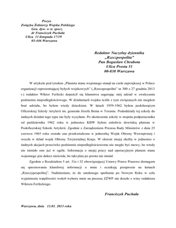 Prezes Związku Żołnierzy Wojska Polskiego Gen. dyw. w st. spocz. dr Franciszek Puchała Ulica 11 listopada 17/19 03-446 Warszawa Redaktor Naczelny dziennika „Rzeczpospolita” Pan Bogusław Chrabota Ulica Prosta 51 00-838 Warszawa W artykule pod tytułem „Planista stanu wojennego stanął na czele największej w Polsce organizacji reprezentującej byłych wojskowych” („Rzeczpospolita” nr 300 z 27 grudnia 2013 r.) redaktor Wiktor Ferfecki dopuścił się kłamstwa sugerując mój udział w zwalczaniu podziemia niepodległościowego. W działaniach wojska ściśle z tym związanych nie mogłem brać udziału, bo byłem wtedy dzieckiem. W latach 1959-1962 byłem podchorążym Oficerskiej Szkoły Artylerii im. generała Józefa Bema w Toruniu. Pododdziały tej szkoły do żadnych działań tego typu nie były wysyłane. Po ukończeniu szkoły w stopniu podporucznika od października 1962 roku w jednostce KBW byłem zaledwie dowódcą plutonu w Podoficerskiej Szkole Artylerii. Zgodnie z Zarządzeniem Prezesa Rady Ministrów z dnia 25 czerwca 1965 roku została ona przekształcona w jednostkę Wojsk Obrony Wewnętrznej i weszła w skład wojsk Obrony Terytorialnej Kraju. W okresie mojej służby w jednostce o żadnych akcjach przeciwko podziemiu niepodległościowemu nie mogło być mowy, bo wtedy nie istniało ono już w ogóle. Informacja o mojej pracy nad operacyjnym planem stanu wojennego jest dalece nieścisła, bo taki plan po prostu nie istniał. Zgodnie z Rozdziałem 5 art. 31a i 32 obowiązującej Ustawy Prawo Prasowe domagam się sprostowania kłamliwej informacji o mnie i oczekuję przeprosin na łamach „Rzeczypospolitej”. Nadmieniam, że do ustalonego spotkania po Nowym Roku w celu wyjaśnienia wątpliwości wokół wyboru mnie na prezesa ZŻWP nie doszło z winy redaktora Wiktora Ferfeckiego. Franciszek Puchała Warszawa, dnia 13.01. 2013 roku