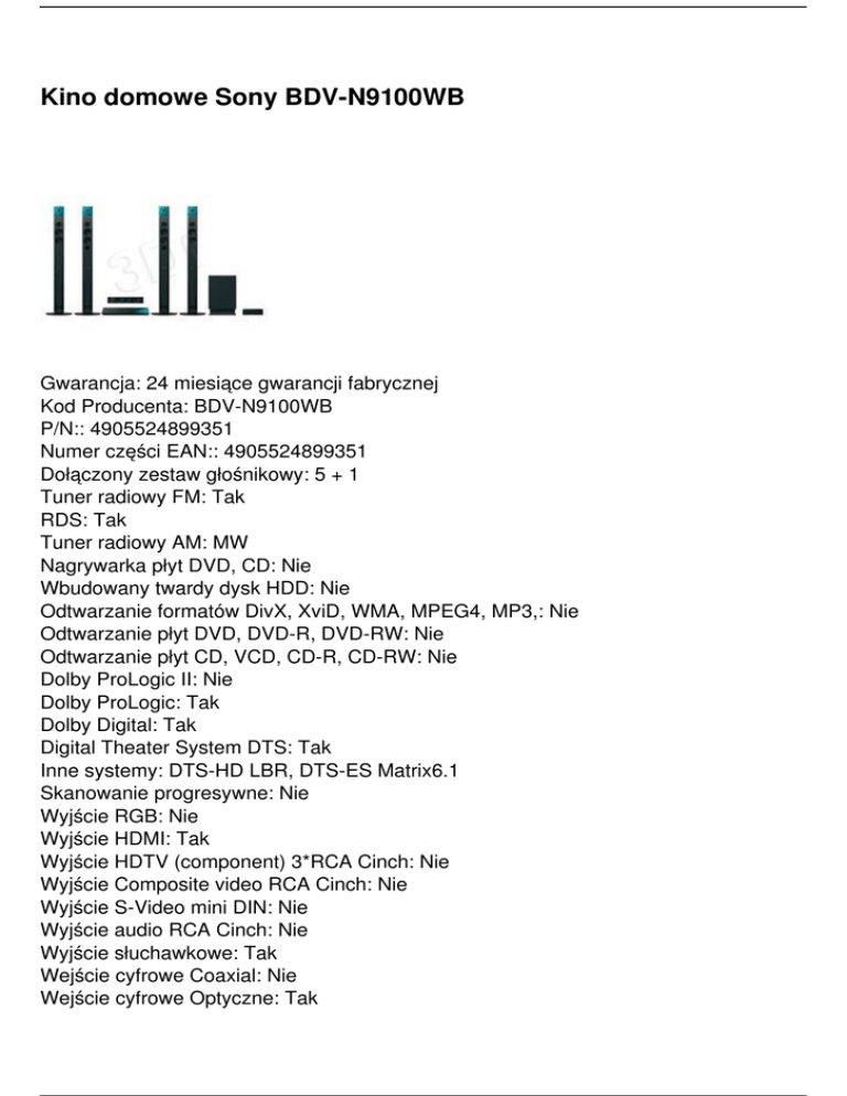 Kino domowe Sony BDV-N9100WB Gwarancja: 24 miesiące gwarancji fabrycznej Kod Producenta: BDV-N9100WB P/N:: 4905524899351 Numer części EAN:: 4905524899351 Dołączony zestaw głośnikowy: 5 + 1 Tuner radiowy FM: Tak RDS: Tak Tuner radiowy AM: MW Nagrywarka płyt DVD, CD: Nie Wbudowany twardy dysk HDD: Nie Odtwarzanie formatów DivX, XviD, WMA, MPEG4, MP3,: Nie Odtwarzanie płyt DVD, DVD-R, DVD-RW: Nie Odtwarzanie płyt CD, VCD, CD-R, CD-RW: Nie Dolby ProLogic II: Nie Dolby ProLogic: Tak Dolby Digital: Tak Digital Theater System DTS: Tak Inne systemy: DTS-HD LBR, DTS-ES Matrix6.1 Skanowanie progresywne: Nie Wyjście RGB: Nie Wyjście HDMI: Tak Wyjście HDTV (component) 3*RCA Cinch: Nie Wyjście Composite video RCA Cinch: Nie Wyjście S-Video mini DIN: Nie Wyjście audio RCA Cinch: Nie Wyjście słuchawkowe: Tak Wejście cyfrowe Coaxial: Nie Wejście cyfrowe Optyczne: Tak Pilot: Na wyposażeniu Port USB: Tak Czytnik kart pamięci: Nie Informacje dodatkowe: Moc całkowita: 1000W http://: http://www.sony.pl/product/hc... #tab Cena: 3847.44 PLN Powered by TCPDF (www.tcpdf.org)