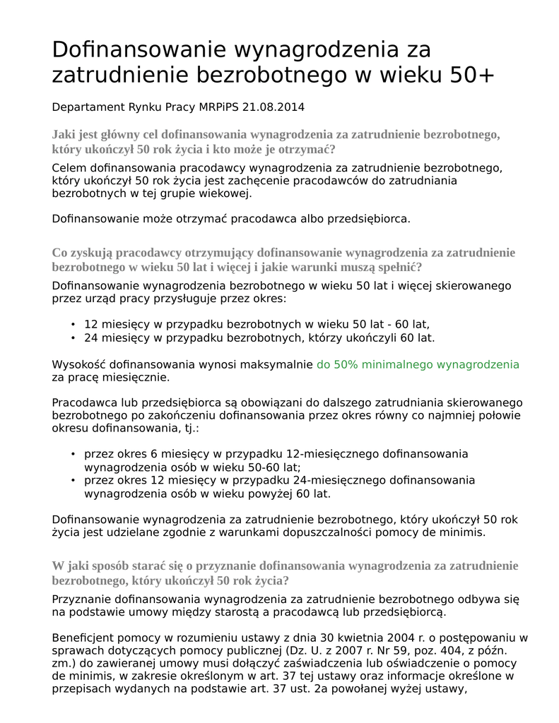 Dofinansowanie wynagrodzenia za zatrudnienie bezrobotnego w wieku 50+ Departament Rynku Pracy MRPiPS 21.08.2014 Jaki jest główny cel dofinansowania wynagrodzenia za zatrudnienie bezrobotnego, który ukończył 50 rok życia i kto może je otrzymać? Celem dofinansowania pracodawcy wynagrodzenia za zatrudnienie bezrobotnego, który ukończył 50 rok życia jest zachęcenie pracodawców do zatrudniania bezrobotnych w tej grupie wiekowej. Dofinansowanie może otrzymać pracodawca albo przedsiębiorca. Co zyskują pracodawcy otrzymujący dofinansowanie wynagrodzenia za zatrudnienie bezrobotnego w wieku 50 lat i więcej i jakie warunki muszą spełnić? Dofinansowanie wynagrodzenia bezrobotnego w wieku 50 lat i więcej skierowanego przez urząd pracy przysługuje przez okres: • 12 miesięcy w przypadku bezrobotnych w wieku 50 lat - 60 lat, • 24 miesięcy w przypadku bezrobotnych, którzy ukończyli 60 lat. Wysokość dofinansowania wynosi maksymalnie do 50% minimalnego wynagrodzenia za pracę miesięcznie. Pracodawca lub przedsiębiorca są obowiązani do dalszego zatrudniania skierowanego bezrobotnego po zakończeniu dofinansowania przez okres równy co najmniej połowie okresu dofinansowania, tj.: • przez okres 6 miesięcy w przypadku 12-miesięcznego dofinansowania wynagrodzenia osób w wieku 50-60 lat; • przez okres 12 miesięcy w przypadku 24-miesięcznego dofinansowania wynagrodzenia osób w wieku powyżej 60 lat. Dofinansowanie wynagrodzenia za zatrudnienie bezrobotnego, który ukończył 50 rok życia jest udzielane zgodnie z warunkami dopuszczalności pomocy de minimis. W jaki sposób starać się o przyznanie dofinansowania wynagrodzenia za zatrudnienie bezrobotnego, który ukończył 50 rok życia? Przyznanie dofinansowania wynagrodzenia za zatrudnienie bezrobotnego odbywa się na podstawie umowy między starostą a pracodawcą lub przedsiębiorcą. Beneficjent pomocy w rozumieniu ustawy z dnia 30 kwietnia 2004 r. o postępowaniu w sprawach dotyczących pomocy publicznej (Dz. U. z 2007 r. Nr 59, poz. 404, z późn. zm.) do zawieranej umowy musi dołączyć zaświadczenia lub oświadczenie o pomocy de minimis, w zakresie określonym w art. 37 tej ustawy oraz informacje określone w przepisach wydanych na podstawie art. 37 ust. 2a powołanej wyżej ustawy, przedkładane na wymaganym formularzu. Limit pomocy de minimis stanowi równowartość 200 tys. euro w okresie trzech kolejnych lat obrotowych. Obowiązki pracodawcy W przypadku nieutrzymania zatrudnienia skierowanego bezrobotnego w okresie przysługiwania dofinansowania wynagrodzenia lub też rezygnacji z dalszego zatrudnienia po zakończeniu dofinansowania - pracodawca lub przedsiębiorca są obowiązani do zwrotu wszystkich otrzymanych środków wraz z odsetkami ustawowymi. Dodatkowe informacje Na stronie internetowej Urzędu Ochrony Konkurencji i Konsumentów znajdują się m.in.: • szczegółowe informacje dotyczące pomocy de minimis; • polskie akty prawne związane z udzielaniem m.in. pomocy de minimis; • unijne akty prawne. Podstawa prawna • ustawa z dnia 20 kwietnia 2004 r. o promocji zatrudnienia i instytucjach rynku pracy (Dz. U. z 2016 r. poz. 645, z późn. zm.) – art. 60d.