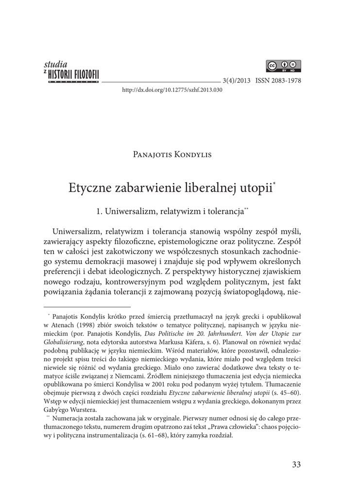http://dx.doi.org/10.12775/szhf.2013.030 Panajotis Kondylis Etyczne zabarwienie liberalnej utopii* 1. Uniwersalizm, relatywizm i tolerancja** Uniwersalizm, relatywizm i tolerancja stanowią wspólny zespół myśli, zawierający aspekty filozoficzne, epistemologiczne oraz polityczne. Zespół ten w całości jest zakotwiczony we współczesnych stosunkach zachodniego systemu demokracji masowej i znajduje się pod wpływem określonych preferencji i debat ideologicznych. Z perspektywy historycznej zjawiskiem nowego rodzaju, kontrowersyjnym pod względem politycznym, jest fakt powiązania żądania tolerancji z zajmowaną pozycją światopoglądową, niePanajotis Kondylis krótko przed śmiercią przetłumaczył na język grecki i opublikował w Atenach (1998) zbiór swoich tekstów o tematyce politycznej, napisanych w języku niemieckim (por. Panajotis Kondylis, Das Politische im 20. Jahrhundert. Von der Utopie zur Globalisierung, nota edytorska autorstwa Markusa Käfera, s. 6). Planował on również wydać podobną publikację w języku niemieckim. Wśród materiałów, które pozostawił, odnaleziono projekt spisu treści do takiego niemieckiego wydania, które miało pod względem treści niewiele się różnić od wydania greckiego. Miało ono zawierać dodatkowe dwa teksty o tematyce ściśle związanej z Niemcami. Źródłem niniejszego tłumaczenia jest edycja niemiecka opublikowana po śmierci Kondylisa w 2001 roku pod podanym wyżej tytułem. Tłumaczenie obejmuje pierwszą z dwóch części rozdziału Etyczne zabarwienie liberalnej utopii (s. 45–60). Wstęp w edycji niemieckiej jest tłumaczeniem wstępu z wydania greckiego, dokonanym przez Gaby’ego Wurstera. ** Numeracja została zachowana jak w oryginale. Pierwszy numer odnosi się do całego przetłumaczonego tekstu, numerem drugim opatrzono zaś tekst „Prawa człowieka”: chaos pojęciowy i polityczna instrumentalizacja (s. 61–68), który zamyka rozdział. * 33 Panajotis Kondylis zależnie od tego, czy owa pozycja znajduje się po stronie uniwersalizmu czy relatywizmu. Niezależnie od specyfiki użytych pojęć i od tego, czy chodzi o dokładnie określoną teoretyczną postawę czy niejasny stan ducha, uniwersalizm i relatywizm są o wiele starsze i powszechniejsze niż żądanie tolerancji, które pojawiło się w Europie Zachodniej w czasach nowożytnych. Pojawienie się żądania tolerancji na horyzoncie europejskim było tutaj warunkiem koniecznym, ale nie wystarczającym. O tym ostatnim można mówić dopiero w momencie, gdy żądanie tolerancji zmieniło się pod względem treści. Najpierw podnoszono je, by powołać do istnienia, obok istniejącego autorytetu wiary chrześcijańskiej, ideę autonomicznego rozumu, niezależną od tego autorytetu. Żądanie myślenia rozumno-autonomicznego i żądanie tolerancji łączą się tym samym przeciw teologii. Jednakże istnienie tego wciąż potężnego wroga nakazywało zachowanie ostrożności. Rozum miał prawo tolerować w zasadzie tylko to, co było rozumne i tym samym etyczne (oczywiście nie w sensie teologicznym). W przeciwnym razie zagrażał mu zarzut popadnięcia w nihilizm i libertynizm, co dostarczyłoby teologom odpowiednich argumentów w walce z nim, inaczej mówiąc, dostarczyłby broni, na którą czekali. Dlatego też większość przedstawicieli oświecenia (mimo wyraźnego opowiedzenia się Bayle’a za moralnym ateizmem) wykluczała bezbożników i rozpustników z krainy, w której obowiązywać miała zasada tolerancji. Dodajmy w tym miejscu, że pierwotne powiązanie rozumu z (nową) etyką w ogóle nie rozstrzygało kwestii charakteru rozumu jako cechy ludzkiej. Rozum normatywny mógł mieć swoje korzenie zarówno w intelekcie, jak i w uczuciu. W języku oświecenia rozum i intelekt nie były w żadnym wypadku synonimami, w szczególności w odniesieniu do etyki. Odległość między kontekstem wczesnego liberalizmu a rzeczywistością schyłku XX wieku jest olbrzymia. Wróg teologiczny już dawno stracił swój pazur, a jego starania, by nadążyć za duchem czasu, budzą u jednych współczucie, u drugich zaś wywołują uśmiech. Przezwyciężenie niedostatku dóbr przez demokrację masową, która na masową skalę je produkuje i konsumuje, to zjawisko wyjątkowe, niemające analogii w historii. Doprowadziło ono jednak nie tylko do wyeliminowania ideału ascetyzmu, ale także rozerwało związek idei etycznej, pojmowanej zasadniczo w oświeceniowo-liberalnym sensie, w powiązaniu z przezwyciężaniem samego siebie, przybliżając ów związek do idei samorealizacji. Na tym materialnym i socjopsychologicznym gruncie powstał pluralizm postaw religijnych i życiowych, chroniony przez państwo, na tle którego wcześniej określona idea rozumu musiała stracić swoją uniwersalną, kognitywną i etyczną kompetencję. O ile ideę 34 Etyczne zabarwienie liberalnej utopii przezwyciężenia samego siebie można wyjaśnić za pomocą zasad rozumu w jego pierwotnym sensie, o tyle samorealizacja kieruje się skłonnościami egzystencjalnymi i własnymi preferencjami światopoglądowymi podmiotu. Egzystencja czuje się nawet uprawniona do odnajdowania się w tym, co nieracjonalne lub złe, oraz do sprzeciwu wobec totalitaryzmu zasady rozumu, o ile ten próbuje ze swojej interpretacji świata uczynić gorset polityczny i etyczny, zakładany na siłę każdemu człowiekowi. Tak postrzegane żądanie tolerancji uwalnia się od zasady rozumu. Rozum bowiem już nie określa granic tego, co winno być tolerowane, a samo żądanie tolerancji jako postawa (możliwe, że sama w sobie nietolerancyjna) musi być tolerowana i tym samym podporządkowana nakazowi tolerancji. Z drugiej jednak strony nadal istnieje związek między tolerancją i rozumem w takim sensie, że tolerancja, pomijając różnice w zakresie racjonalnej bądź nieracjonalnej treści, pojmowana jest jako nakaz etyczno-humanistycznego rozumu. I tutaj w kontekście żądania tolerancji do