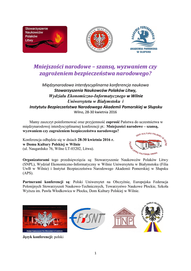 Mniejszości narodowe – szansą, wyzwaniem czy zagrożeniem bezpieczeństwa narodowego? Międzynarodowa interdyscyplinarna konferencja naukowa Stowarzyszenia Naukowców Polaków Litwy, Wydziału Ekonomiczno-Informatycznego w Wilnie Uniwersytetu w Białymstoku i Instytutu Bezpieczeństwa Narodowego Akademii Pomorskiej w Słupsku Wilno, 28-30 kwietnia 2016 Mamy zaszczyt poinformować oraz przyjemność zaprosić Państwa do uczestnictwa w międzynarodowej interdyscyplinarnej konferencji pt.: Mniejszości narodowe – szansą, wyzwaniem czy zagrożeniem bezpieczeństwa narodowego? Konferencja odbędzie się w dniach 28-30 kwietnia 2016 r. w Domu Kultury Polskiej w Wilnie (ul. Naugarduko 76, Wilno LT-03202, Litwa). Organizatorami tego przedsięwzięcia są: Stowarzyszenie Naukowców Polaków Litwy (SNPL), Wydział Ekonomiczno-Informatyczny w Wilnie Uniwersytetu w Białymstoku (Filia UwB w Wilnie) i Instytut Bezpieczeństwa Narodowego Akademii Pomorskiej w Słupsku (APS). Partnerami konferencji są: Polski Uniwersytet na Obczyźnie, Europejska Federacja Polonijnych Stowarzyszeń Naukowo-Technicznych, Towarzystwo Naukowe Płockie, Szkoła Wyższa im. Pawła Włodkowica w Płocku, Dom Kultury Polskiej w Wilnie. Język konferencji: polski 1 Zmiany polityczne, społeczno-ekonomiczne i kulturowe w wielu regionach zglobalizowanego świata, naruszanie ustalonego status quo, procesy migracyjne i tendencje radykalizacji określonych grup społecznych, a także inne wyzwania i zagrożenia dla bezpieczeństwa regionalnego i narodowego wymagają nie tylko szczególnej analizy tych procesów z pozycji nauk o bezpieczeństwie, ale też wykorzystania osiągnięć filozofii i pedagogiki, socjologii i politologii, historii i prawa oraz innych nauk społecznych. W tym kontekście szczególne miejsce ma analiza postrzegania, modelowania, i organizacji procesów integracyjnych w społeczeństwach wielonarodowych, umiejętność wykorzystania potencjału i szans mniejszości narodowych zarówno wewnątrz kraju, jak i w kontaktach z ich macierzystymi społecznościami innych państw, a także oparte na prognostycznych badaniach naukowych dostrzeganie potencjalnych wyzwań i zagrożeń, które mogą zaistnieć we współczesnych państwach wielonarodowych. Konferencja nawiązuje do tematów i problemów, które zostały poruszone w 2014 roku na konferencji Stowarzyszenia Naukowców Polaków Litwy z Polskim Towarzystwem Myśli Politycznej pt.: Rodzinna Europa. Europejska myśl polityczna a wyzwania XXI wieku, takich jak: - bezpieczeństwo państw europejskich, - rola i znaczenie mniejszości narodowych. Celem konferencji jest nie tylko analiza współczesnych zadrażnień i problemów powstających na linii tytularna większość i mniejszości narodowe, historyczne doświadczenia i uwarunkowania współczesnych stereotypów i kompleksów między nimi, ale także dążenie do wypracowania modelu harmonijnego współżycia różnych nacji we wspólnej Europie. Pozostajemy w głębokiej nadziei, że dyskurs wywołany konferencją jak i konfrontacją poglądów oraz zaprezentowanych idei przyczyni się do wypracowania stanowisk badawczych, które z powodzeniem będą rozwijane w dalszym procesie naukowym i posłużą lepszemu zrozumieniu zarówno racji jak i argumentów, obaw oraz stereotypów przedstawicieli większości tytularnej kraju, jak i zamieszkujących go członków mniejszości i wspólnot narodowych. Jesteśmy przekonani, że udział Państwa w tym naukowym przedsięwzięciu przyczyni się do lepszego zrozumienia procesów zachodzących w XXI wieku w Europie i na świecie. Osoby zainteresowane udziałem w konferencji proszone są o wypełnienie i nadesłanie do 10 stycznia 2016 r. ankiety zgłoszeniowej na adres Stowarzyszenia Naukowców Polaków Litwy, Filii UwB w Wilnie lub IBN AP w Słupsku. Do 1 lutego 2016 r. prosimy o nadesłanie streszczenia referatu w języku polskim i angielskim. Propozycje 2 wystąpień nieprzekraczających 20 minut prosimy nadsyłać w formie około 10-zdaniowych abstraktów, w postaci załącznika w formacie Word wraz z tytułem wystąpienia, danymi autora, numerem telefonu i mailem, stopniem i tytułem naukowym oraz dokładną afiliacją na adres sekretariatu konferencji. W marcu 2016 r. organizatorzy na podstawie zgłoszeń opracują merytoryczny program konferencji. Opłata konferencyjna w wysokości 100 euro częściowo pokrywa wydatki obsługi logistycznej konferencji (wynajem sal z zapleczem i obsługą techniczną, łączność, usługi biurowe, druk zaproszeń i programów etc.), koszty związane z publikacją zakwalifikowanych do druku artykułów w recenzowanym Roczniku SNPL lub kolektywnej monografii, wyżywienie (bufet, dwa obiady i dwie kolacje) oraz zwiedzanie Pałacu Władców w Wilnie. Opłata konferencyjna nie pokrywa kosztów podróży i pobytu uczestników. Opłatę konferencyjną należy przekazać skarbnikowi SNPL lub przelać na konto podane poniżej z dopiskiem ,,Konferencja SNPL 2016 ” do 1 lutego 2016 r. Opłata konferencyjna po ustalonym terminie wynosi 120 euro. Lietuvos lenkų mokslininkų draugija Įmonės kodas: 191424611 Adresas: Naugarduko g. 76, LT-03202 Vilnius, Lietuva Banko sąskaita: Swedbank, atsiskaitomoji sąskaita: LT687300010002449828 W imieniu współorganizatorów: Prezes SNPL prof. dr Henryk Malewski Dziekan Filii UwB w Wilnie dr hab. Jarosław Wołkonowski, prof. UwB Dyrektor IBN Akademii Pomorskiej w Słupsku dr hab. Andrzej Urbanek, prof. APS 3 Rada Naukowa Konferencji: prof. dr hab. Halina Taborska (Rektor Polskiego Uniwersytetu na Obczyźnie, Wielka Brytania) prof. dr hab. Romuald Brazis (Prezydent Universitas Studiorum Polona Vilnensis, Litwa) prof. dr hab. Roman Drozd (Rektor Akademii Pomorskiej w Słupsku, Polska) prof. dr hab. Joanna Januszewska-Jurkiewicz (Uniwersytet Śląski w Katowicach, Polska) prof. dr hab. Marceli Kosman (Uniwersytet Adama Mickiewicza, Polska) prof. dr hab. Zbigniew Kruszewski (Prezes Towarzystwa N