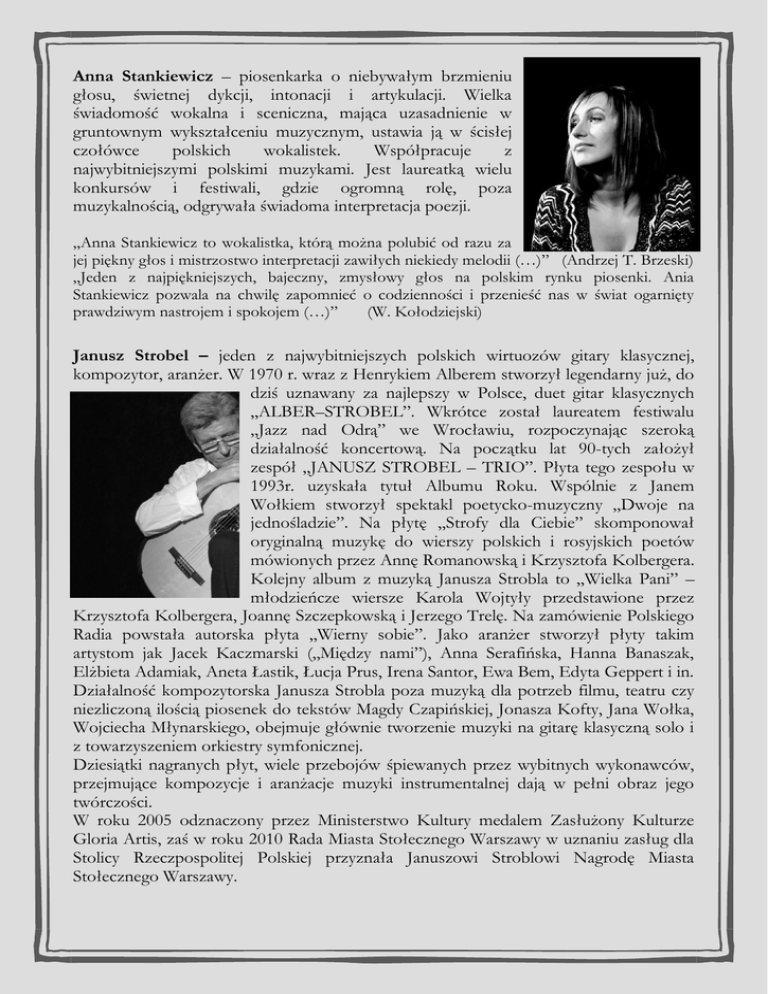 Anna Stankiewicz – piosenkarka o niebywałym brzmieniu głosu, świetnej dykcji, intonacji i artykulacji. Wielka świadomość wokalna i sceniczna, mająca uzasadnienie w gruntownym wykształceniu muzycznym, ustawia ją w ścisłej czołówce polskich wokalistek. Współpracuje z najwybitniejszymi polskimi muzykami. Jest laureatką wielu konkursów i festiwali, gdzie ogromną rolę, poza muzykalnością, odgrywała świadoma interpretacja poezji. „Anna Stankiewicz to wokalistka, którą można polubić od razu za jej piękny głos i mistrzostwo interpretacji zawiłych niekiedy melodii (…)” (Andrzej T. Brzeski) „Jeden z najpiękniejszych, bajeczny, zmysłowy głos na polskim rynku piosenki. Ania Stankiewicz pozwala na chwilę zapomnieć o codzienności i przenieść nas w świat ogarnięty prawdziwym nastrojem i spokojem (…)” (W. Kołodziejski) Janusz Strobel – jeden z najwybitniejszych polskich wirtuozów gitary klasycznej, kompozytor, aranżer. W 1970 r. wraz z Henrykiem Alberem stworzył legendarny już, do dziś uznawany za najlepszy w Polsce, duet gitar klasycznych „ALBER–STROBEL”. Wkrótce został laureatem festiwalu „Jazz nad Odrą” we Wrocławiu, rozpoczynając szeroką działalność koncertową. Na początku lat 90-tych założył zespół „JANUSZ STROBEL – TRIO”. Płyta tego zespołu w 1993r. uzyskała tytuł Albumu Roku. Wspólnie z Janem Wołkiem stworzył spektakl poetycko-muzyczny „Dwoje na jednośladzie”. Na płytę „Strofy dla Ciebie” skomponował oryginalną muzykę do wierszy polskich i rosyjskich poetów mówionych przez Annę Romanowską i Krzysztofa Kolbergera. Kolejny album z muzyką Janusza Strobla to „Wielka Pani” – młodzieńcze wiersze Karola Wojtyły przedstawione przez Krzysztofa Kolbergera, Joannę Szczepkowską i Jerzego Trelę. Na zamówienie Polskiego Radia powstała autorska płyta „Wierny sobie”. Jako aranżer stworzył płyty takim artystom jak Jacek Kaczmarski („Między nami”), Anna Serafińska, Hanna Banaszak, Elżbieta Adamiak, Aneta Łastik, Łucja Prus, Irena Santor, Ewa Bem, Edyta Geppert i in. Działalność kompozytorska Janusza Strobla poza muzyką dla potrzeb filmu, teatru czy niezliczoną ilością piosenek do tekstów Magdy Czapińskiej, Jonasza Kofty, Jana Wołka, Wojciecha Młynarskiego, obejmuje głównie tworzenie muzyki na gitarę klasyczną solo i z towarzyszeniem orkiestry symfonicznej. Dziesiątki nagranych płyt, wiele przebojów śpiewanych przez wybitnych wykonawców, przejmujące kompozycje i aranżacje muzyki instrumentalnej dają w pełni obraz jego twórczości. W roku 2005 odznaczony przez Ministerstwo Kultury medalem Zasłużony Kulturze Gloria Artis, zaś w roku 2010 Rada Miasta Stołecznego Warszawy w uznaniu zasług dla Stolicy Rzeczpospolitej Polskiej przyznała Januszowi Stroblowi Nagrodę Miasta Stołecznego Warszawy. _____________________________________________________ Andrzej Jagodziński – pianista, kompozytor i aranżer. Absolwent Akademii Muzycznej im. F. Chopina w Warszawie. W swojej dotychczasowej karierze koncertował niemal na całym świecie. W roku 1993 stworzył zespół Andrzej Jagodziński Trio. W roku 1994 ukazała się płyta Tria „CHOPIN”, która uznana została przez czytelników pisma Jazz Forum za płytę roku 1994, otrzymała nagrodę Polskiego Przemysłu Muzycznego – Fryderyk '94 oraz laur Melomani '94 – nagrodę łódzkiego Stowarzyszenia Miłośników Muzyki Jazzowej. W roku 2005 Andrzej Jagodziński został uhonorowany przez Ministra Kultury Brązowym Medalem „Zasłużony Kulturze GLORIA ARTIS”. Adam Cegielski – kontrabasista, absolwent Akademii Muzycznej im. F. Chopina w Warszawie. Prowadzi klasę kontrabasu na Wydziale Jazzu w Zespole Państwowych Szkół Muzycznych im. F. Chopina w Warszawie, gdzie od roku 2005 pełni także funkcję wicedyrektora do spraw kształcenia jazzowego. Czesław „Mały” Bartkowski - perkusista jazzowy, legenda polskiej sceny jazzowej. Aktywną działalność koncertową prowadzi nieprzerwanie od 1960r., kiedy to debiutował w „Far Quartet” Jerzego Pakulskiego. W swojej karierze grał w zespołach m.in.: Krzysztofa Komedy, Zbigniewa Namysłowskiego, Czesława Niemena, Tomasza Stańko, Adama Makowicza, Michała Urbaniaka i Urszuli Dudziak, Wojtka Karolaka, Jana Ptaszyna Wróblewskiego i Henryka Majewskiego. Pracował też z takimi muzykami, jak: Art. Farmer, Ben Webster, Clark Terry, Aladar Pege. Występował niemal na wszystkich ważniejszych festiwalach jazzowych na świecie: Newport, Pori, Montreux, The North See, The Berliner Jazz Tage, Molde, The New York Jazz Festival, Tauranga, Comblain La Tour, India Jazz Festival i wiele innych. Od 1993 wykładowca w klasie perkusji i kierownik Wydziału Jazzu w Zespole Państwowych Szkół Muzycznych im. F. Chopina oraz Studium Jazzowego w Warszawie. Honorowy Członek „Tauranga Jazz Festival Society” oraz „The New Orleans Clubs New Castle on Tyne England”. Zasłużony Działacz Kultury; laureat Nagrody Indywidualnej I Stopnia za Szczególny Wkład w Rozwój Edukacji Artystycznej w Polsce. _____________________________________________________ Jonasz Kofta – pisarz, satyryk; współzałożyciel kabaretów Hybrydy (1962) i Pod Egidą (1968), od 1968 współpracownik Polskiego Radia i Telewizji, współtwórca m.in. cyklicznych radiowych audycji satyrycznych. Ilustrowany tygodnik rozrywki; autor popularnych tekstów piosenek, utrzymanych zwykle w liryczno-nostalgicznej tonacji (m.in. Kwiat jednej nocy 1969- I nagroda na Festiwalu Piosenki Polskiej w Opolu, Pamiętajcie o ogrodach), często we własnym wykonaniu; satyry, wiersze (Na wszystkich dworcach świata 1989), utwory dramatyczne (Wojna chłopska, wyst. 1979), libretta musicali. Jan Wołek - pisarz, pieśniarz, malarz. Studiował filozofię. Dwukrotny zwycięzca Studenckiego Festiwalu Piosenki w Krakowie. Jako malarz – autor kilkudziesięciu wystaw indywidualnych. Odznaczony Krzyżem