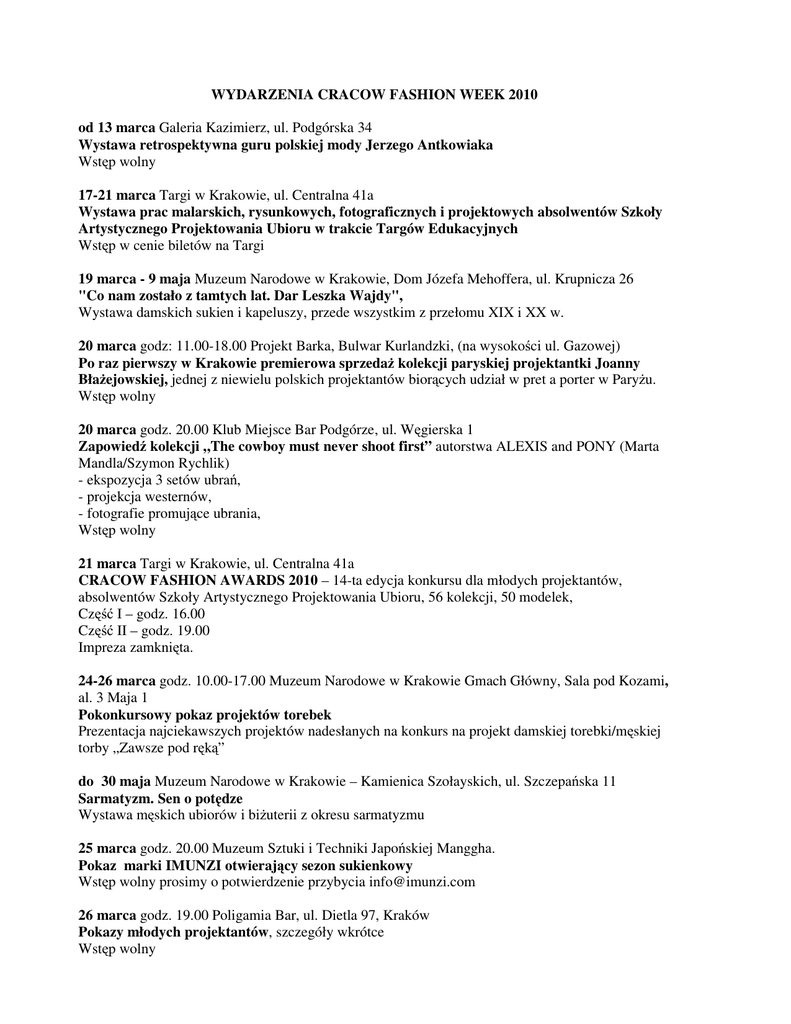 WYDARZENIA CRACOW FASHION WEEK 2010 od 13 marca Galeria Kazimierz, ul. Podgórska 34 Wystawa retrospektywna guru polskiej mody Jerzego Antkowiaka Wstęp wolny 17-21 marca Targi w Krakowie, ul. Centralna 41a Wystawa prac malarskich, rysunkowych, fotograficznych i projektowych absolwentów Szkoły Artystycznego Projektowania Ubioru w trakcie Targów Edukacyjnych Wstęp w cenie biletów na Targi 19 marca - 9 maja Muzeum Narodowe w Krakowie, Dom Józefa Mehoffera, ul. Krupnicza 26 "Co nam zostało z tamtych lat. Dar Leszka Wajdy", Wystawa damskich sukien i kapeluszy, przede wszystkim z przełomu XIX i XX w. 20 marca godz: 11.00-18.00 Projekt Barka, Bulwar Kurlandzki, (na wysokości ul. Gazowej) Po raz pierwszy w Krakowie premierowa sprzedaż kolekcji paryskiej projektantki Joanny Błażejowskiej, jednej z niewielu polskich projektantów biorących udział w pret a porter w Paryżu. Wstęp wolny 20 marca godz. 20.00 Klub Miejsce Bar Podgórze, ul. Węgierska 1 Zapowiedź kolekcji „The cowboy must never shoot first” autorstwa ALEXIS and PONY (Marta Mandla/Szymon Rychlik) - ekspozycja 3 setów ubrań, - projekcja westernów, - fotografie promujące ubrania, Wstęp wolny 21 marca Targi w Krakowie, ul. Centralna 41a CRACOW FASHION AWARDS 2010 – 14-ta edycja konkursu dla młodych projektantów, absolwentów Szkoły Artystycznego Projektowania Ubioru, 56 kolekcji, 50 modelek, Część I – godz. 16.00 Część II – godz. 19.00 Impreza zamknięta. 24-26 marca godz. 10.00-17.00 Muzeum Narodowe w Krakowie Gmach Główny, Sala pod Kozami, al. 3 Maja 1 Pokonkursowy pokaz projektów torebek Prezentacja najciekawszych projektów nadesłanych na konkurs na projekt damskiej torebki/męskiej torby „Zawsze pod ręką” do 30 maja Muzeum Narodowe w Krakowie – Kamienica Szołayskich, ul. Szczepańska 11 Sarmatyzm. Sen o potędze Wystawa męskich ubiorów i biżuterii z okresu sarmatyzmu 25 marca godz. 20.00 Muzeum Sztuki i Techniki Japońskiej Manggha. Pokaz marki IMUNZI otwierający sezon sukienkowy Wstęp wolny prosimy o potwierdzenie przybycia [email protected] 26 marca godz. 19.00 Poligamia Bar, ul. Dietla 97, Kraków Pokazy młodych projektantów, szczegóły wkrótce Wstęp wolny 27 marca godz. 15.00 centrum handlowe Galeria Kazimierz, ul. Podgórska 34 Pokazy kolekcji firmowych oraz kolekcji nagrodzonej przez Galerię Kazimierz podczas CFA Wstęp wolny 27 marca godz. 19.00 Hotel Stary, ul. Szczepańska 5, Kraków Pokazy mody Concept Store Apoteoza z Katowic i Concept Store Kreatura z Krakowa Impreza zamknięta