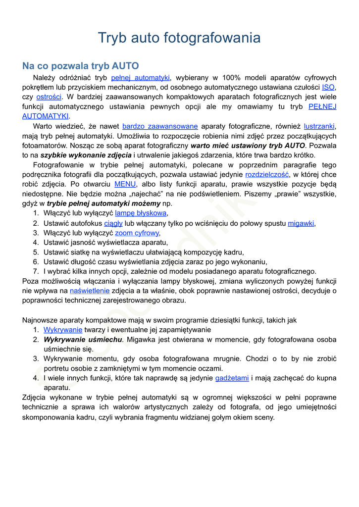 Tryb auto fotografowania Na co pozwala tryb AUTO or ad ni k. pl Należy odróżniać tryb pełnej automatyki, wybierany w 100% modeli aparatów cyfrowych pokrętłem lub przyciskiem mechanicznym, od osobnego automatycznego ustawiana czułości ISO, czy ostrości. W bardziej zaawansowanych kompaktowych aparatach fotograficznych jest wiele funkcji automatycznego ustawiania pewnych opcji ale my omawiamy tu tryb PEŁNEJ AUTOMATYKI. Warto wiedzieć, że nawet bardzo zaawansowane aparaty fotograficzne, również lustrzanki, mają tryb pełnej automatyki. Umożliwia to rozpoczęcie robienia nimi zdjęć przez początkujących fotoamatorów. Nosząc ze sobą aparat fotograficzny warto mieć ustawiony tryb AUTO. Pozwala to na szybkie wykonanie zdjęcia i utrwalenie jakiegoś zdarzenia, które trwa bardzo krótko. Fotografowanie w trybie pełnej automatyki, polecane w poprzednim paragrafie tego podręcznika fotografii dla początkujących, pozwala ustawiać jedynie rozdzielczość, w której chce robić zdjęcia. Po otwarciu MENU, albo listy funkcji aparatu, prawie wszystkie pozycje będą niedostępne. Nie będzie można „najechać” na nie podświetleniem. Piszemy „prawie” wszystkie, gdyż w trybie pełnej automatyki możemy np. 1. Włączyć lub wyłączyć lampę błyskowa, 2. Ustawić autofokus ciągły lub włączany tylko po wciśnięciu do połowy spustu migawki, 3. Włączyć lub wyłączyć zoom cyfrowy, 4. Ustawić jasność wyświetlacza aparatu, 5. Ustawić siatkę na wyświetlaczu ułatwiającą kompozycję kadru, 6. Ustawić długość czasu wyświetlania zdjęcia zaraz po jego wykonaniu, 7. I wybrać kilka innych opcji, zależnie od modelu posiadanego aparatu fotograficznego. Poza możliwością włączania i wyłączania lampy błyskowej, zmiana wyliczonych powyżej funkcji nie wpływa na naświetlenie zdjęcia a ta właśnie, obok poprawnie nastawionej ostrości, decyduje o poprawności technicznej zarejestrowanego obrazu. fo to p Najnowsze aparaty kompaktowe mają w swoim programie dziesiątki funkcji, takich jak 1. Wykrywanie twarzy i ewentualne jej zapamiętywanie 2. Wykrywanie uśmiechu. Migawka jest otwierana w momencie, gdy fotografowana osoba uśmiechnie się. 3. Wykrywanie momentu, gdy osoba fotografowana mrugnie. Chodzi o to by nie zrobić portretu osobie z zamkniętymi w tym momencie oczami. 4. I wiele innych funkcji, które tak naprawdę są jedynie gadżetami i mają zachęcać do kupna aparatu. Zdjęcia wykonane w trybie pełnej automatyki są w ogromnej większości w pełni poprawne technicznie a sprawa ich walorów artystycznych zależy od fotografa, od jego umiejętności skomponowania kadru, czyli wybrania fragmentu widzianej gołym okiem sceny.