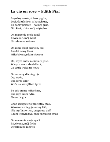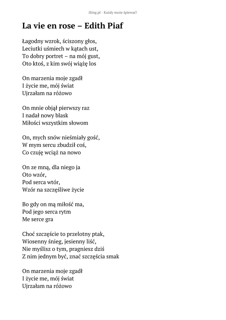 iSing.pl - Każdy może śpiewać! La vie en rose – Edith Piaf Łagodny wzrok, ściszony głos, Leciutki uśmiech w kątach ust, To dobry portret – na mój gust, Oto ktoś, z kim swój wiążę los On marzenia moje zgadł I życie me, mój świat Ujrzałam na różowo On mnie objął pierwszy raz I nadał nowy blask Miłości wszystkim słowom On, mych snów nieśmiały gość, W mym sercu zbudził coś, Co czuję wciąż na nowo On ze mną, dla niego ja Oto wzór, Pod serca wtór, Wzór na szczęśliwe życie Bo gdy on mą miłość ma, Pod jego serca rytm Me serce gra Choć szczęście to przelotny ptak, Wiosenny śnieg, jesienny liść, Nie myślisz o tym, pragniesz dziś Z nim jednym być, znać szczęścia smak On marzenia moje zgadł I życie me, mój świat Ujrzałam na różowo On mnie objął pierwszy raz I nadał nowy blask Miłości wszystkim słowom On, mych snów nieśmiały gość, W mym sercu zbudził coś, Co czuję wciąż na nowo On ze mną, dla niego ja Oto wzór, Pod serca wtór, Wzór na szczęśliwe życie Bo gdy on mą miłość ma, Pod jego serca rytm Me serce gra Słowa: brak danych Muzyka: brak danych Rok wydania: brak danych Płyta: brak danych
