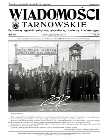 1 Tarnów, październik 2012 r. 30 Redakcja i Administracja: Urząd Miasta Tarnowa, Wydział Marki Miasta, ul. Rynek 7, 33-100 Tarnów Szanowni Państwo! W tym roku mija 85 lat od chwili, gdy zapadła decyzja o budowie Państwowej Fabryki Związków Azotowych. Przedsiębiorstwa powstałego nieopodal Tarnowa, które – jak pokazała historia – miało ogromny wpływ na przyszłość miasta, regionu i wszystkich mieszkańców. W swych 85-letnich dziejach Zakłady Azotowe w Tarnowie-Mościcach S.A. – bo taką oficjalnie nazwę nosi dziś nasza firma – przeżywały, podobnie jak polska gospodarka, różne koleje losu. Ale dzięki swoim Pracownikom i ich pracy zwycięsko przeszły przez wszelkie dziejowe burze. Dziś nasza firma – notowana na warszawskiej Giełdzie Papierów Wartościowych – to firma nowoczesna i silna, odgrywająca ważną rolę na rynku europejskim. Firma, z której możemy być dumni! Zapraszamy zatem do włączenia się w obchody Jubileuszu 85-lecia. Świętujmy razem tę wyjątkową rocznicę! Zarząd Zakładów Azotowych w Tarnowie-Mościcach S.A. Redakcja, skład i łamanie: Wydział Marki Miasta, ul. Rynek 7, 33-100 Tarnów. Teksty: Robert Lichwała, Korporacyjne Biuro PR Azoty Tarnów, fotografie udostępniły Zakłady Azotowe w Tarnowie-Mościcach S.A. 2 Godni następcy wielkich idei Azoty Tarnów są jedną z największych firm chemicznych w Polsce. Wraz ze spółkami zależnymi tworzy największą Grupę Kapitałową sektora Wielkiej Syntezy Chemicznej. Grupa Kapitałowa Azoty Tarnów jest jednym z kluczowych europejskich podmiotów branży chemicznej w sektorze tworzyw konstrukcyjnych, kaprolaktamu, nawozów azotowych i wieloskładnikowych, a także alkoholi OXO i plastyfikatorów. Zajmuje wysokie, piąte miejsce w gronie europejskich producentów poliamidów i jest jedynym polskim producentem polioksymetylenu oraz należy do czołówki producentów nawozów mineralnych na terenie Unii Europejskiej. Gra o rozwój Niewiele jest firm, które mogą poszczycić się tak niezwykłą historią, tak wielką hossą teraźniejszości i tak wspaniałymi perspektywami na przyszłość. A wszystko zaczęło się 85 lat temu, kiedy decyzję o budowie Państwowej Fabryki Związków Azotowych podjął sam ówczesny prezydent II Rzeczypospolitej Ignacy Mościcki. Obejmując najwyższy urząd w państwie, był już znanym i cenionym uczonym chemikiem, profesorem na Politechnice Lwowskiej i Warszawskiej. Jako pierwszy zastosował metodę pozyskiwania azotu z powietrza na skalę przemysłową do produkcji kwasu azotowego. Tym bardziej oczywista staje się jego decyzja z marca 1927 powołująca do życia tarnowską fabrykę. II Rzeczpospolita, kraj zdecydowanie rolniczy, potrzebowała nowoczesnych nawozów, by uniezależnić się od kosztownego importu. Już wkrótce Państwowa Fabryka Związków Azotowych zaczęła dostarczać pierwsze nawozy azotowo-fosforowe, a także nitrofos, siarczan amonowy. Choć wielki kryzys zapoczątkowany w czarny czwartek na nowojorskiej giełdzie dotarł także do Polski i sprzedaż nawozów spadła, firma postawiła na rozwój i zdecydowała się na dywersyfikację produkcji. Już w 1932 roku uruchomiła nową linię saletry wapniowej, dzięki której podbiła tak odległe rynki jak Chiny i Japonia. Twórcą tego spektakularnego sukcesu był inżynier Eugeniusz Kwiatkowski, wicepremier i minister skarbu, minister przemysłu i handlu, pomysłodawca Centralnego Okręgu Przemysłowego i budowniczy portu Gdyni, a w latach 1931-1935 dyrektor Państwowej Fabryki Związków Azotowych w Tarnowie-Mościcach. Zakłady Azotowe w Tarnowie-Mościcach mają wszelkie dane po temu, by uważać się za spółkę sukcesu. Od 2008 roku notowane na Giełdzie Papierów Wartościowych, rozbudowują swój potencjał poprzez inkorporację spółek chemicznych. W 2010 r. nabyły 100 proc. udziałów niemieckiej spółki działającej obecnie pod nazwą ATT Polymers GmbH oraz 52,62 proc. akcji ZAK S.A., a w roku 2011 – 66 proc. akcji Z.Ch. „Police” S.A. oraz 40,86 proc. akcji ZAK S.A. Dzięki temu Grupa mogła m.in. zwiększyć asortyment produktów i zdolności produkcyjne, a także zyskać dostęp do nowych rynków zbytu i kanałów dystrybucji. Efektem są doskonałe wyniki finansowe Grupy: za 2011 rok przychody wyniosły 5 mld 338 mln 029 tys. zł, a zysk netto 498 mln 941 tys. zł. Produkty i półprodukty Spółek Grupy cieszą się wysokim uznaniem odbiorców z wielu branż. Synergiczne współdziałanie jednostek wchodzących w skład Grupy Kapitałowej dzięki przeprowadzonej konsolidacji, decyduje i decydować będzie o dalszej jej skuteczności na wymagającym współczesnym rynku. Branża wciąż się rozwija, a produkty przemysłu chemicznego znajdują coraz to nowe zastosowania. Azoty Tarnów na bieżąco śledzą zmiany na rynku, elastycznie reagują na potrzeby klientów i dbają o innowacyjność produktów. Gra o przyszłość Grupa stawia sobie wyłącznie ambitne cele. Przed upływem dekady będzie notowana w podstawowym indeksie Giełdy Papierów Wartościowych, zapewni Akcjonariuszom jeden z najwyższych w branży zwrot z powierzonego kapitału i utrzyma pozycję jednego z trzech największych producentów nawozów na europejskim rynku. Szansę na realizację tych zamierzeń Grupa widzi w zwiększeniu skali operacji prowadzonych w obszarach działalności biznesowej, zarówno poprzez rozwój wewnętrzny, jak i alianse, fuzje i akwizycje w Polsce i poza granicami kraju. W tę strategię doskonale wpisuje się planowane połączenie Grupy Kapitałowej Azoty Tarnów z liczącym się producentem nawozów azotowych i chemikaliów, Zakładami Azotowymi „Puławy” S.A. Konsolidacja doprowadzi do umocnienia Grupy, która ma szansę stać się jednym z największych podmiotów w branży chemicznej na rynku europejskim. To z pewnością scenariusz, który chętnie widzieliby twórcy Azotów Tarnów: Ignacy Mościcki, Eugeniusz Kwiatkowski i Tadeu