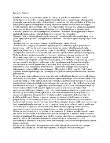 Szanowni Państwo. Zgodnie z zasadą, że wyłączność prawa do rzeczy, w tym do ich wizerunku i treści intelektualnych, może być w części ograniczona interesem społecznym, np. udostępniania wizerunku muzealiów do celów edukacyjnych czy naukowych, Muzeum Pałac w Wilanowie realizuje nieodpłatne udostępnianie wiedzy za pośrednictwem mediów elektronicznych (wortal muzeum) dla wszystkich odbiorców. Wprowadza również inne usługi elektroniczne przeznaczone dla szerokiego grona odbiorców tzw. e-usługi (sklep z wydawnictwami, IIIGuide - aplikacja do zwiedzania pałacu, Edumatic - platforma edukacyjna umożliwiająca zdalne szkolenia on-line, Forum Edukatorów Muzealnych, Fotokody). Muzeum Pałac w Wilanowie udostępnia wizerunki i treści intelektualne rozróżniając cel w jakim będą wykorzystane. Udostępnianie wizerunków i treści realizujemy najczęściej na dwa sposoby: - powszechny - na muzealnym wortalu, certyfikowanym źródle wiedzy, - kontrolowany - dotyczy wizerunków wysokiej jakości oraz treści wykorzystywanych komercyjnie - odbywa się poprzez zawarcie stosownej umowy określającej cel, pola eksploatacji oraz koszty udostępnienia i praw do publikacji. Często jedynym warunkiem udostępnienia jest przekazanie do biblioteki muzeum egzemplarza książki lub pisanej pracy. Niekontrolowany dostęp do zasobów cyfrowych i informacji stwarza możliwości do nieuprawnionego i nieetycznego wykorzystywania danych. Właściciel dzieła ponosi wszystkie koszty związane z jego utrzymaniem, przy czym nakłady na digitalizację są tylko nieznacznym ich ułamkiem, a pobierając opłaty za udostępnianie komercyjne zasobów rekompensuje wysokość ponoszonych nakładów. Przy tej okazji należy zaznaczyć, że szacunkowy koszt pozyskania, przetwarzania i zachowania jednego pliku wzorcowej dokumentacji cyfrowej 2D (wektor, bitmapa) i 3D wyniósł w 2012 roku 25,49 zł. Kwoty uzyskane za udostępnianie plików cyfrowych służą jedynie zmniejszeniu obciążeń finansów publicznych. Otwarcie danych do pełnego obrotu podważa wiarygodność tych danych poprzez eliminację możliwości ich certyfikacji. Wprowadzenie nieodpłatnego dostępu przez Internet do dużych ilości danych (a nie tylko danych selekcjonowanych, najistotniejszych z punktu widzenia ich udostępnienia) stanie się dodatkowym zadaniem dla muzeum, nie tylko bardzo kosztownym, ale też konkurencyjnym do wypełniania podstawowych obowiązków statutowych instytucji. Generowanie dodatkowych kosztów będzie związane z koniecznością budowy lub przebudowy architektury informatycznej i utrzymaniem udostępniania na zewnątrz danych, które do tej pory funkcjonowały głównie w obrocie wewnętrznym instytucji i nie są do takiego udostępnienia przygotowane. W efekcie cele komercyjne będą finansowane ze środków publicznych. Muzea zostaną wyłączone ze sfery rozwoju i konkurencyjności gospodarczej, dodatkowo będąc zobowiązane do finansowania komercyjnych działań bez udziału w ich zyskach. Inaczej mówiąc: koszty będą obciążały finanse publiczne, korzyści zaś będą uzyskiwały podmioty inne (w tym prywatne), mając pełną ochronę swoich produktów wytworzonych w oparciu o zasoby publiczne. Działanie takie byłoby równoznaczne z zaprzepaszczeniem ogromnego potencjału rozwojowego instytucji muzealnych. Można się spodziewać, że w przypadku pełnego dostępu do danych wysokiej jakości mogą one zostać wykorzystane w nieodpowiedni sposób, szczególnie w zakresie bezpieczeństwa zasobów muzealnych. Istnieje również bardzo poważne zagrożenie wystąpienia negatywnych skutków, takich jak brak poszanowania dla wzorców i norm kulturowych czy też nadszarpnięcie wizerunku instytucji kultury (budowanego w świadomości społecznej czasami przez pokolenia). Zakres upowszechniania i udostępniania materiałów cyfrowych powinien być, naszym zdaniem, uzależniony od sposobu wykorzystania (w podziale na niekomercyjny i komercyjny), dlatego wprowadzenie zasady dowolnego wykorzystania wizerunków i opracowań autorskich w celach komercyjnych jest naszym zdaniem niekorzystne dla instytucji kultury. Uważamy, że wolny dostęp do danych cyfrowych jest jak najbardziej słuszny, ale na ściśle określonych zasadach i tylko do ich niekomercyjnego wykorzystania; powinien być traktowany jak każde inne wykorzystywanie publikacji z powołaniem się na źródło danych lub właściciela. Z poważaniem Waldemar Markiewicz Kierownik Działu Dokumentacji i Cyfryzacji Muzeum Pałacu w Wilanowie ul. St. Kostki Potockiego 10/16 02-958 Warszawa [email protected] tel. 22 5442 764