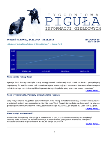 TYDZIEŃ NA RYNKU, 24.11.2014 - 28.11.2014 Nr 1/2014-15 2014-11-30 „Chciwość jest tylko odmianą krótkowidztwa.” – Henry Ford 2400 2350 2300 2250 2200 2015-01-05 2015-01-07 2015-01-08 2015-01-09 Fitch obniża rating Rosji Agencja Fitch Ratings obniżyła ocenę wiarygodności kredytowej Rosji z BBB do BBB- z perspektywą negatywną. To najniższa nota zaliczana do ratingów inwestycyjnych. Oznacza to, że ewentualna następna redukcja ratingu zepchnie rosyjskie aktywa do kategorii spekulacyjnej, potocznie zwanej „śmieciową”. Czytaj dalej... Ropa wyhamowała. Pomogły amerykańskie rezerwy Ceny ropy naftowej na giełdzie paliw w Nowym Jorku rosną. Inwestorzy oceniają, że wyprzedaż surowca w ostatnich dniach była przesadzona. Baryłka ropy West Texas Intermediate, w dostawach na luty, na giełdzie paliw NYMEX w Nowym Jorku, jest wyceniana po 49,65 USD, po zwyżce o 1 USD, czyli 2,1 proc. Czytaj dalej... Masz kredyt we frankach? W niedzielę Szwajcarzy zdecydują w referendum o tym, czy ich bank centralny ma zwiększyć rezerwy złota. Ryzyko, że wyniki zachwieją kursem franka, jest jednak niewielkie. Na rynek walutowy znacznie większy wpływ ma to, co dzieje się w USA. Czytaj dalej... 1 Efekt obrony franka. Rekordowe rezerwy SNB W grudniu rezerwy walutowe Szwajcarii wystrzeliły do rekordowego poziomu blisko 500 miliardów franków. To efekt obrony kursu krajowej waluty przez bank centralny. Kurs EUR/CHF (Bankier.pl) Czytaj dalej... Ukraina potrzebuje ponad 23 mld dolarów Potrzeby finansowe ukraińskiego budżetu w tym roku i następnym wyniosą jeszcze 23,2 mld USD ocenia JP Morgan w komentarzu z wtorkową datą. Dotychczas MFW, zachodnie rządy i instytucje finansowe wyasygnowały Ukrainie już 18 mld USD, co razem daje ok. 41 mld USD. Czytaj dalej... PKP Cargo szacuje, ile zyska na przejęciu czeskiego przewoźnika Advanced World Transport, czeski przewoźnik przejmowany przez PKP Cargo, zarobił w ubiegłym roku około 31 milionów euro zysku EBITDA - szacuje spółka. - Przejęcie wzmacnia strategiczną pozycję PKP Cargo w Europie Środkowej - komentuje Adam Purwin prezes zarządu. Czytaj dalej... Z bitcoinowej giełdy "wyparowało" 5 milionów dolarów We wtorek, 5 stycznia na stronie giełdy Bitstamp pojawiło się oświadczenie, że w poniedziałek portfele inwestorów mogły zostać okradzione. Wczoraj giełda oficjalnie przyznała się do straty prawie 19 tysięcy Bitcoinów, które były przechowywane w tak zwanym gorącym portfelu. Stanowi to 12 proc. aktywów giełdy. Czytaj dalej... Zachęcamy do rozwiązywania naszego Pigułowego Quizu!!! Odpowiedzi z nr 5/2014-15: 1) Francja; 2) Tonsil, Próchnik, Krosno, Kable, Exbud; 3) 3 września 1991 4) Skotan 5) TPSA, ELEKTRIM, PKN ORLEN; 6) 4,14 mld zł Zasady konkursu: o Zwycięzcą numeru zostaje osoba, która jako pierwsza udzieli poprawnych odpowiedzi na wszystkie pytania Quizu numeru. Zwycięzca numeru będzie ogłoszony w najbliższym kolejnym numerze. o Zwycięzcą roku zostaje osoba, która w ciągu całego roku akademickiego sumarycznie udzieli najwięcej prawidłowych odpowiedzi. Zwycięzca roku otrzyma nagrodę roku. o Zwycięzcą numeru 5/2014-15 został: Łukasz Kończyk Quiz numeru 6/2014-15 Redakcja: Kamil Pabijan2 powered by KOŁO NAUKOWE MODELOWANIA FINANSOWEGO